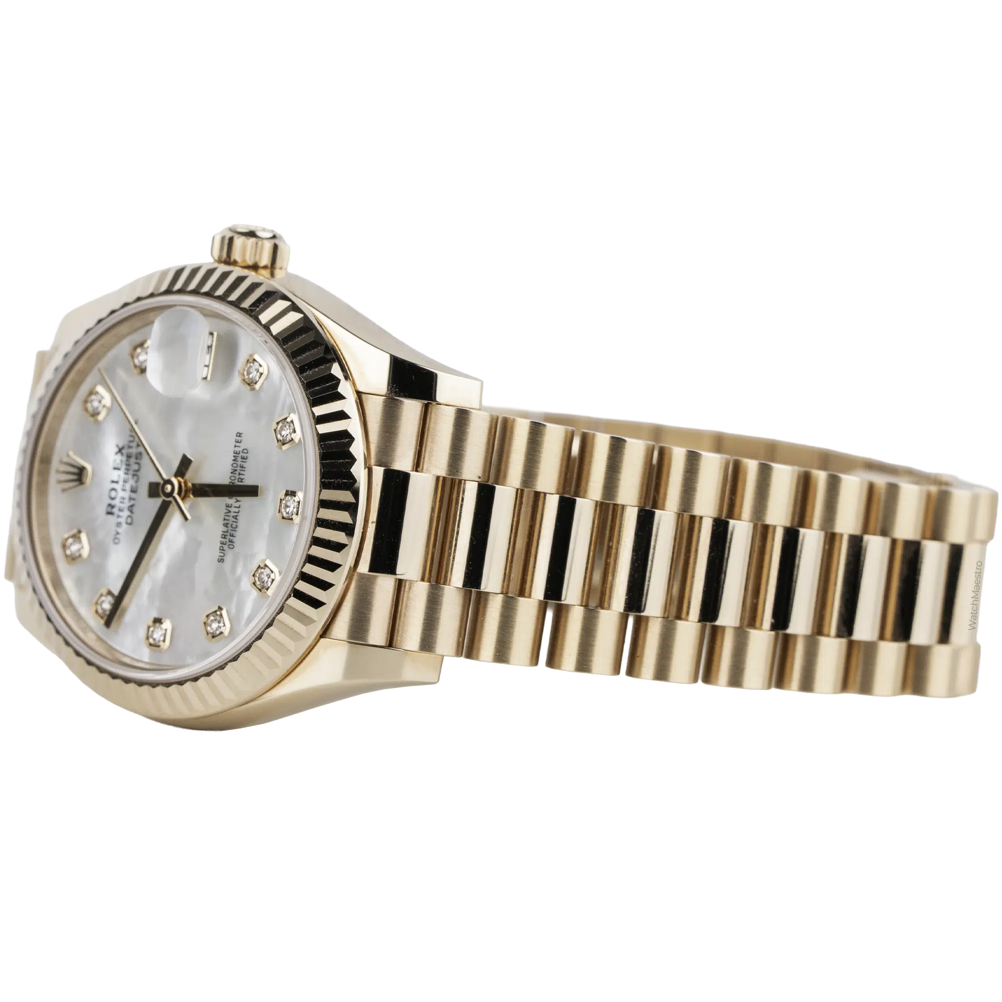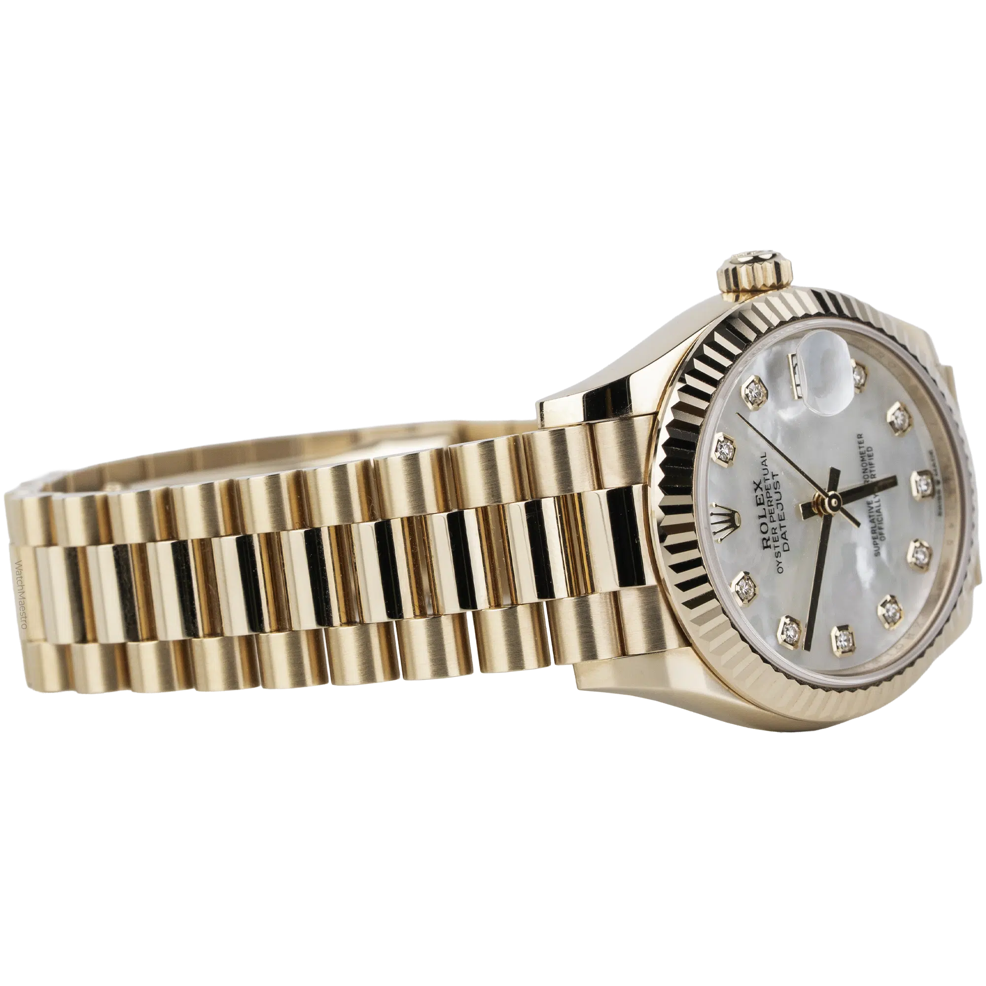 When you wear the Rolex Datejust 31, you instantly notice the solid weight of the gold. Not only does it feel substantial, but the President bracelet ensures comfort. In fact, it feels silky and smooth against the skin without pulling hair. Moreover, the Mother of Pearl dial catches the light as you move your hand. So, this causes a shift between soft white and faint pink clouds. At the same time, the diamonds give a sharp sparkle and produce an excellent contrast with the softer glow of the rose gold. So much so that wearing this Rolex Datejust 31 will give you a sense of confidence throughout the day.