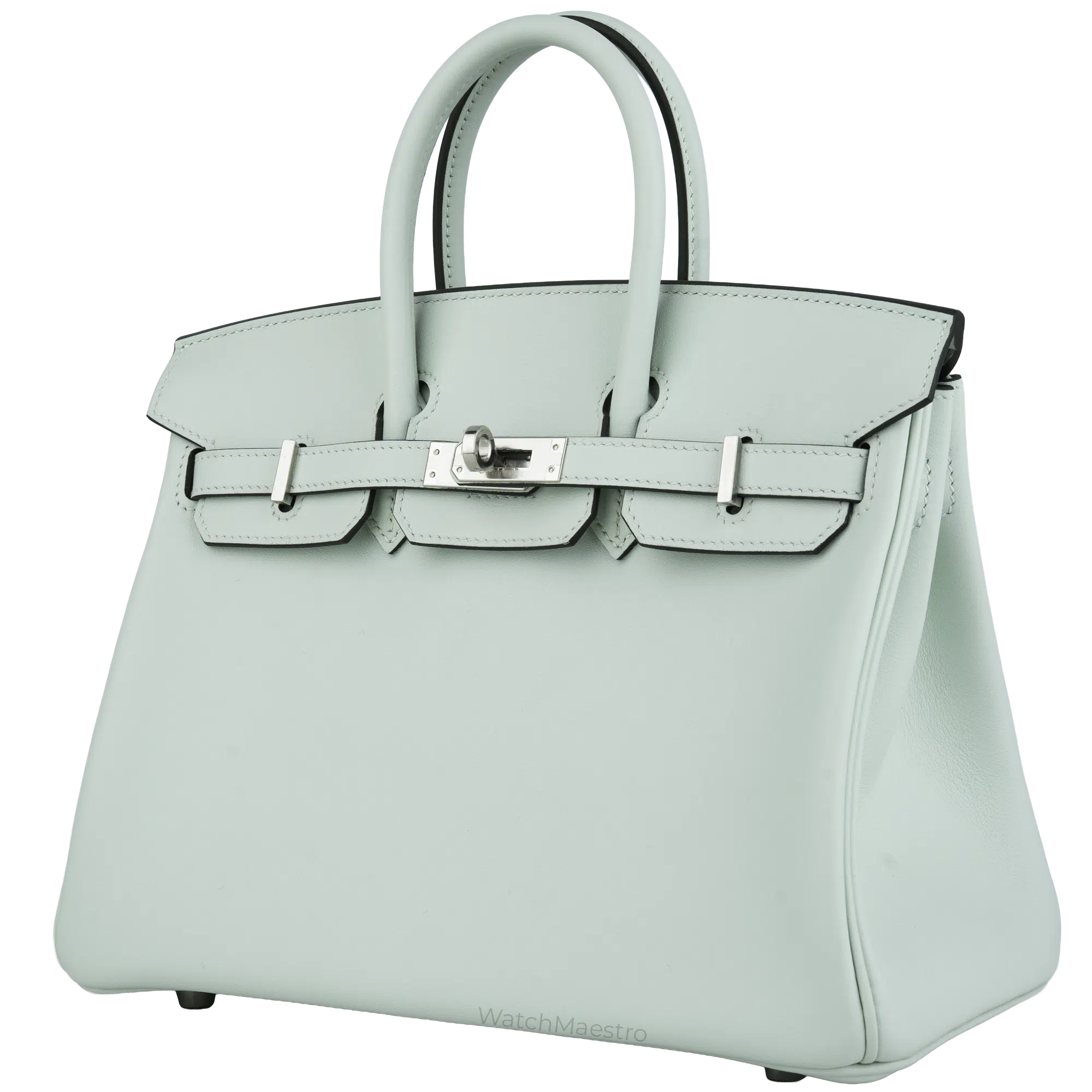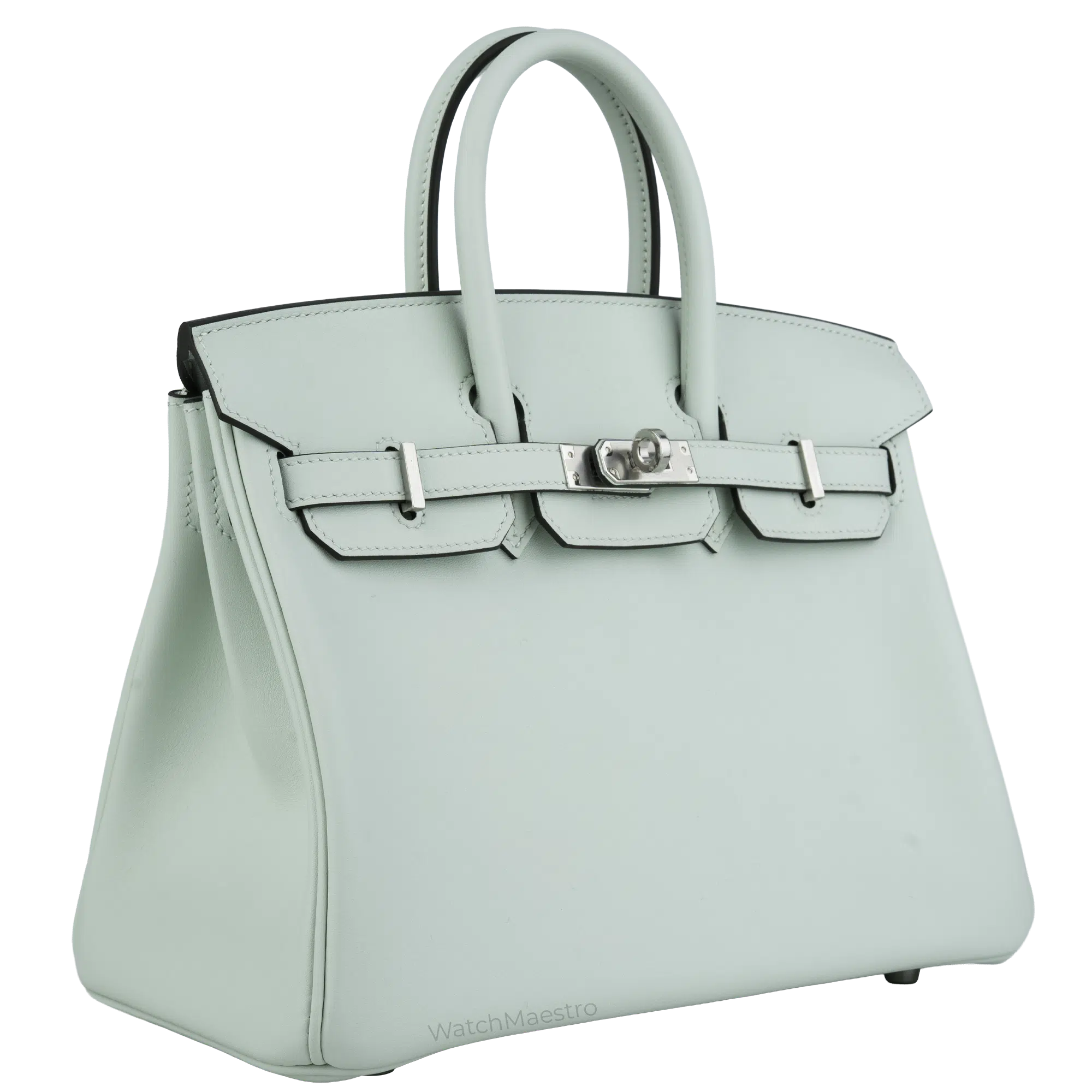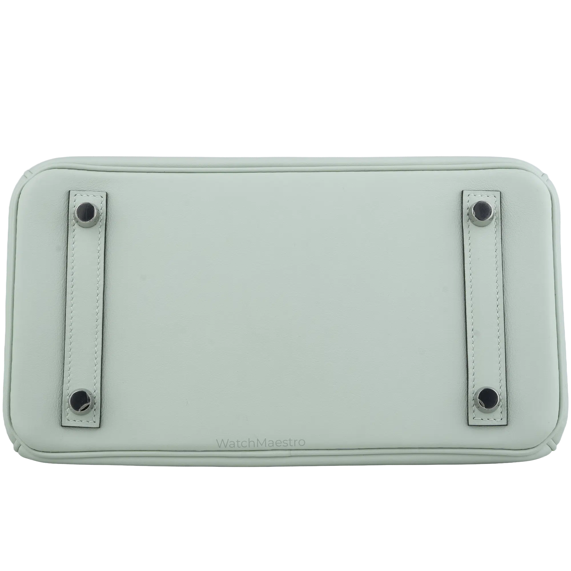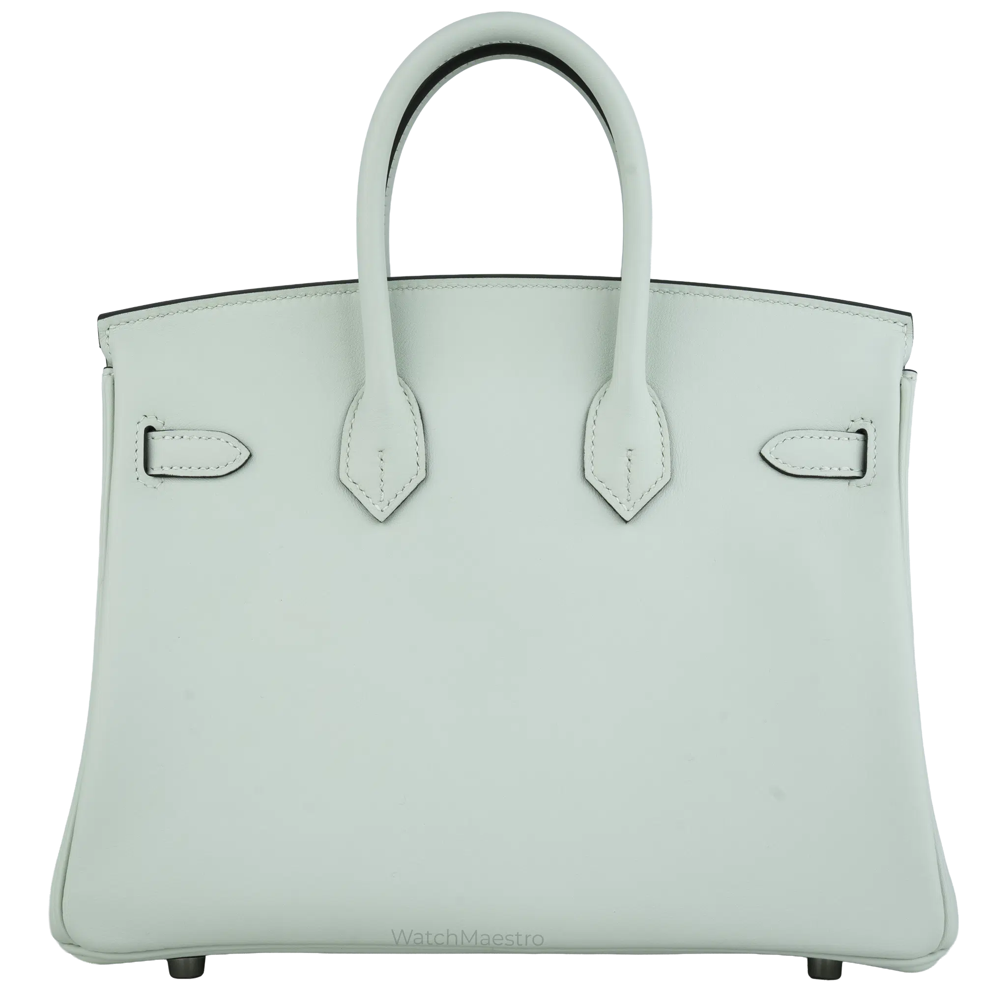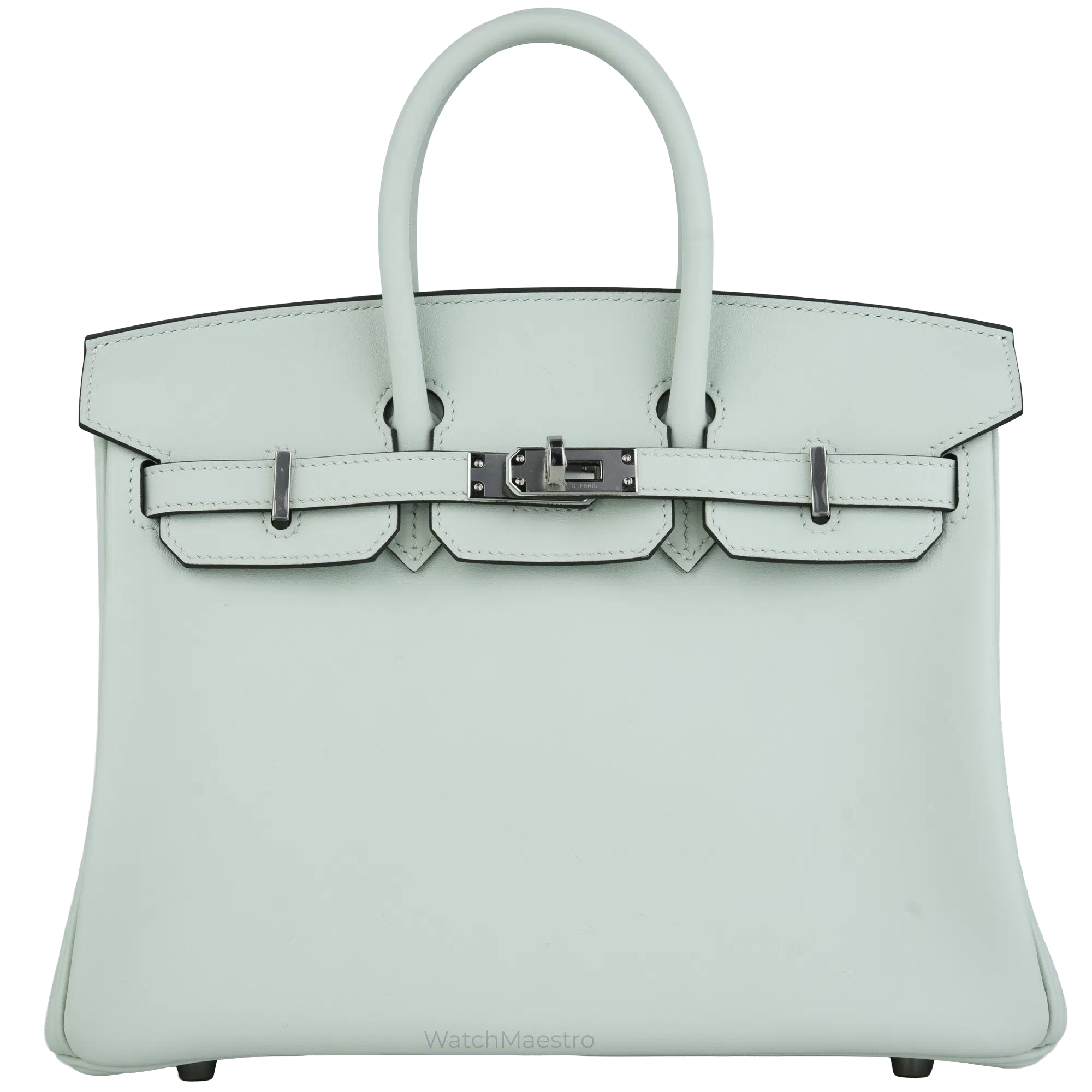 The Birkin 25 in Vert Peppermint is a 2025 model made from smooth Swift leather. The fine-grain material absorbs the pale mint green dye perfectly, creating a soft finish. It features shiny Palladium hardware, including the front turn-lock closure, metal plaques on the straps, and base studs. The bag measures 25cm in width. Tonal stitching aligns with the pastel green shade, while black edge paint highlights the cut of the leather flaps.