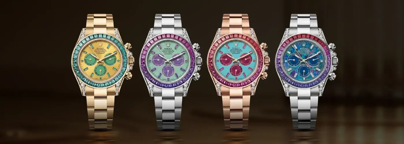 The new 4-piece off-catalog gem-set Daytona collection was introduced during Watches and Wonders Geneva in April 2026. You won’t find these watches on Rolex’s official website or in standard dealership brochures. These are off-catalog models, which means Rolex only offers them to top-tier VIP clients with massive purchase histories. Authorized dealers usually sell these timepieces together as a complete four-watch set rather than single units.