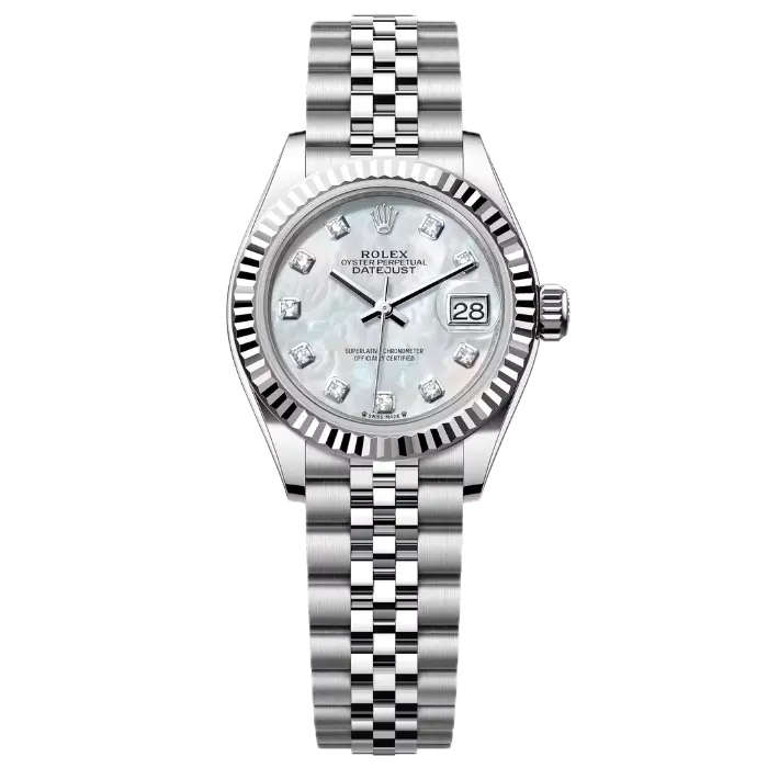 The 2026 Rolex Lady-Datejust, reference number 279174, is a magnificent luxury women’s watch available in unworn condition. When you look closely, the 28mm Oyster case made from solid steel pairs perfectly with the 18k white gold fluted bezel. But what makes this watch very unique and beautiful is the natural “mother of pearl” dial. No two dials are ever the same because the material comes from nature. Besides, the watch uses brilliant-cut diamond hour markers instead of normal numbers. These hour markers are set in small gold chatons to prevent tarnishing.