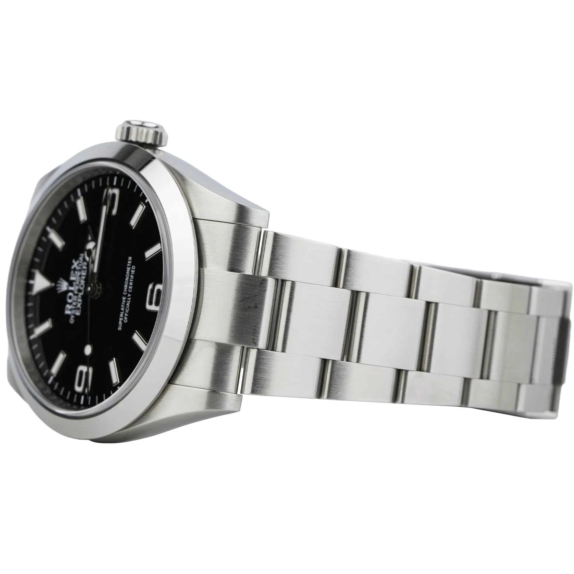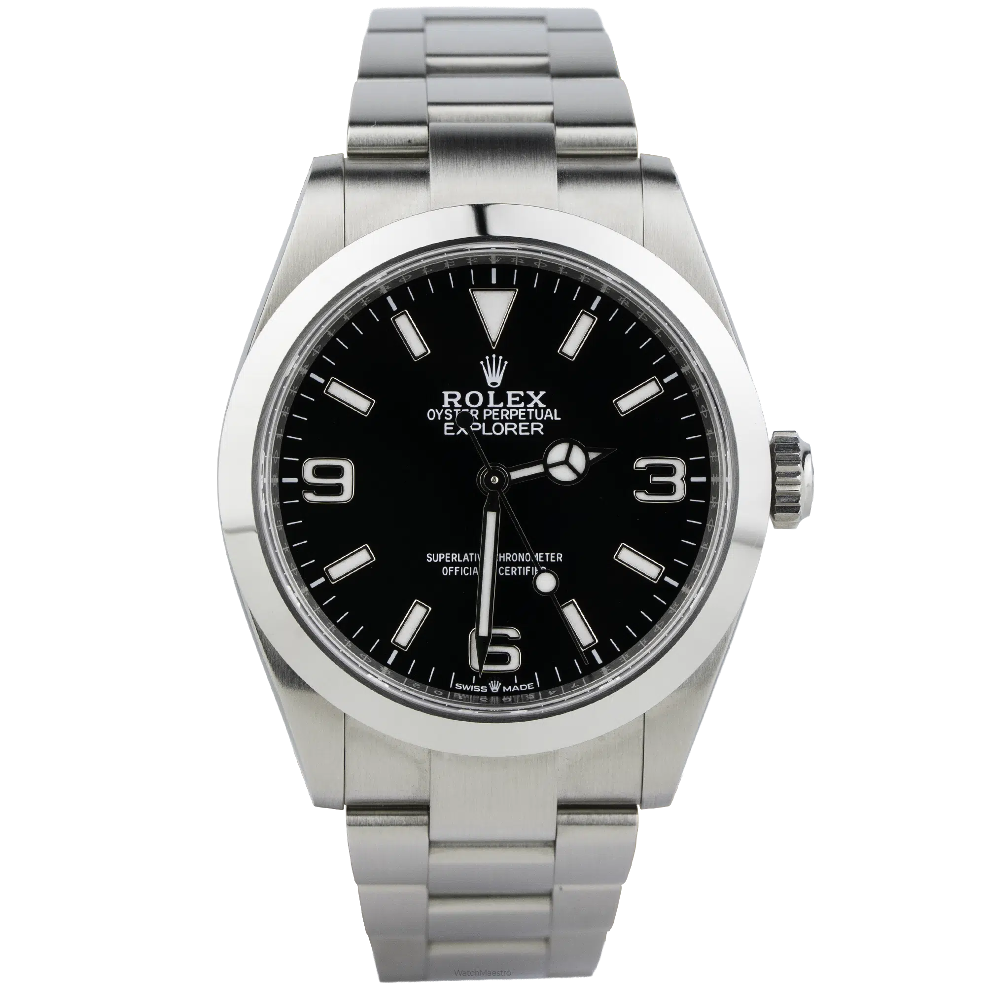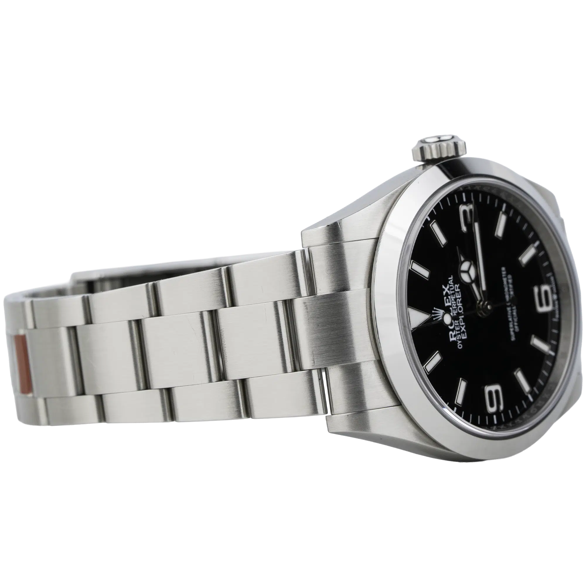 The 2025 Rolex Explorer is in like-new condition and comes as a complete set with the original box and papers. The reference number is 224270, and the 40mm case is made from solid Oystersteel, which is highly resistant to corrosion. The black lacquered dial has the signature 3, 6, and 9 numerals, and these markers have Chromalight fillings, so they glow a bright blue when the lights go down.