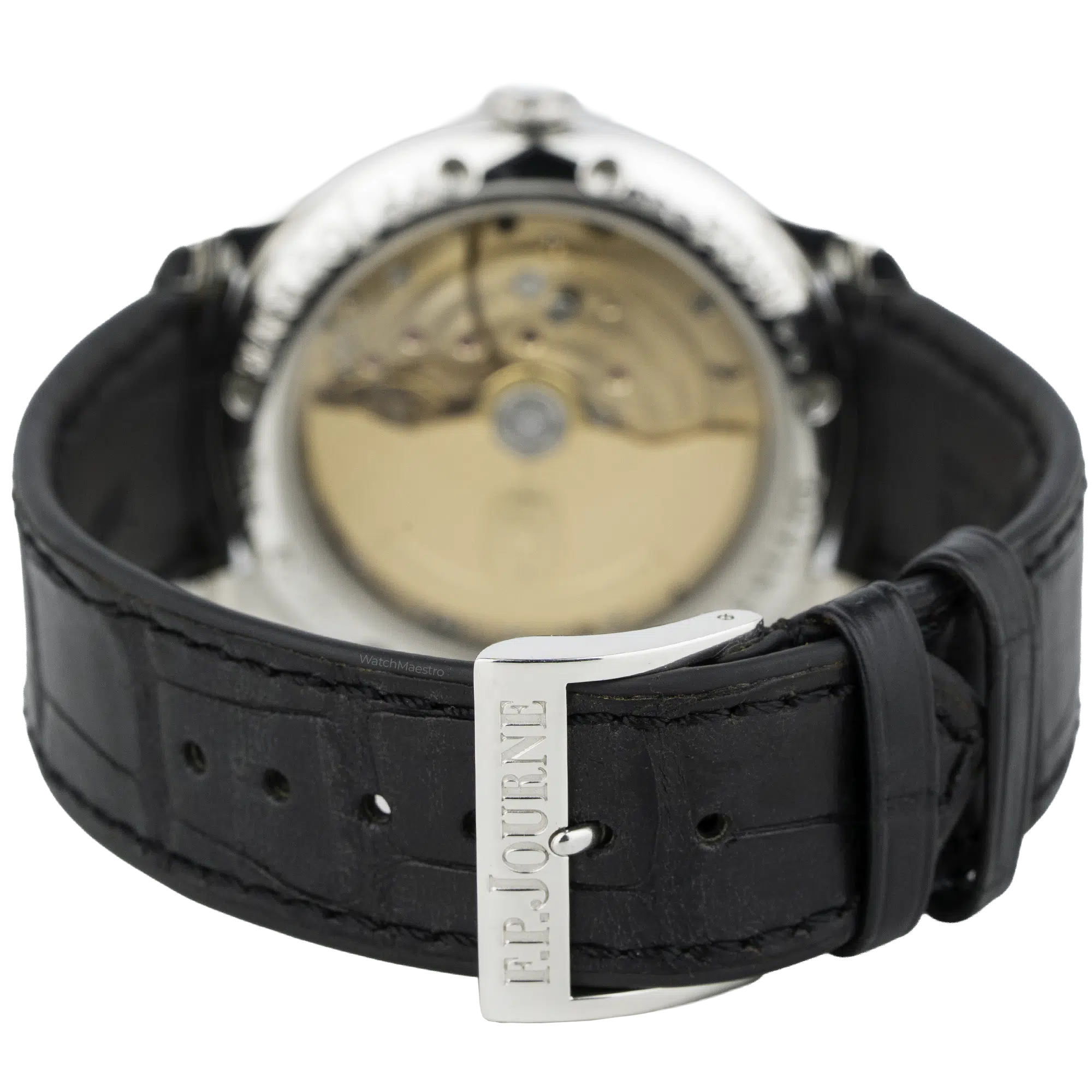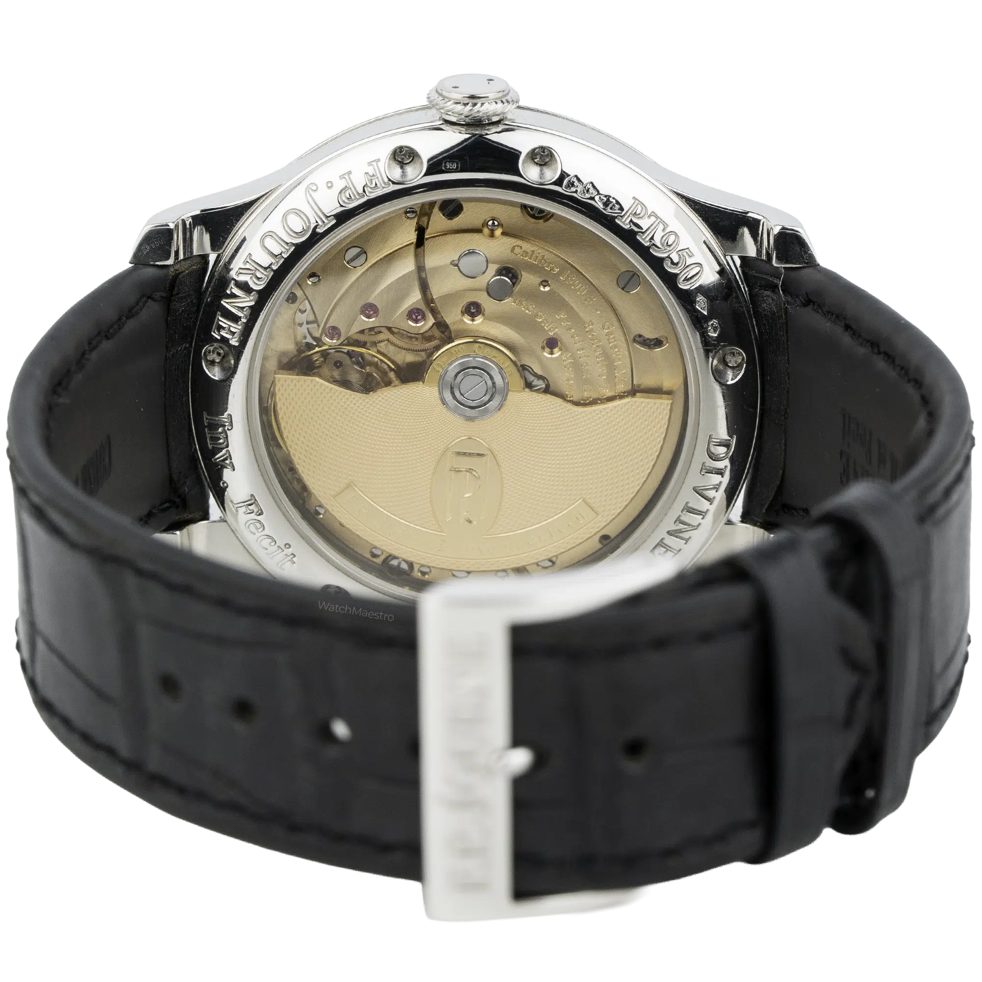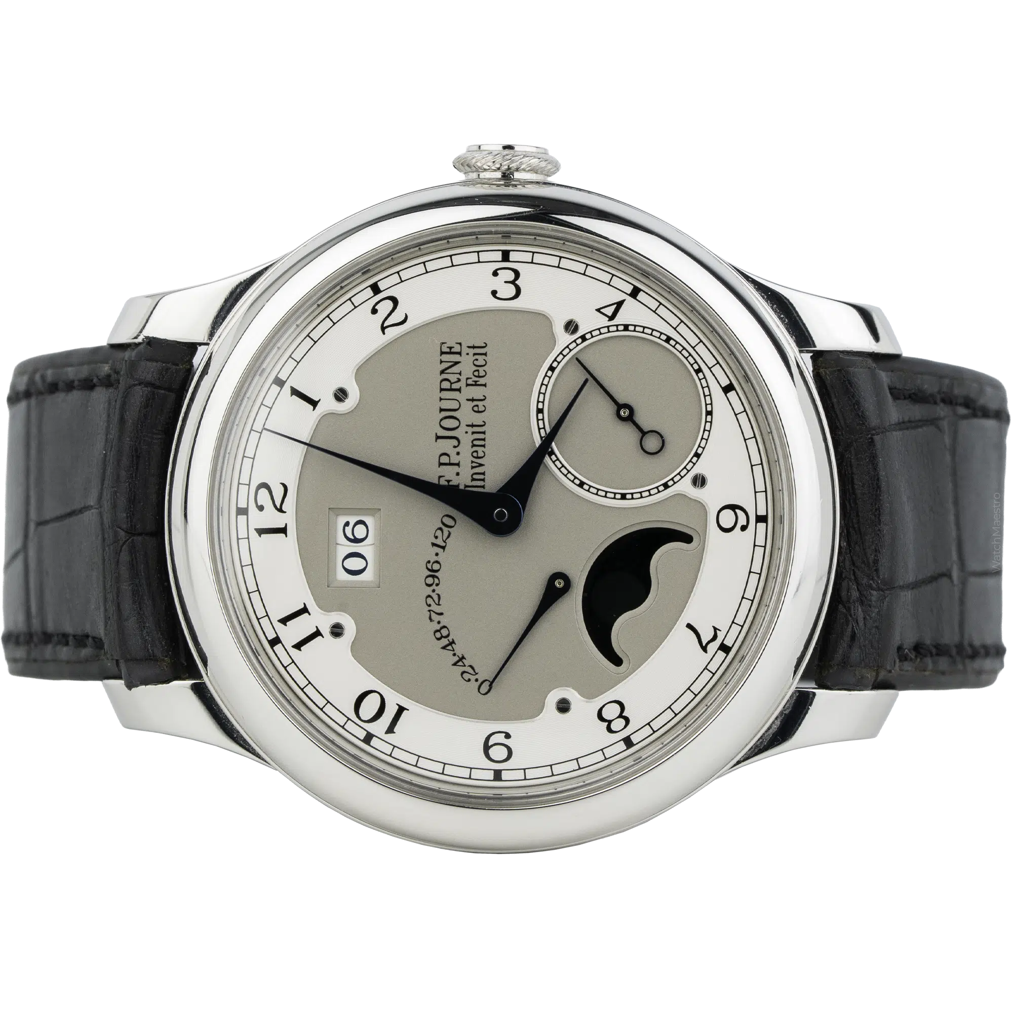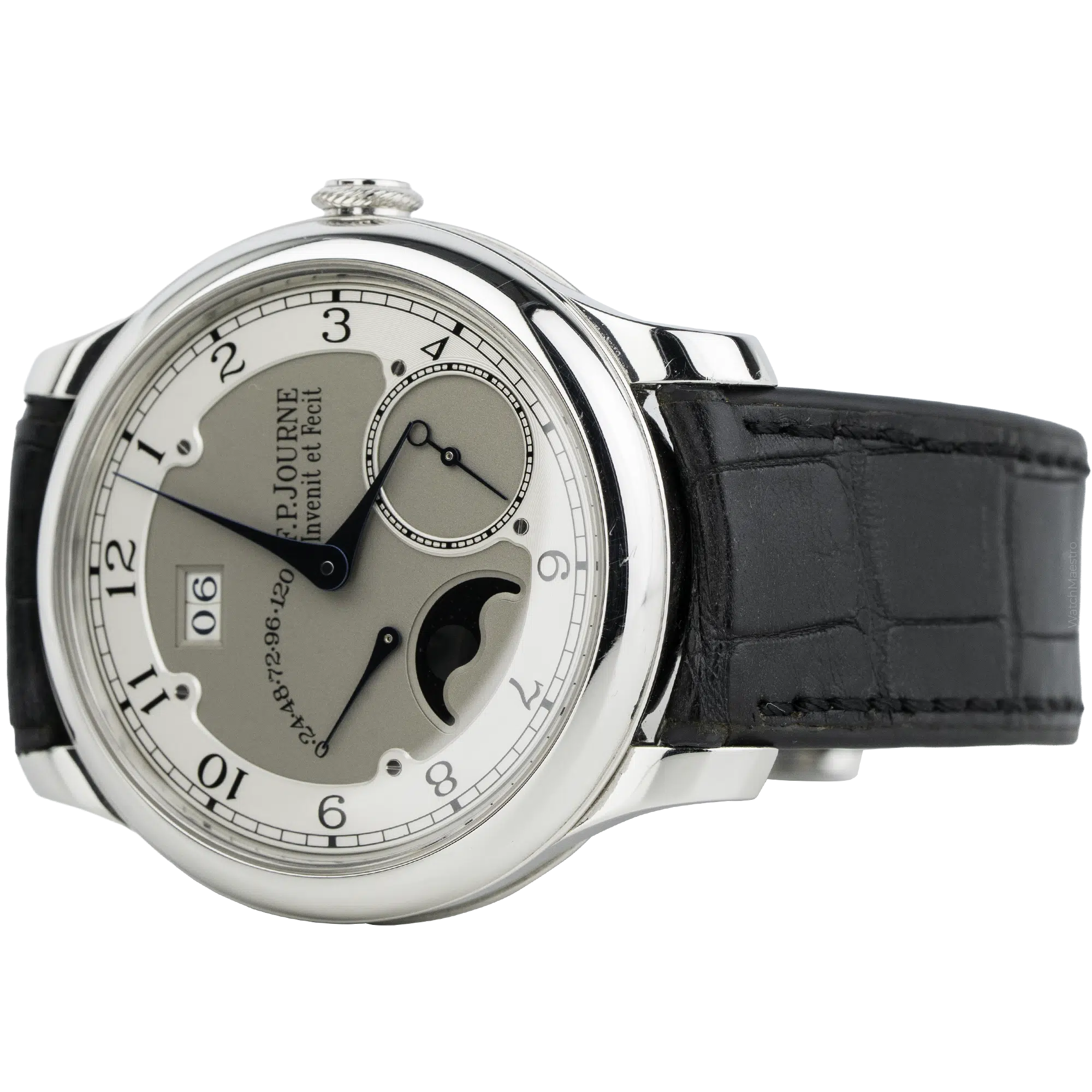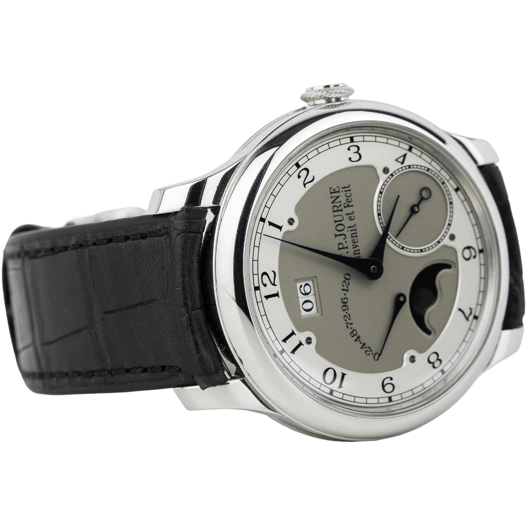 This 2021 F.P Journe is in like-new condition without any visible marks. The 40mm case is made from solid 950 platinum, which feels substantial and heavy on the wrist. The silver dial displays the signature off-center layout with blued steel hands, a large date, and a moon phase indicator. Besides, the 2021 F.P Journe uses an automatic Calibre 1300.3 movement built from 18k rose gold. The movement offers a 120-hour power reserve. The watch comes on a black crocodile skin strap with a matching platinum pin buckle.