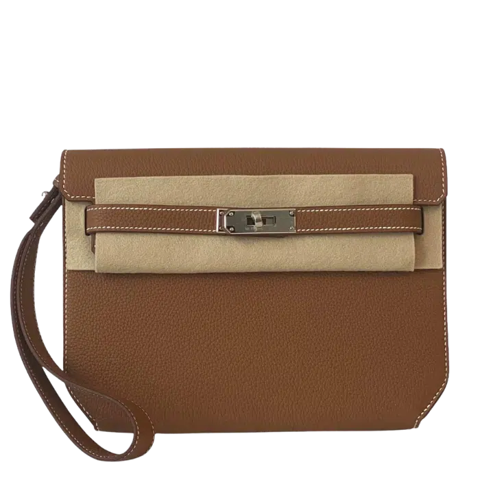 The Hermes Kelly Depeche 25 is made from Gold Togo leather, which shows a pebbled texture and clean white stitching along all seams. A beige panel appears on the flap, and palladium hardware forms the Kelly turnlock at the front with Hermes engraving. One leather wrist strap is included for easy carrying. The bag is never used and has a stamp K and comes as a full set.