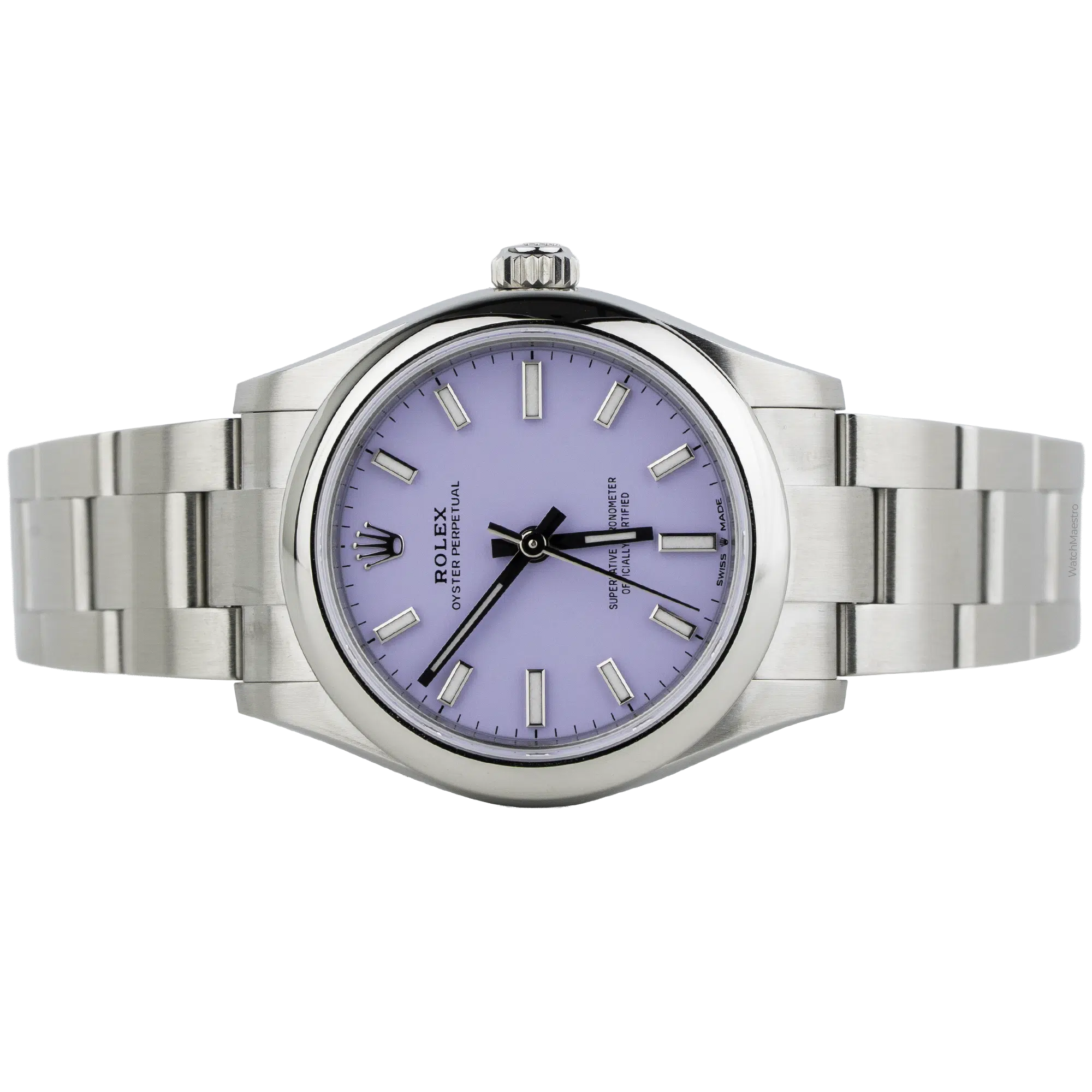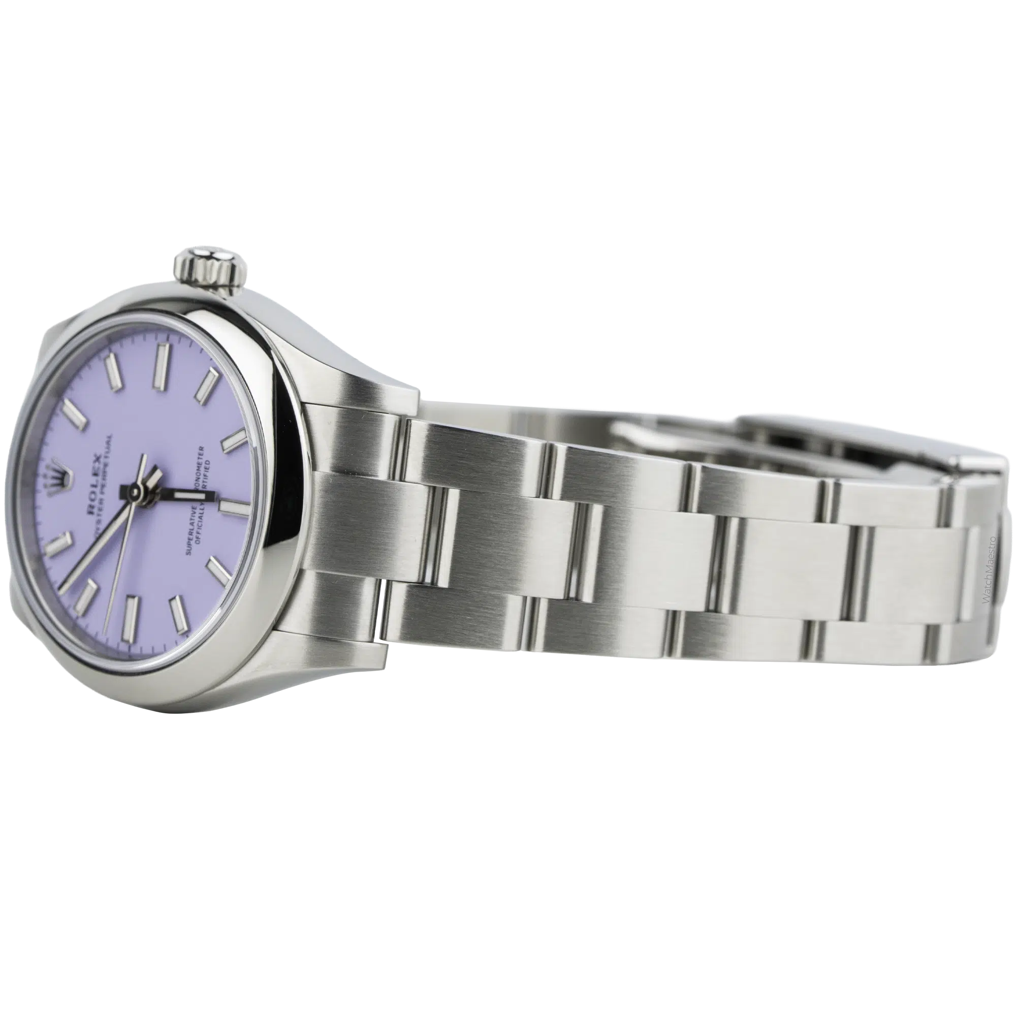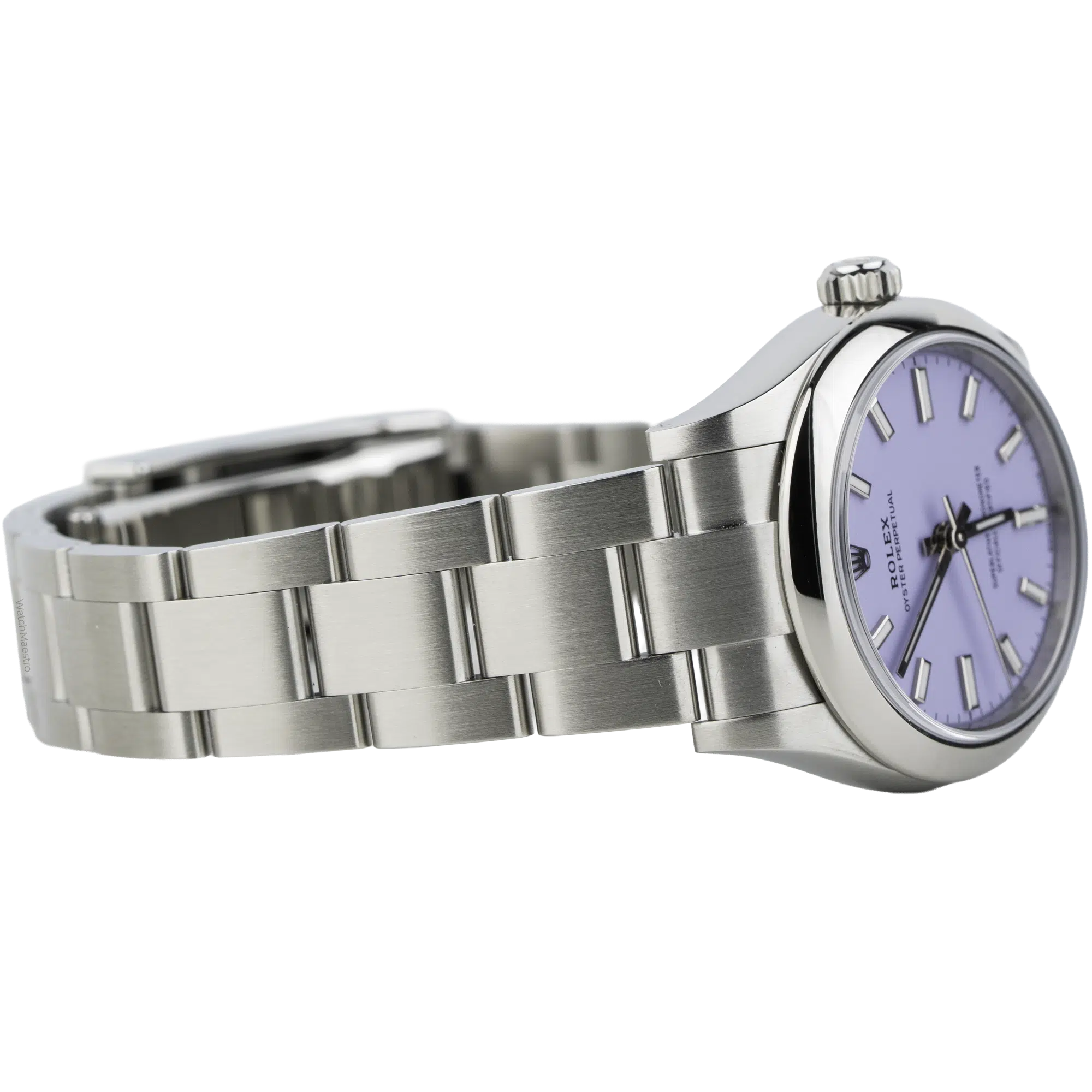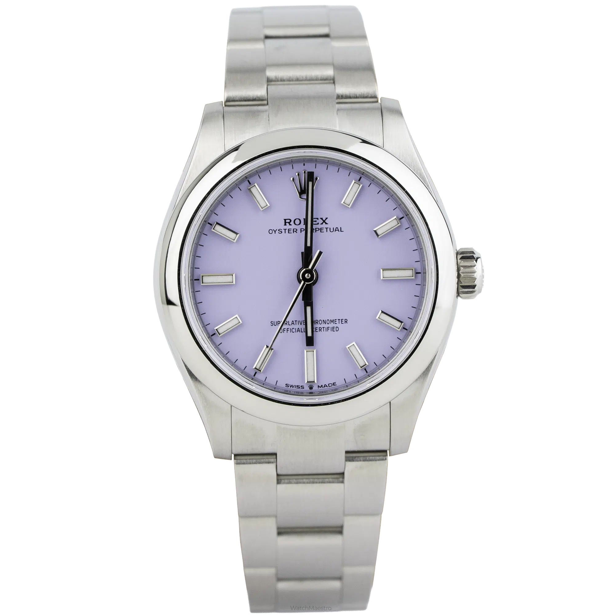 This Rolex Oyster Perpetual 31 features a unique Lavendar dial. The color is soft and powdery, which looks beautiful under natural light. The reference 227200 is made from Oystersteel, which is a superalloy that feels cool and smooth against the skin. The 31mm case size is very elegant and sits perfectly on a woman’s wrist without feeling heavy. It has the classic domed bezel, which reflects light subtly. The Oyster bracelet with flat three-piece links is brushed and polished and offers a secure fit that is comfortable for daily wear.