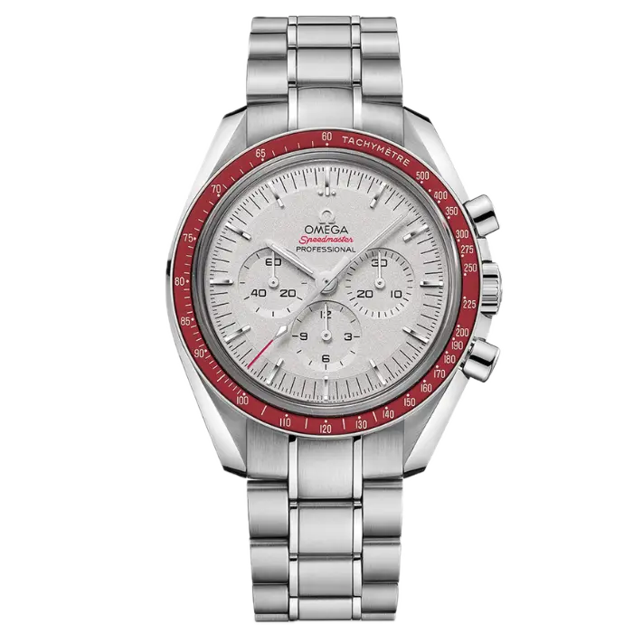 The solid caseback has the engraved Tokyo 2020 Olympics logo with five rings. The matching steel bracelet closes with a secure folding clasp and offers 50-metre water resistance. Besides, the bold red bezel looks sharp and beautiful with jeans and a polo shirt on weekends or with a business suit at meetings and dinners. The tachymeter scale makes it great for track days or Olympic fan events. As an investment, the luxury timepiece retains value very well. For instance, unworn examples from this Tokyo Olympics series stay strong on the secondary market because of their low number and Moonwatch heritage.