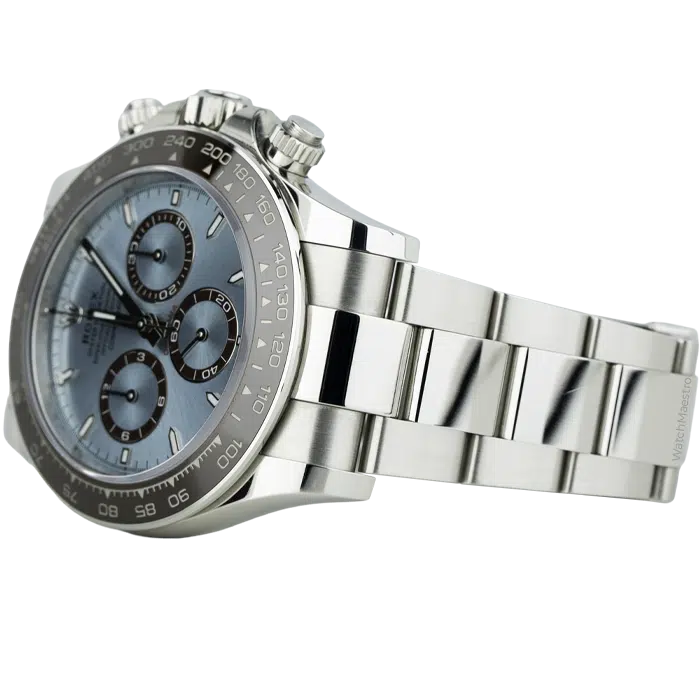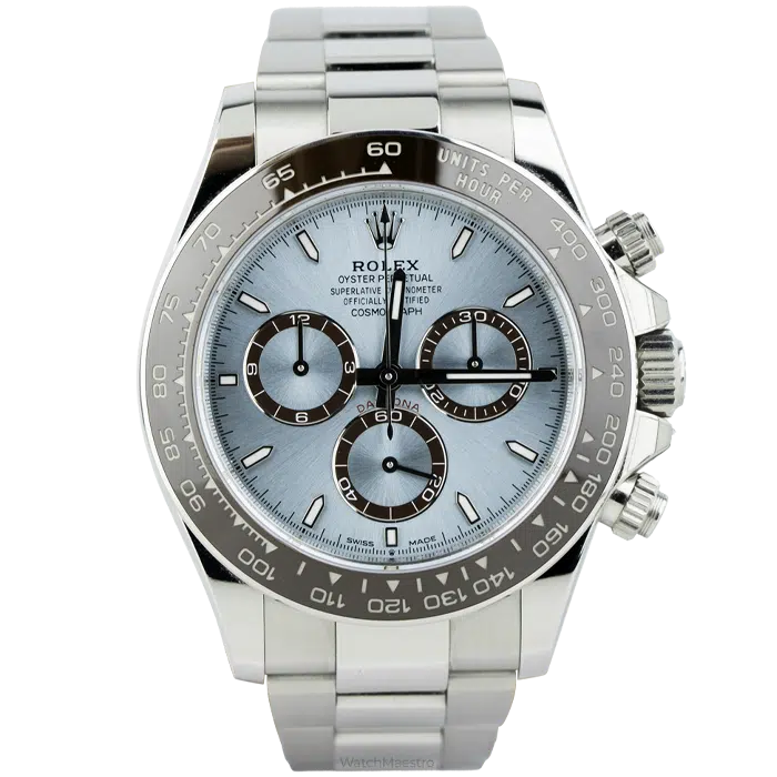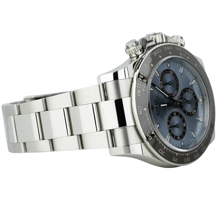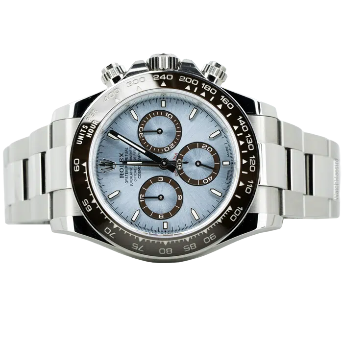 The 2025 Rolex Daytona, reference 126506, has a 40mm solid platinum case and matching bracelet. The dense platinum provides a premium weight on the wrist. Rolex has paired it with a signature ice blue dial, a specific tone reserved for the brand’s platinum watches. Clean index markers keep the display legible in any light. It also features a chestnut brown Cerachrom bezel that frames the face.
