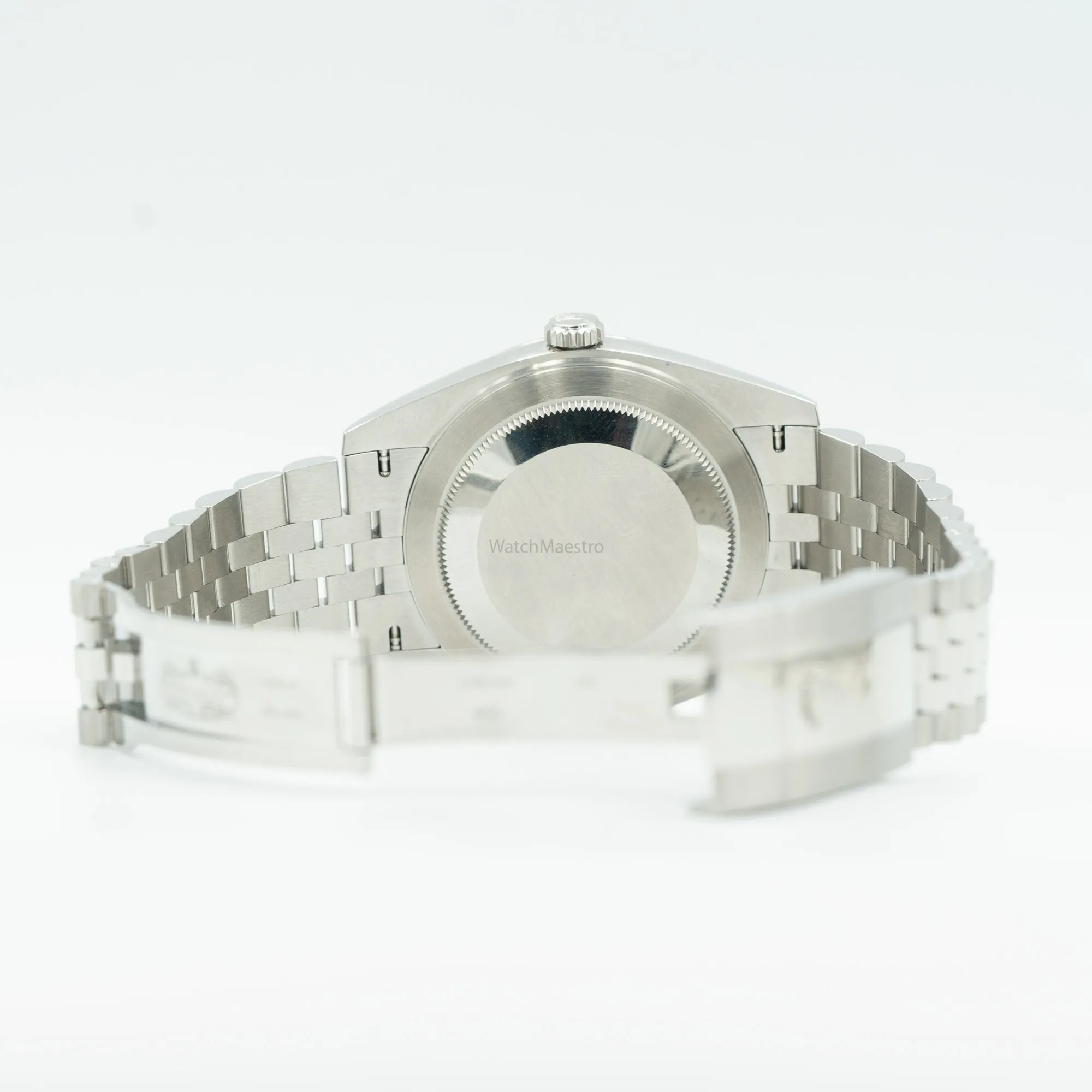 This is a brand-new Rolex Datejust 41 featuring the popular yet unique Blue Motif Dial. Purchased in 2023, the timepiece comes in its original box along with the green Rolex warranty card. The Oystersteel case of the watch sits on a Jubilee Bracelet and features a smooth bezel.