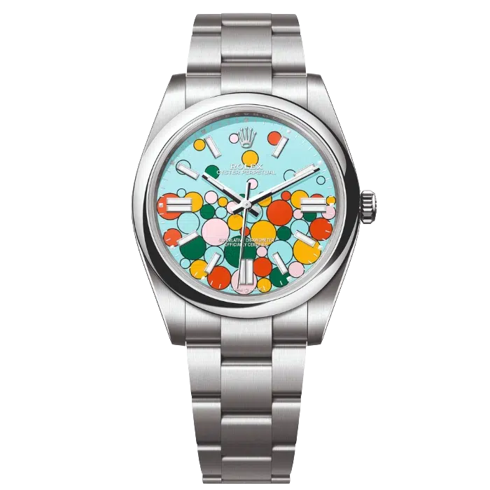 You can feel the quality of the Oystersteel case immediately because it is cool and smooth on your wrist. This Rolex Oyster Perpetual 41 features the famous Celebration theme. The Blue Turquoise dial is very bright and decorated with bubbles in candy pink, yellow, and hunter green. The 41mm size is bold, but the domed bezel keeps it sleek. The 2023 Rolex Perpetual 41mm is available is in like-new condition, and the sapphire crystal is clear without marks.