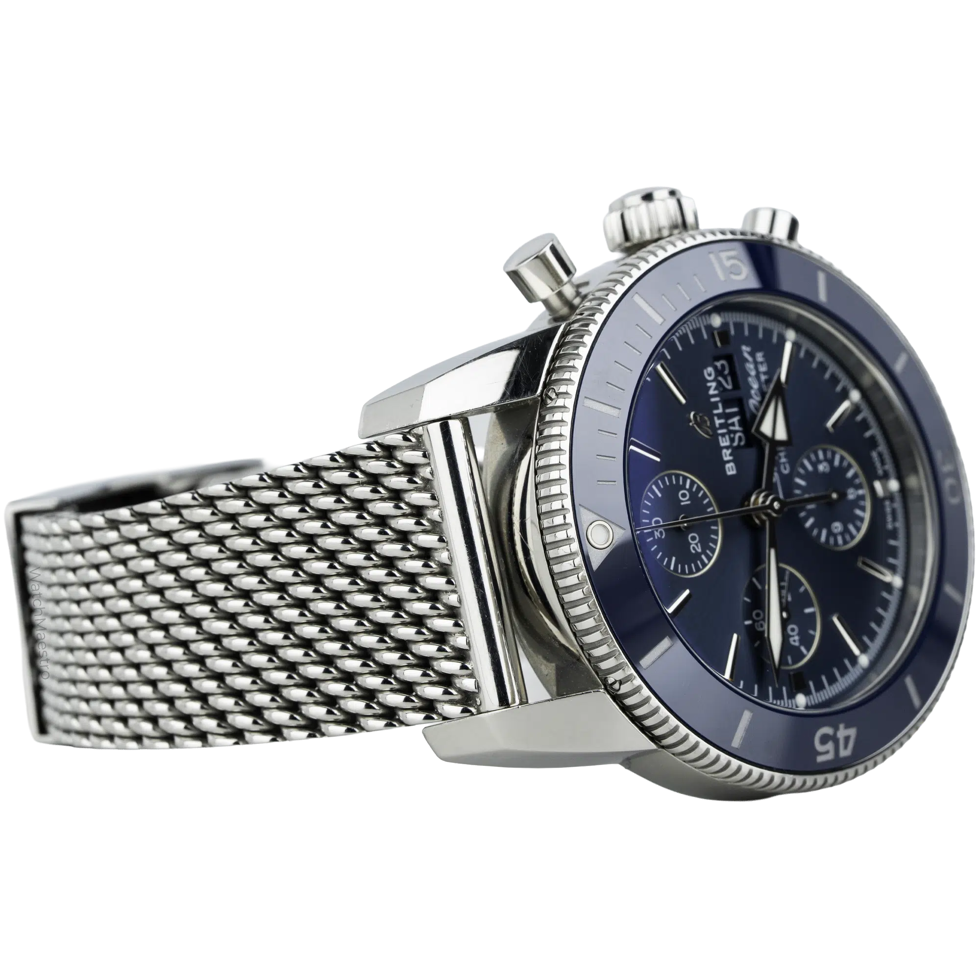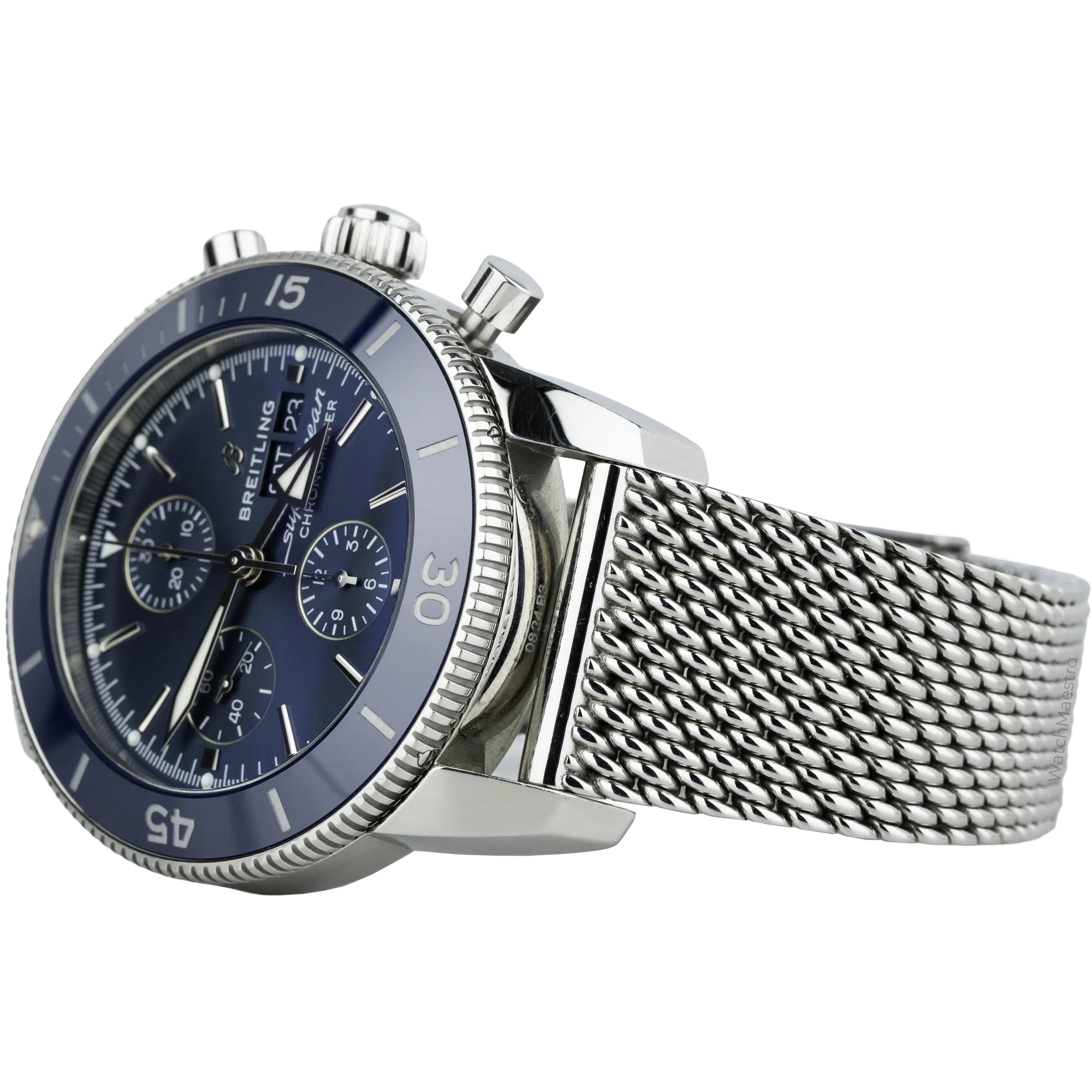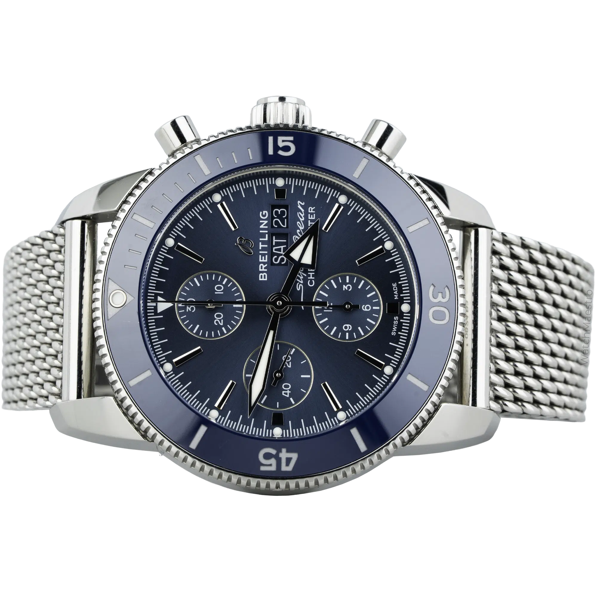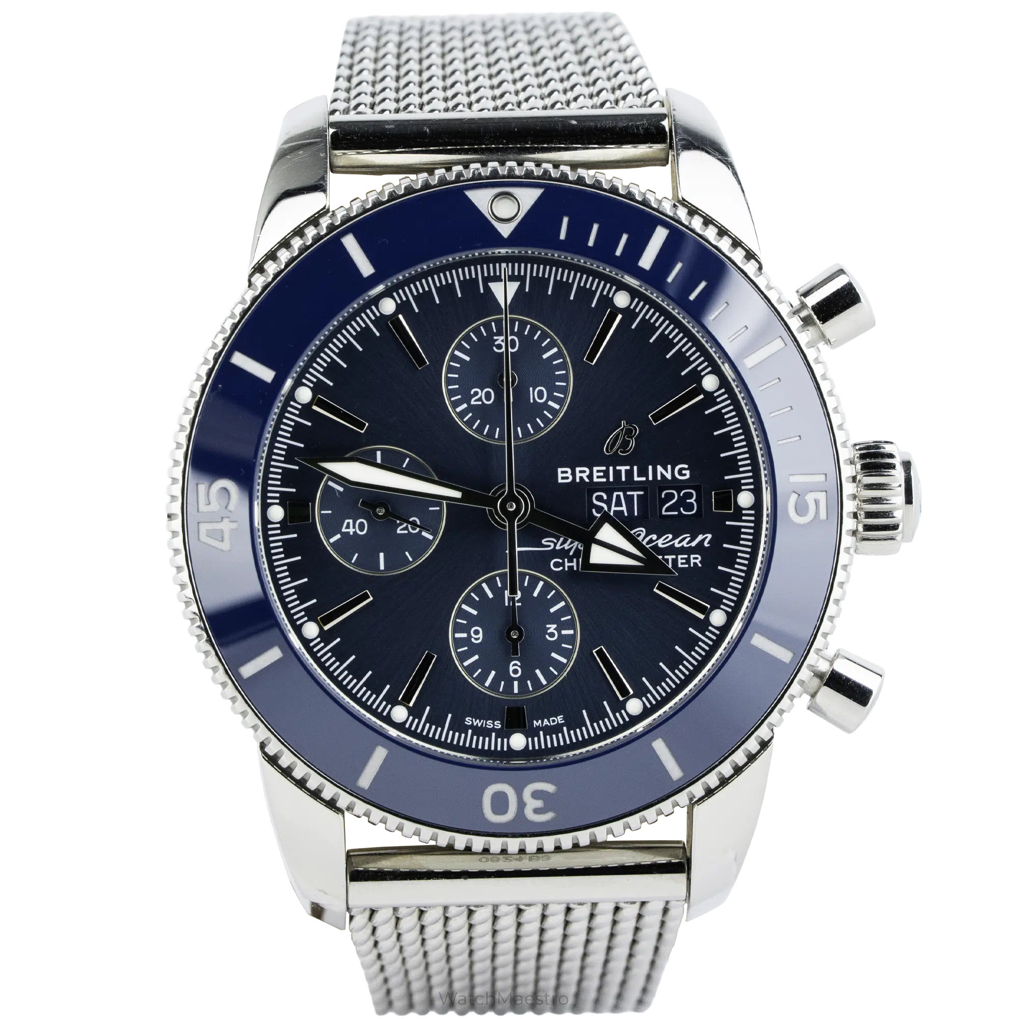 The 2025 Breitling Superocean, reference number A1331316C1A1, is a beautiful Chronograph. It has a 44mm steel case, vibrant blue dial, and automatic movement certified as a chronometer. It has a day-date complication with three subdials for precise timing. It has a steel mesh bracelet with a unidirectional dive bezel. The watch is available in new-like condition, and you will get the original box and papers.