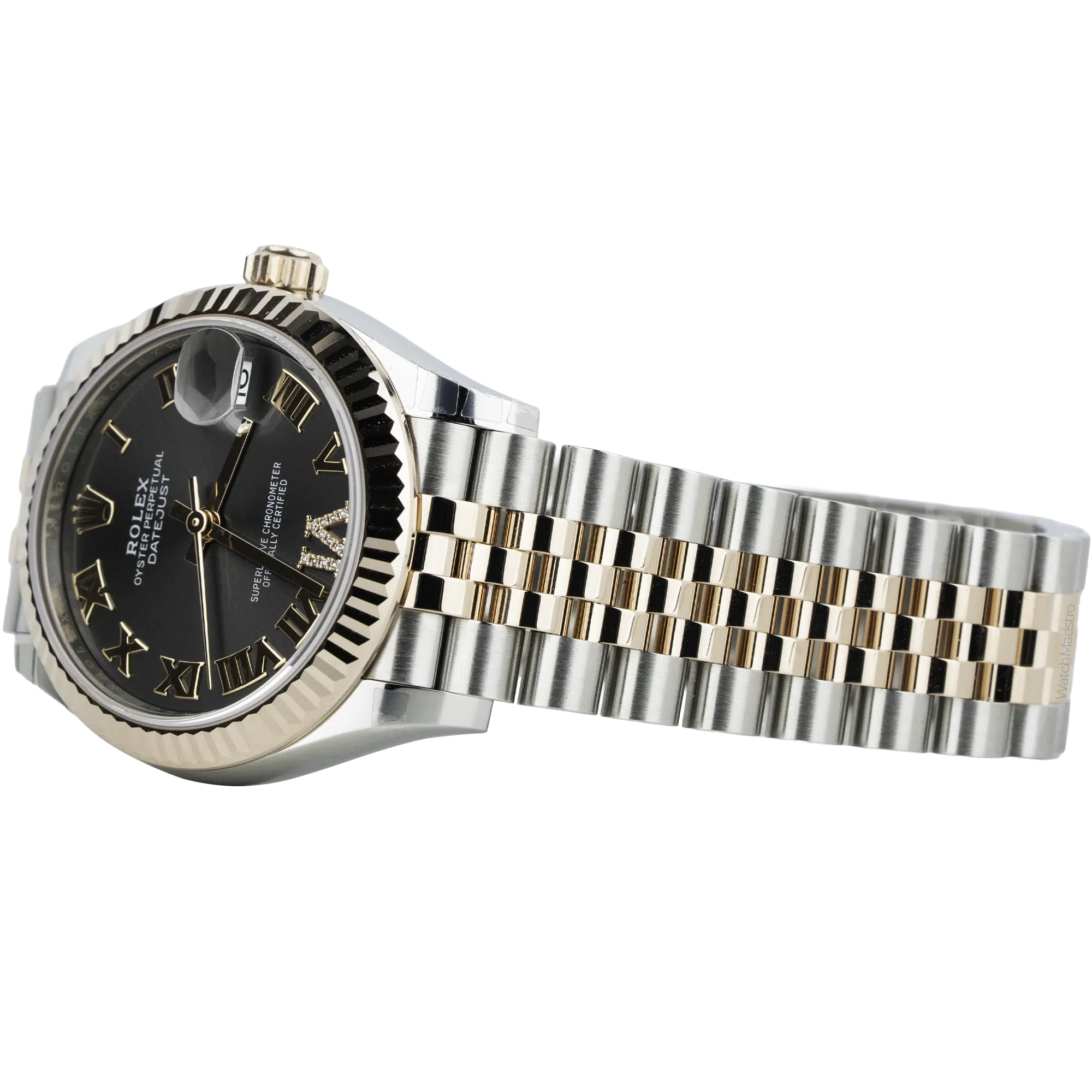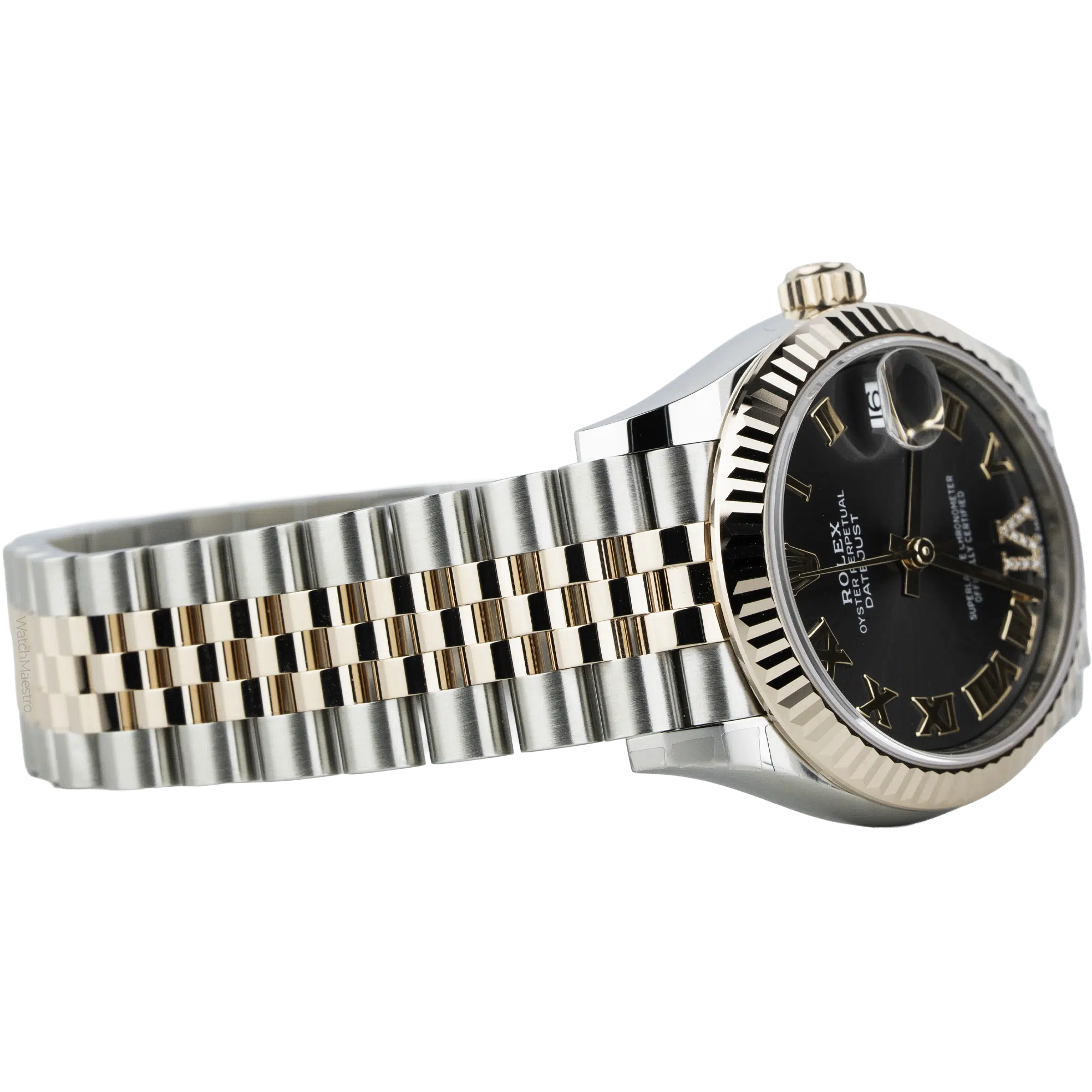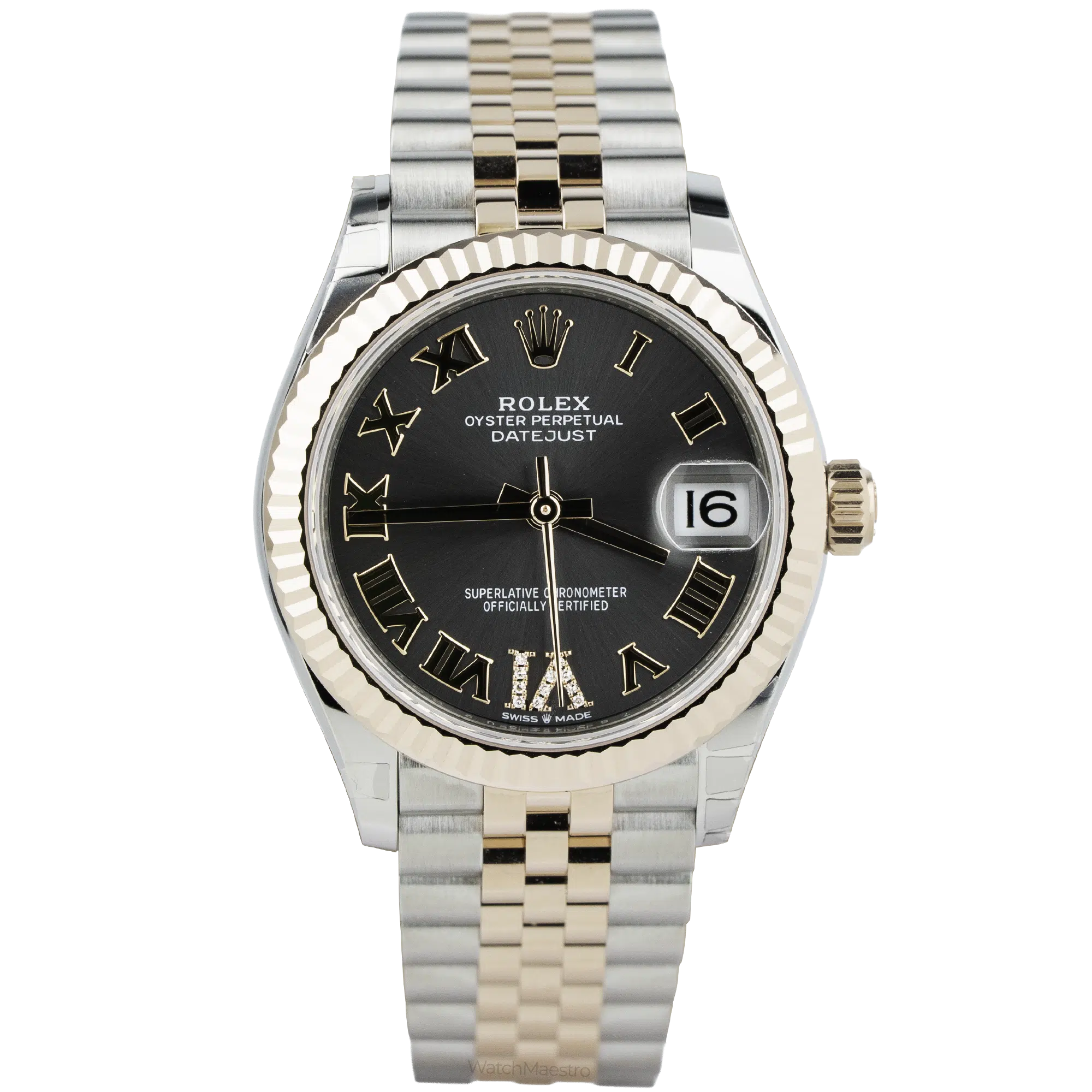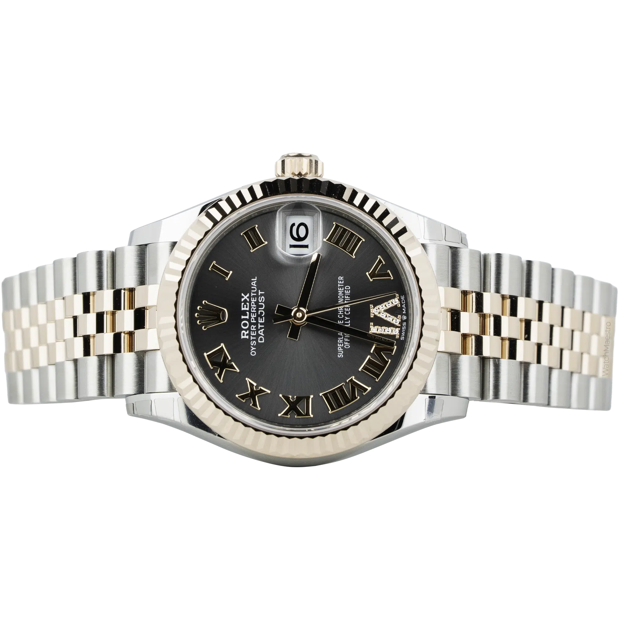 The Rolex Datejust 31 is a 2026 unworn watch. The reference number is 278271. It pairs durable steel with solid rose gold and features a 31mm case topped by a fluted bezel. A self-winding automatic movement keeps precise time inside. The dark grey dial displays applied rose gold Roman numerals. The numeral VI is carefully set with brilliant-cut diamonds. A scratch-resistant sapphire crystal protects the face. The watch has a beautiful and advanced Cyclops date lens at the three o’clock mark.