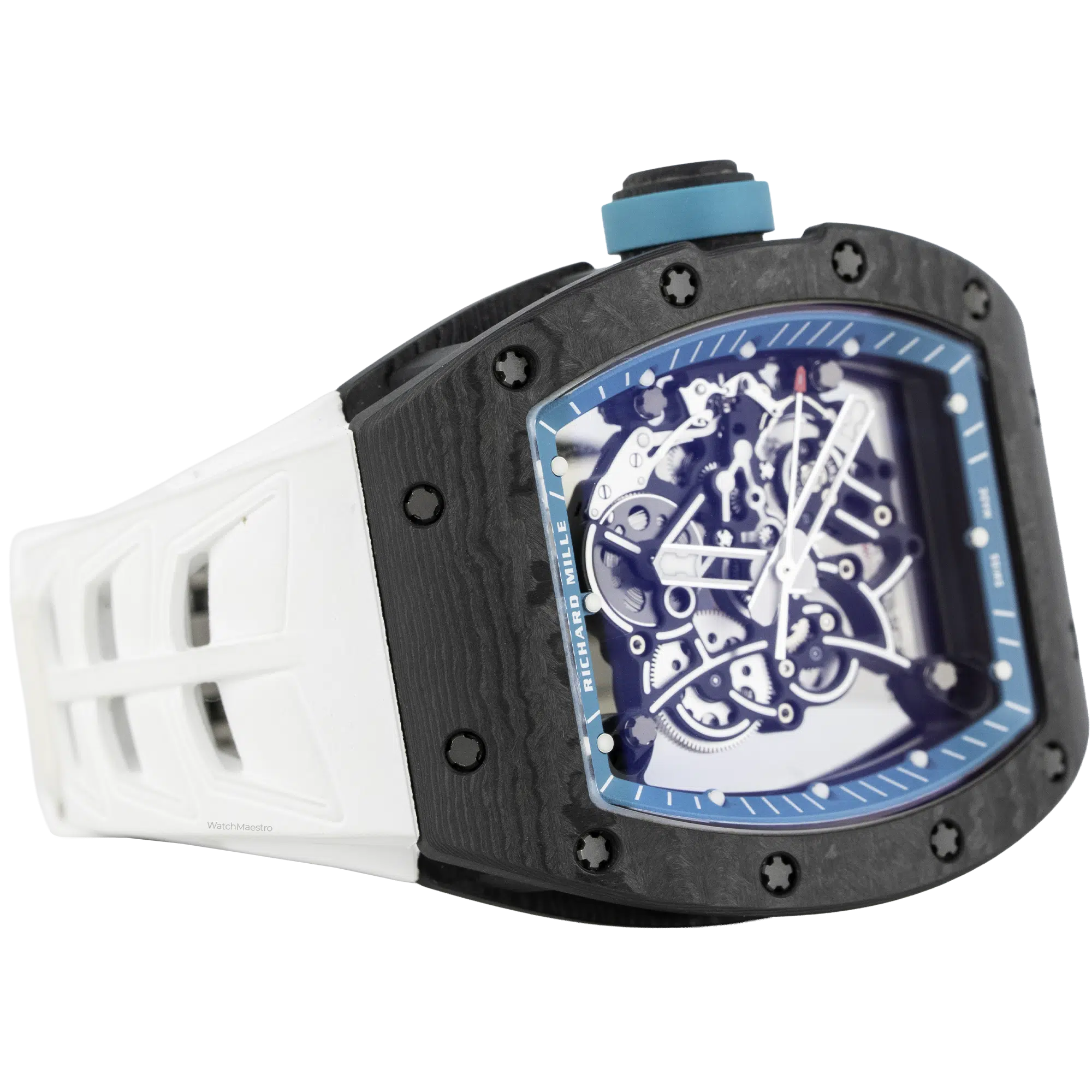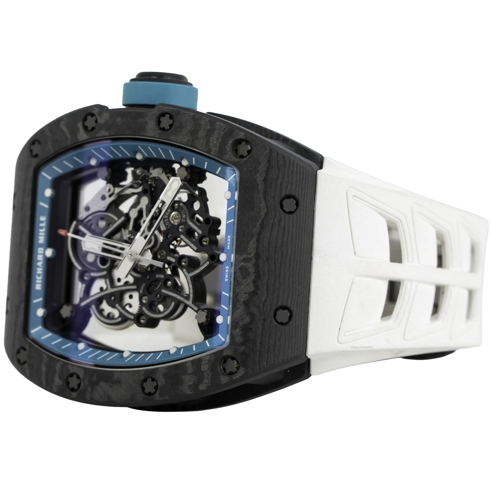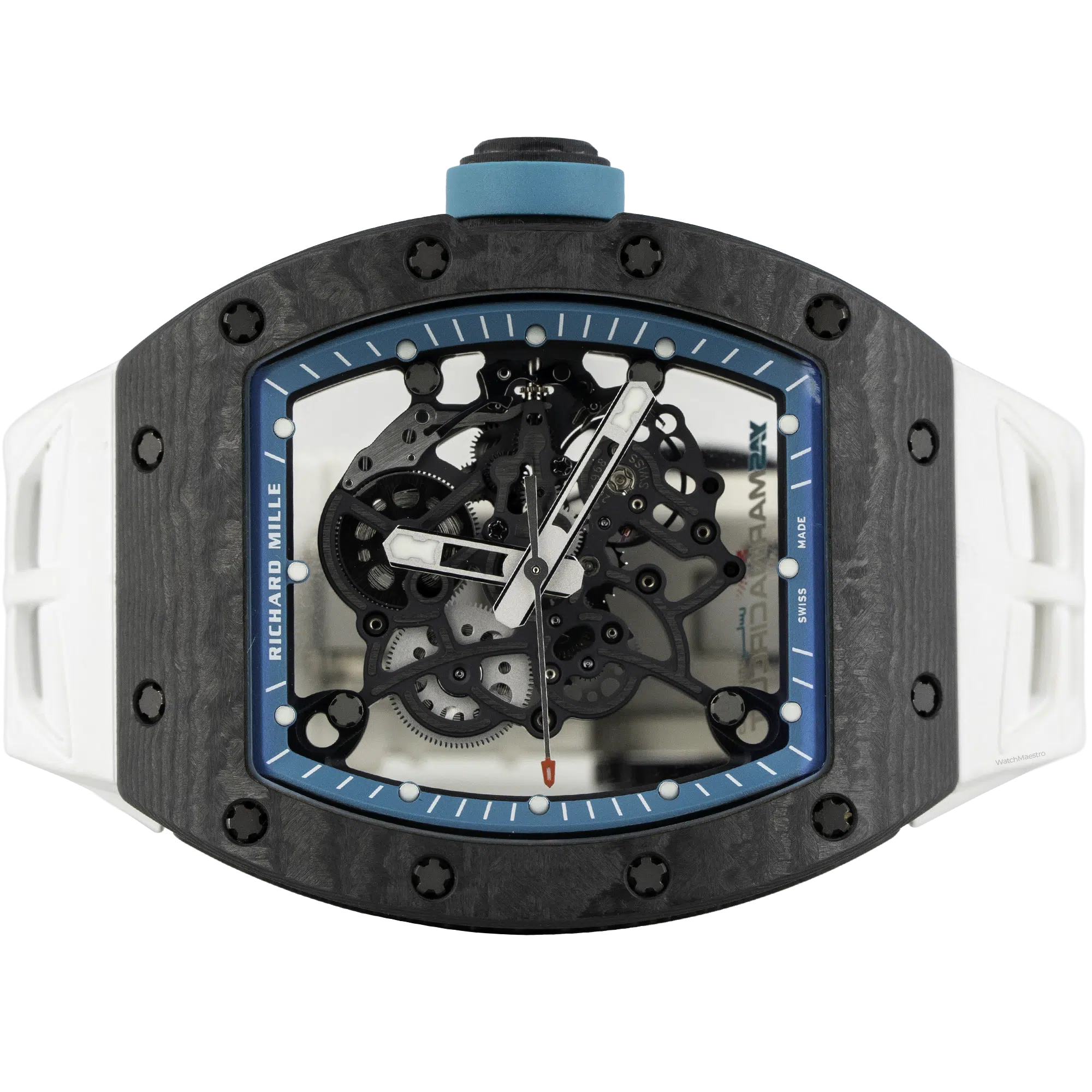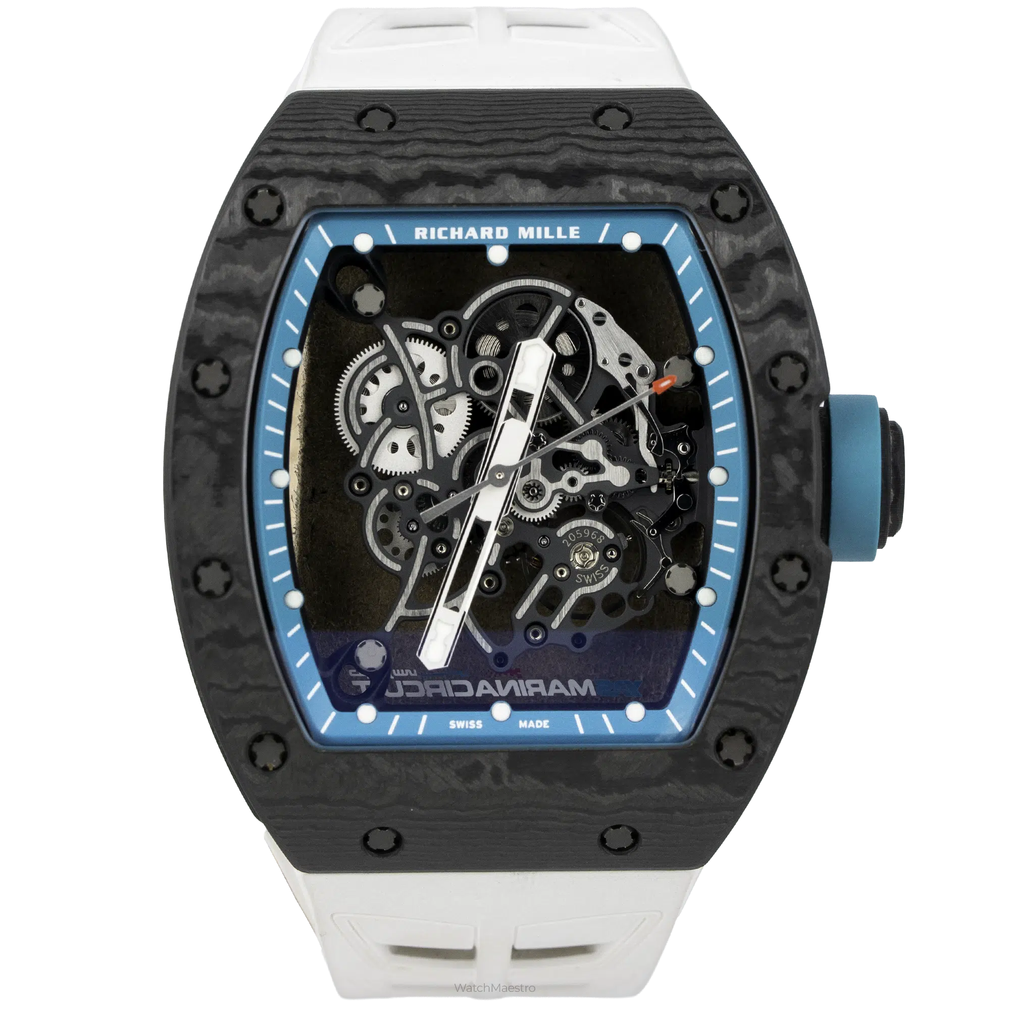 The Richard Mille RM 055 Yas Marina Circuit edition is a perfect example of how high-performance engineering meets exclusive design. Produced in extremely limited numbers, it celebrates the UAE’s iconic Formula 1 venue with a striking blue-accented carbon case a mix of NTPT Carbon and Quartz TPT layers that create an unmistakable marbled texture. The skeletonized movement sits within a case built for lightness and strength, staying true to the spirit of the RM 055 lineage. This 2018 piece is pre-owned and comes complete with box and papers.