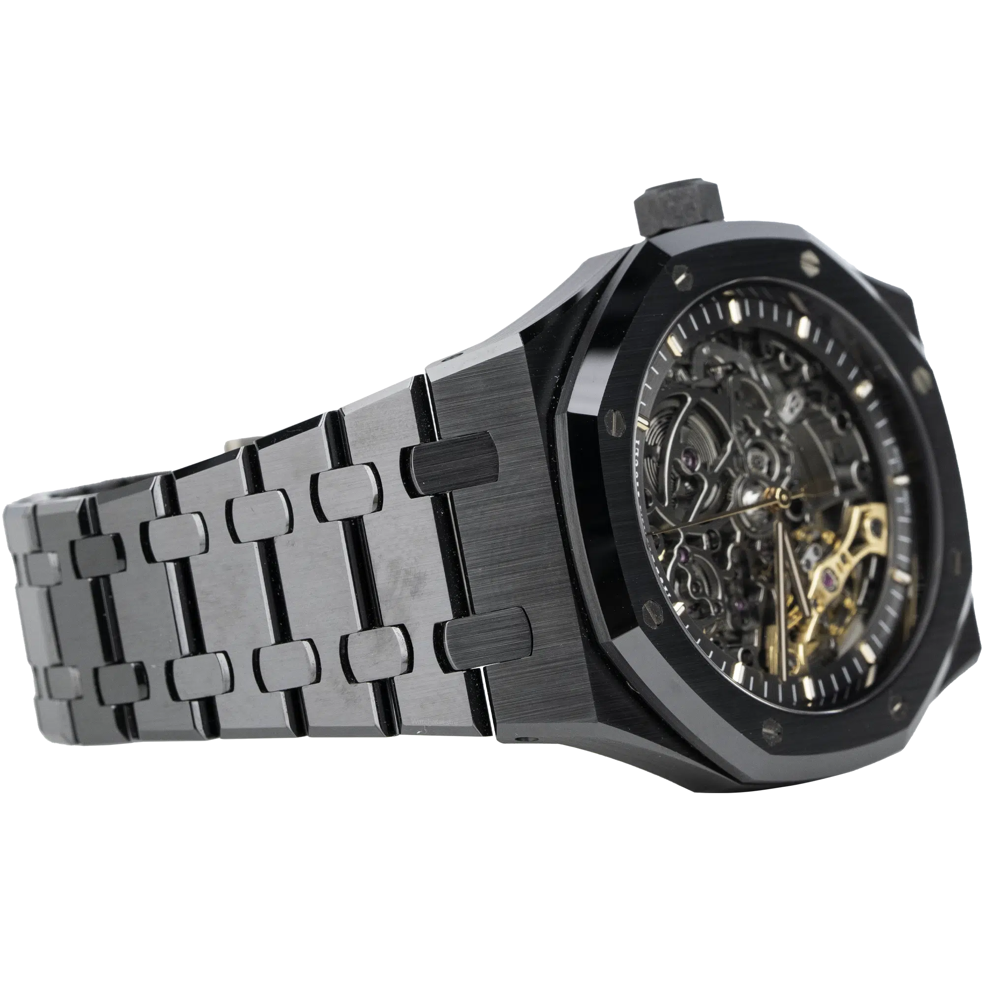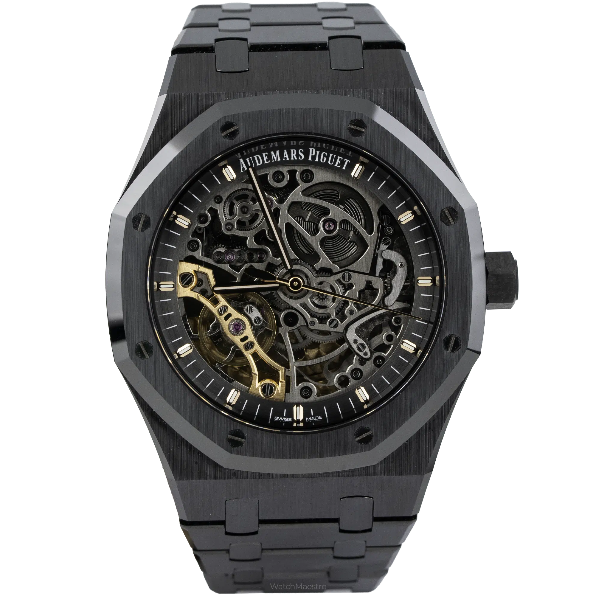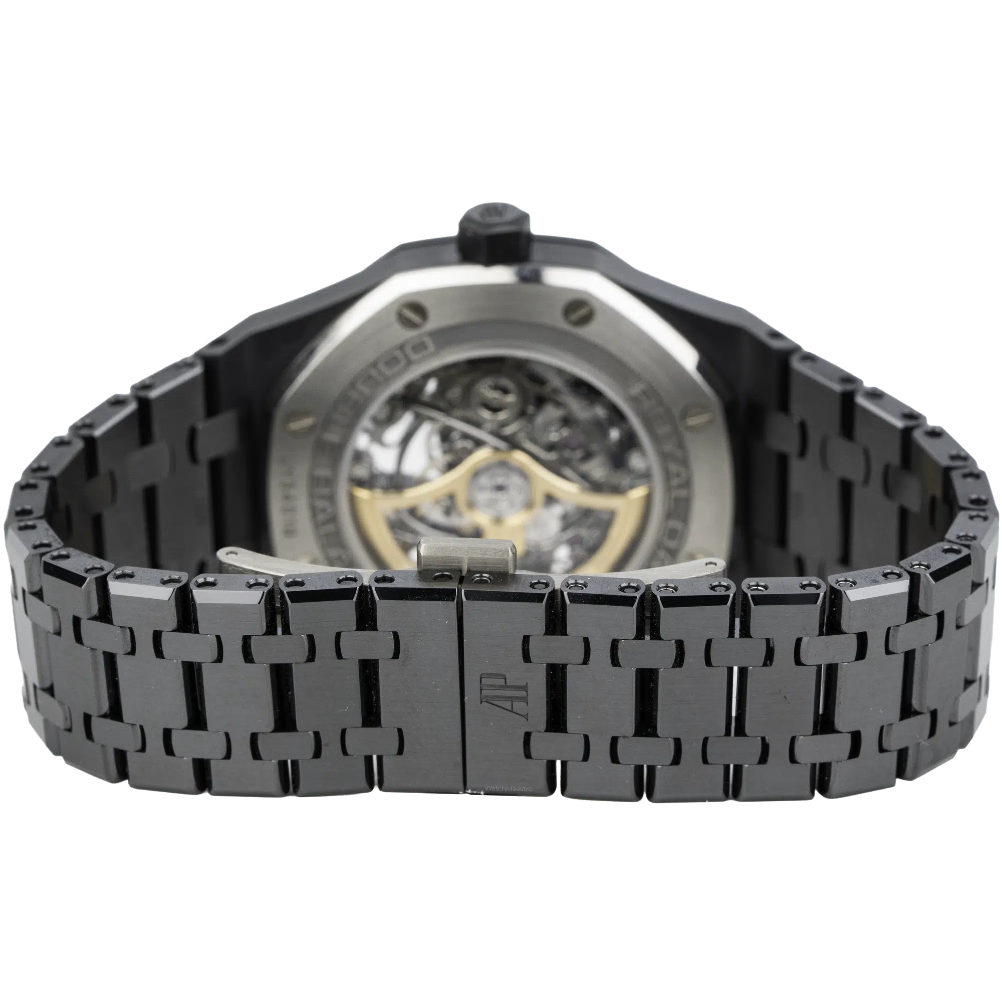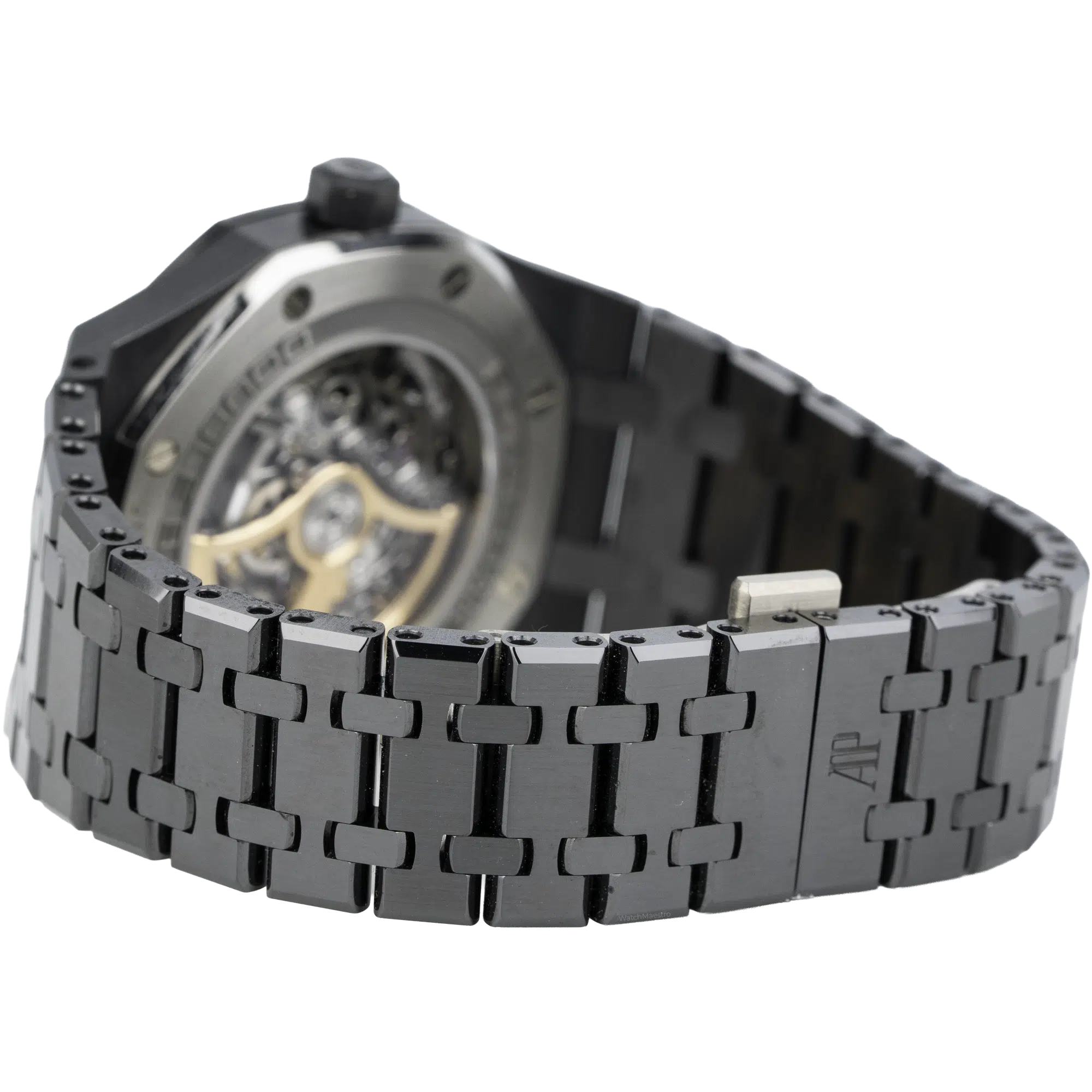 The Audemars Piguet Royal Oak Openworked in full black ceramic is one of the most striking and technically complex Royal Oaks ever made. The 41mm case, bezel, and integrated bracelet are crafted entirely from black ceramic, offering a lightweight, scratch-resistant timepiece. Through the skeletonized dial, the openworked movement reveals every bridge, wheel, and gear in perfect symmetry, turning the watch into a mechanical sculpture. This 2023 example is offered pre-owned and comes complete with its original box and papers.