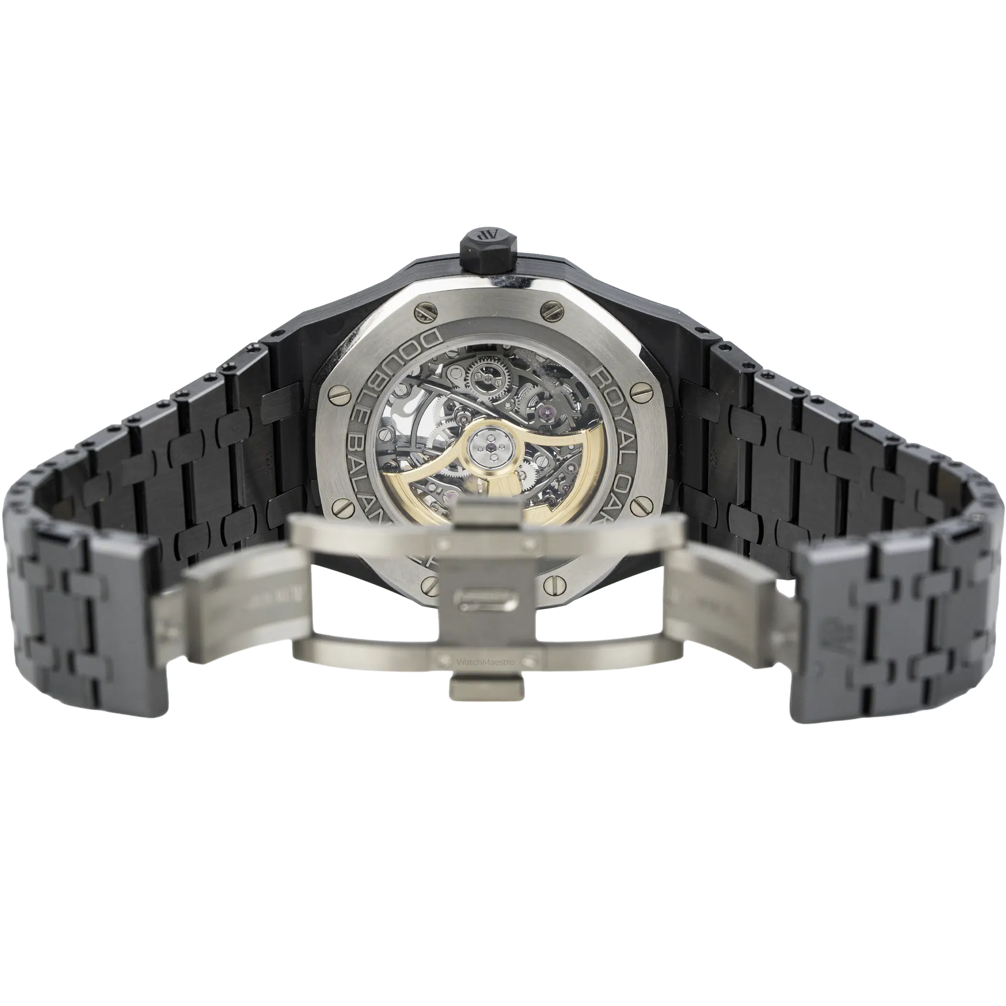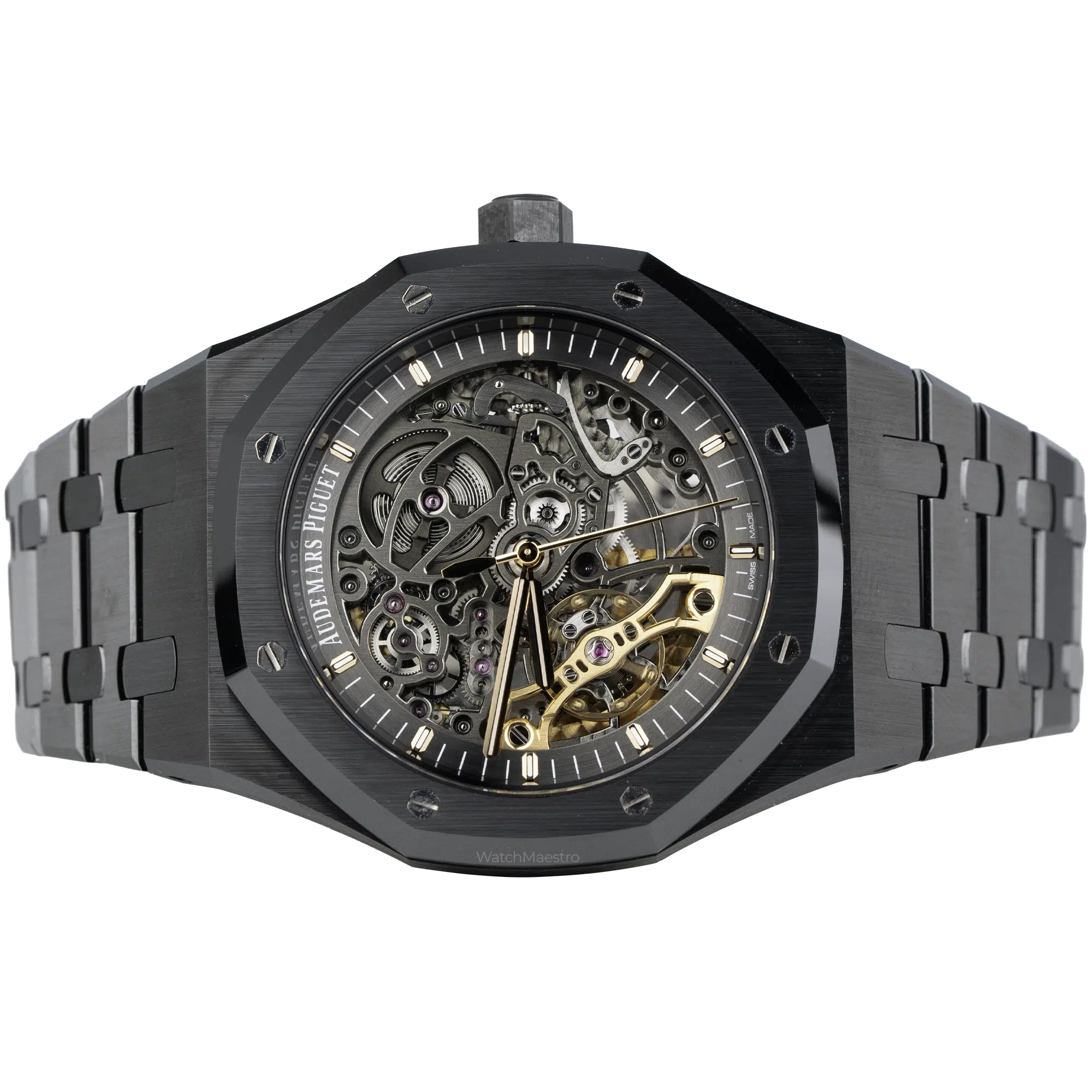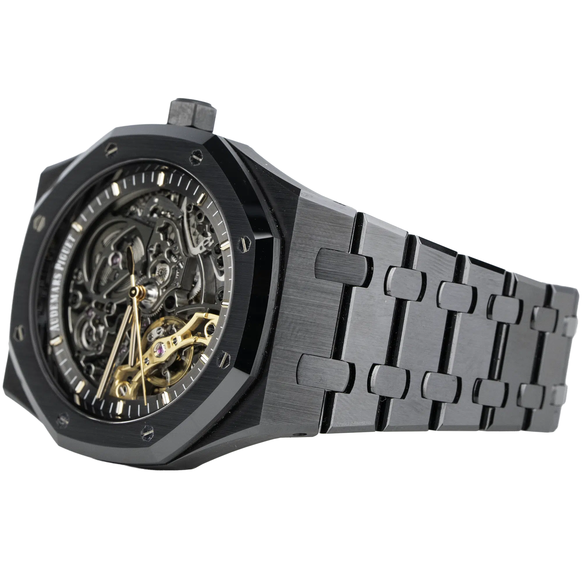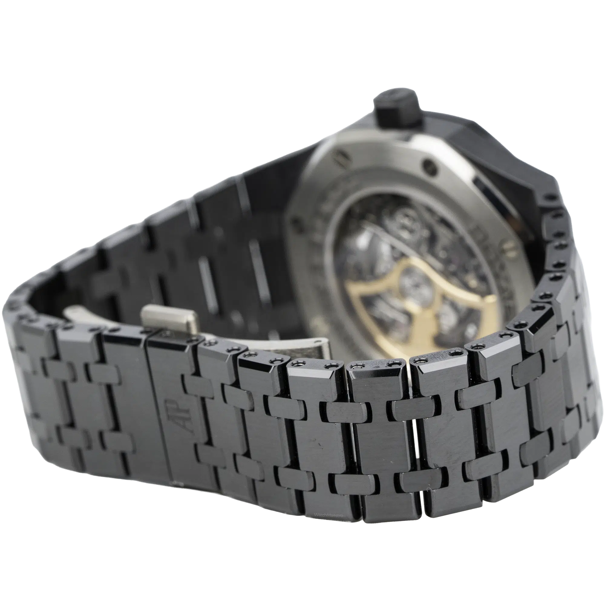 The Audemars Piguet Royal Oak Openworked in full black ceramic is one of the most striking and technically complex Royal Oaks ever made. The 41mm case, bezel, and integrated bracelet are crafted entirely from black ceramic, offering a lightweight, scratch-resistant timepiece. Through the skeletonized dial, the openworked movement reveals every bridge, wheel, and gear in perfect symmetry, turning the watch into a mechanical sculpture. This 2023 example is offered pre-owned and comes complete with its original box and papers.