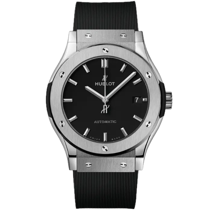 The 2016 Hublot Classic Fusion 42mm features a lightweight titanium case with a ribbed black rubber strap. The deep black dial features faceted hour markers, which catch light alongside the polished silver-tone hands. There are six signature H-shaped screws that secure the beautiful, brushed bezel. This model is unique due to its automatic movement that drives the sweeping seconds hand and a clear date display at three o’clock. It is available in new-like condition, and you will get the original box and papers.