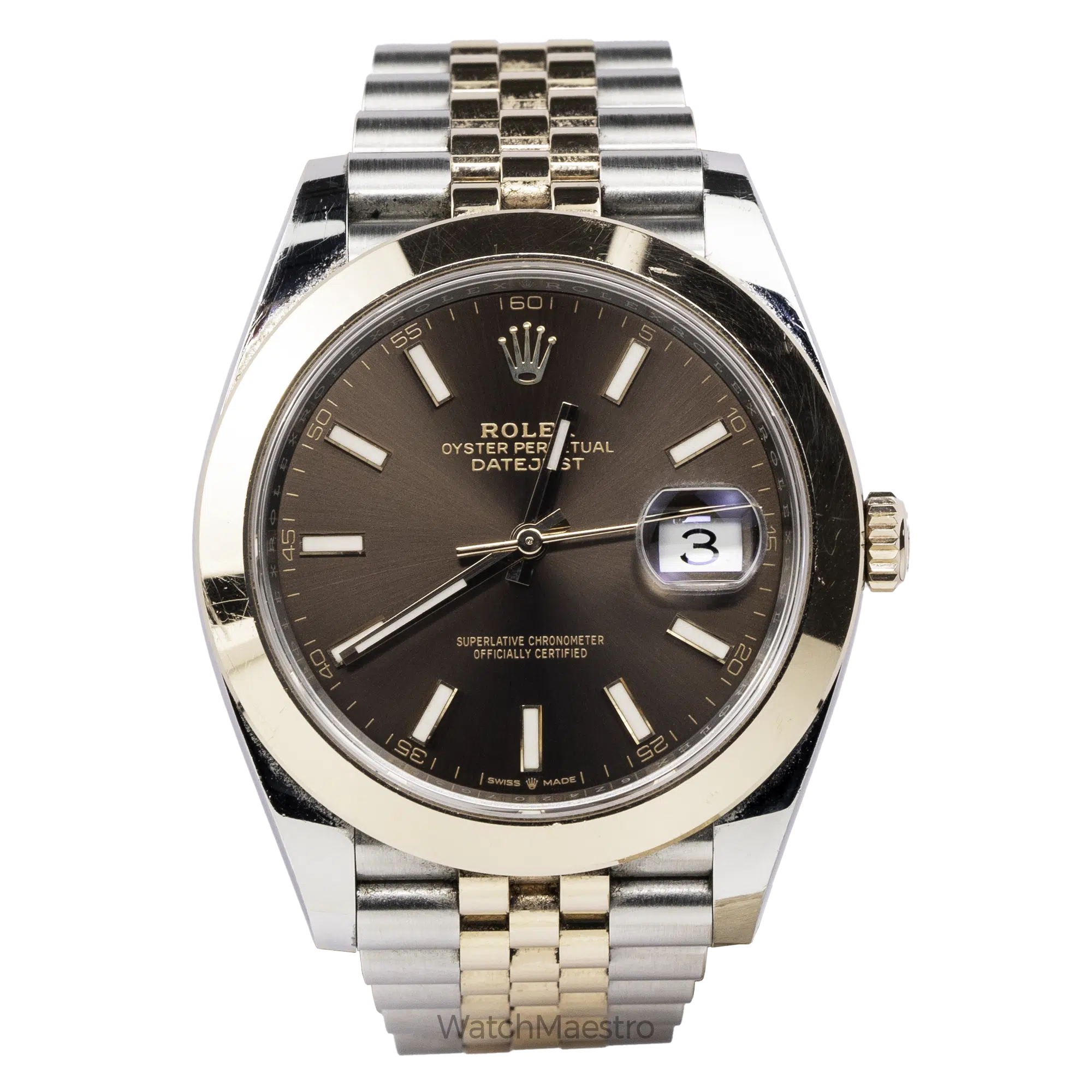 WatchMaestro has managed to acquire this fascinating Rolex Datejust 41 with a Chocolate Index dial. This reference 126301 comes with a two-tone Jubilee bracelet crafted out of stainless steel and rose gold. It also gets an 18ct Smooth Bezel that sits on the 41mm Stainless Steel case of this pre-owned watch. Purchased in 2021, the watch comes complete with box and papers and it is still in a pristine condition with very minimal signs of wear. This combination is not an easy one to find and that too at this price. So, hurry and contact us today!