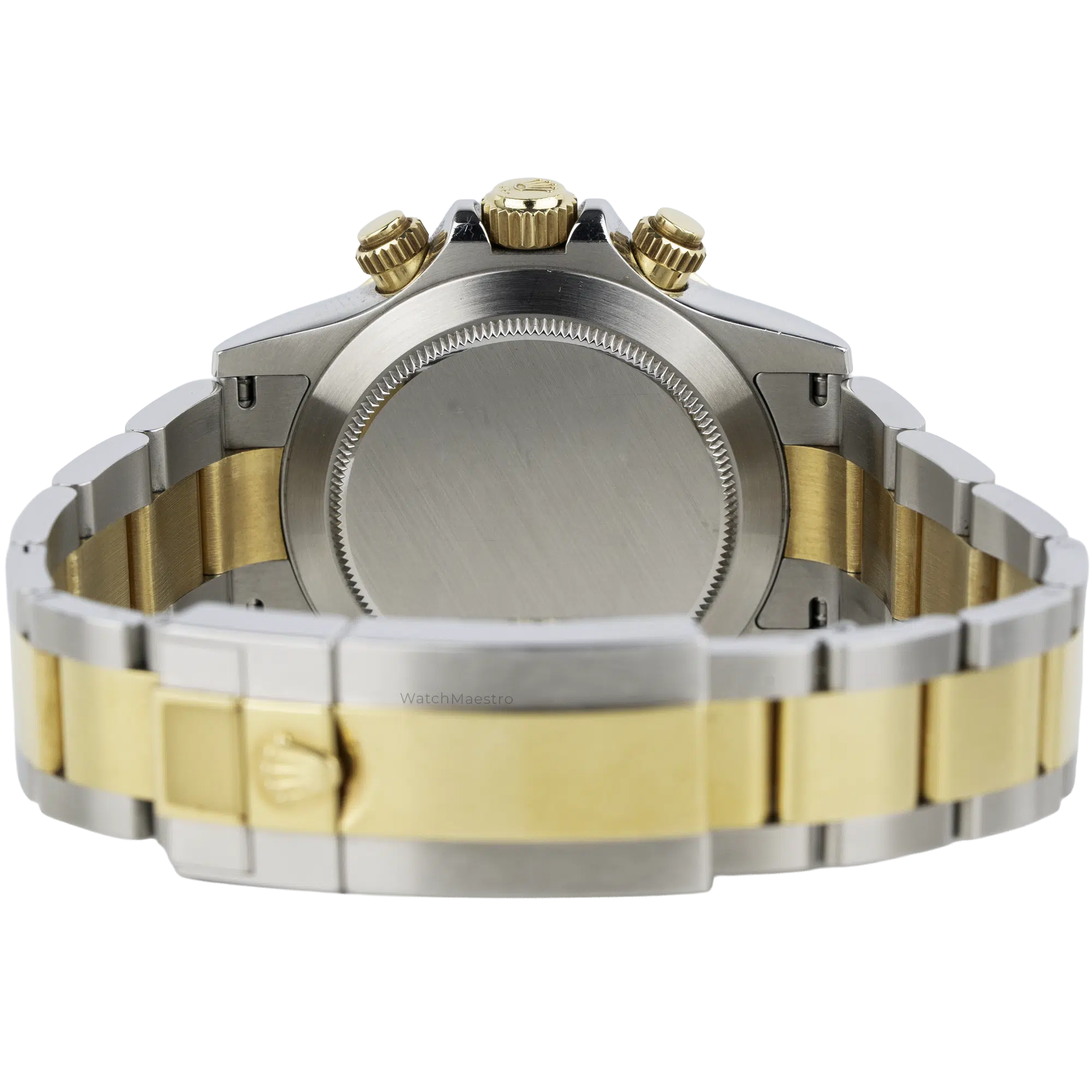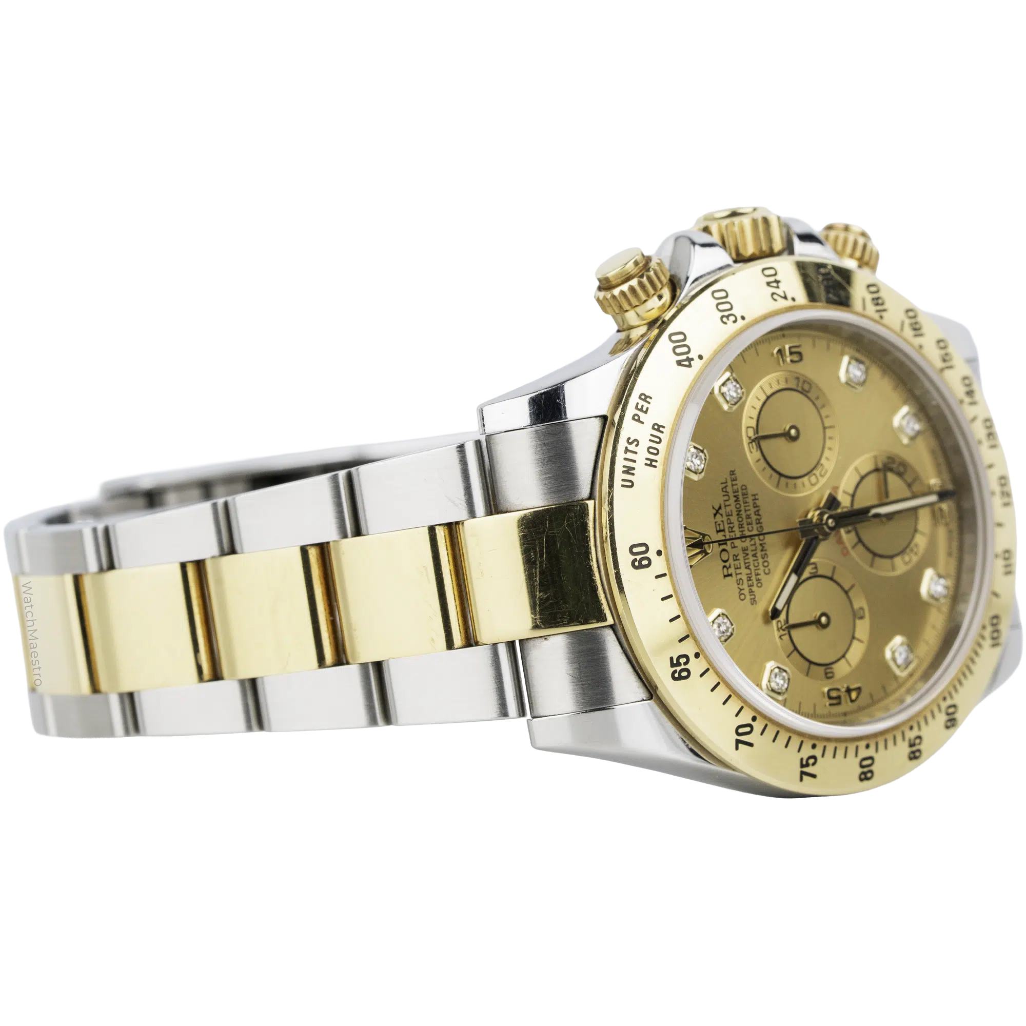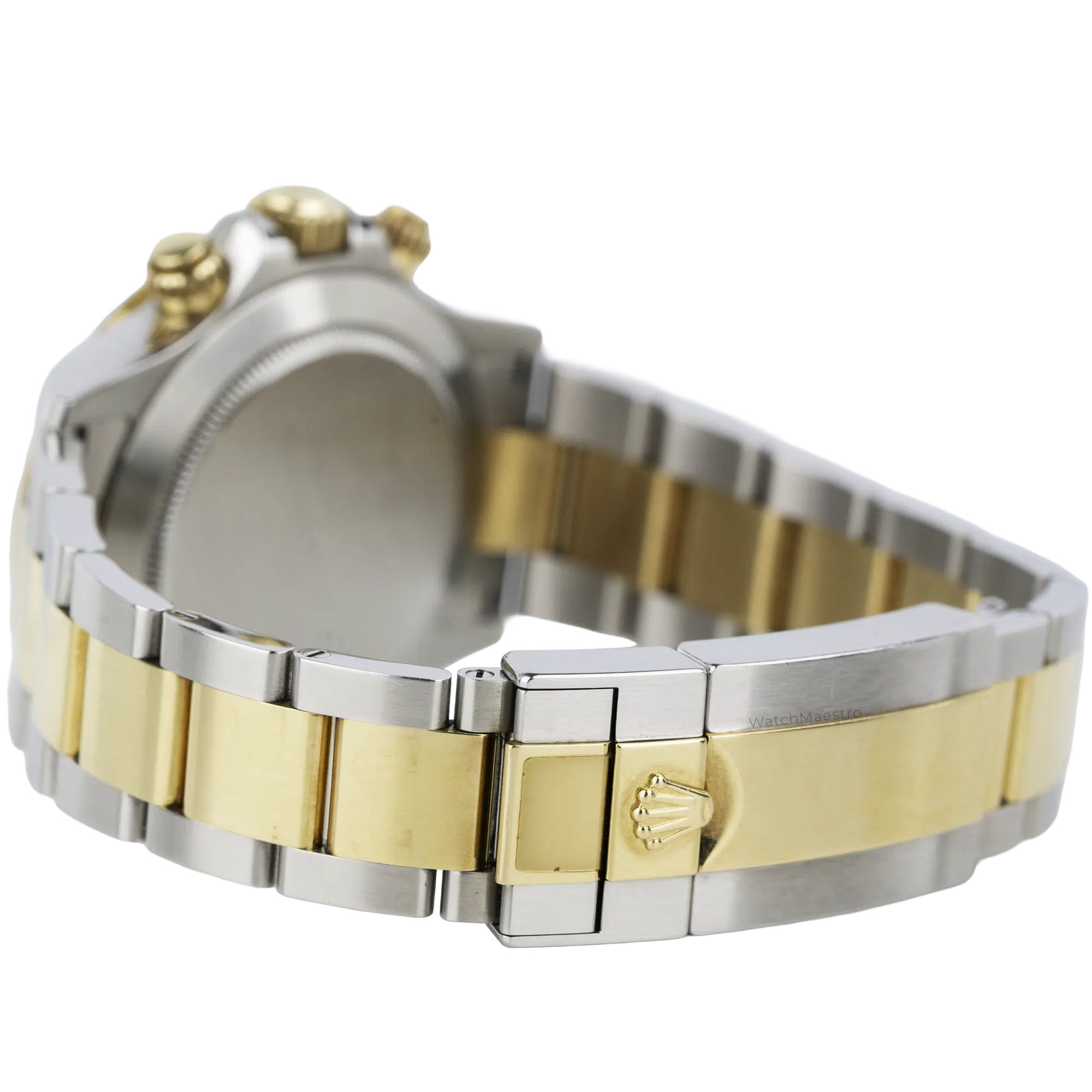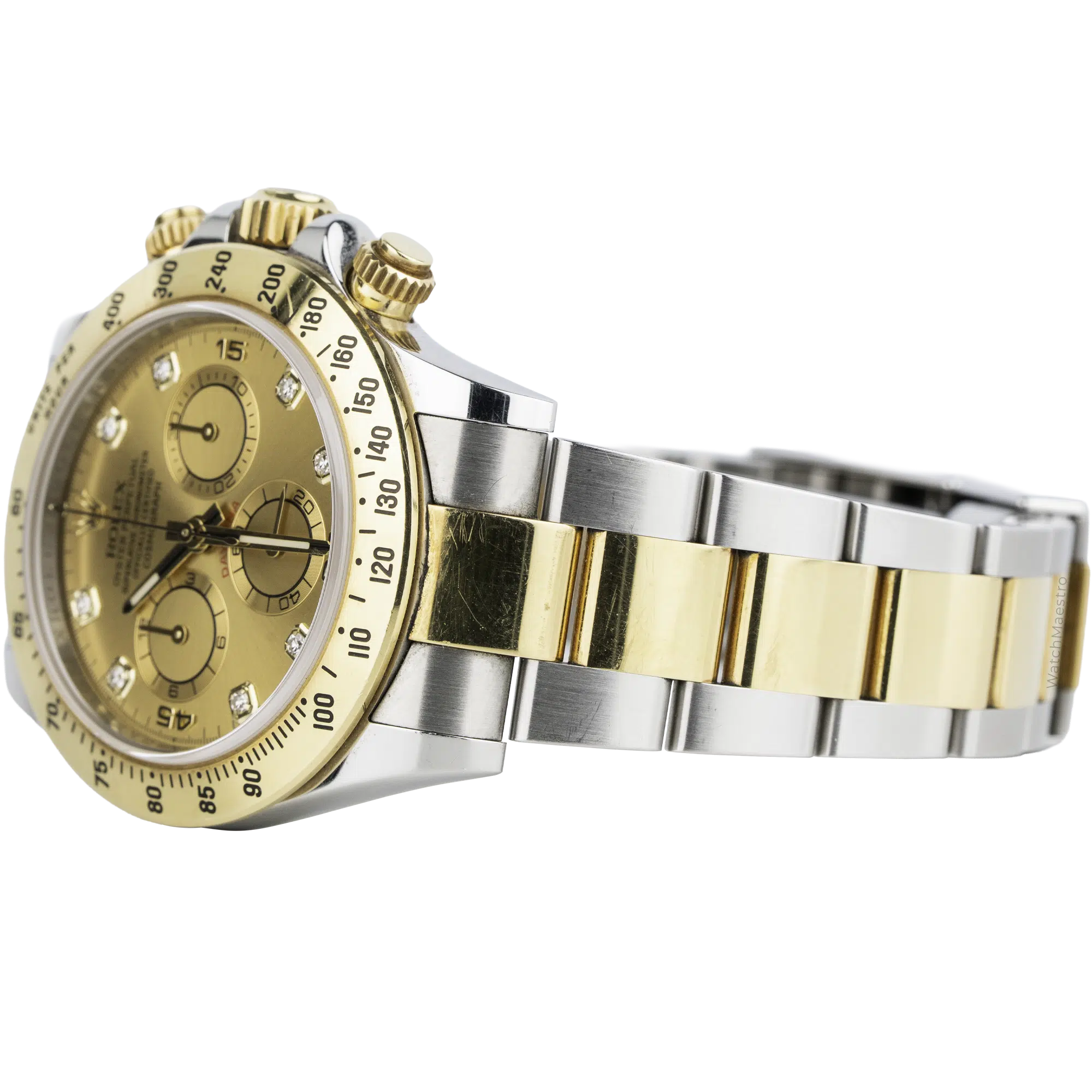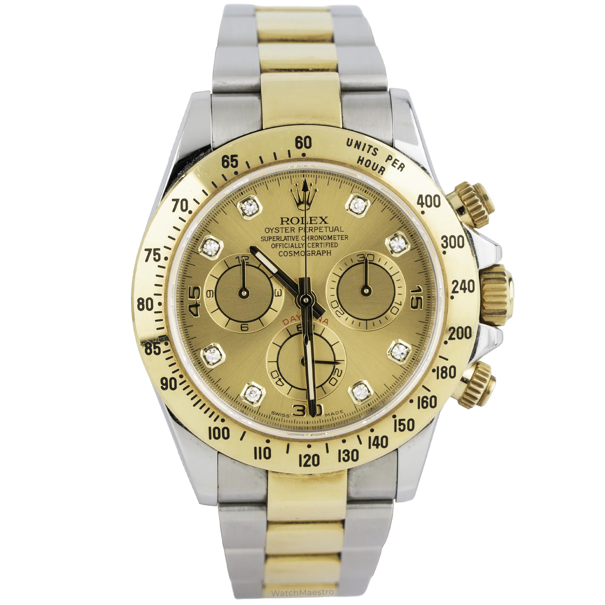 Introducing the pre-owned Rolex Daytona 2019 model in excellent condition. This two-tone watch features 18ct yellow gold and Oystersteel. The watch features a 40mm Champagne Dial adorned with diamonds on the hour markers. Complete with box and papers, it’s a timeless masterpiece of elegance and precision.
