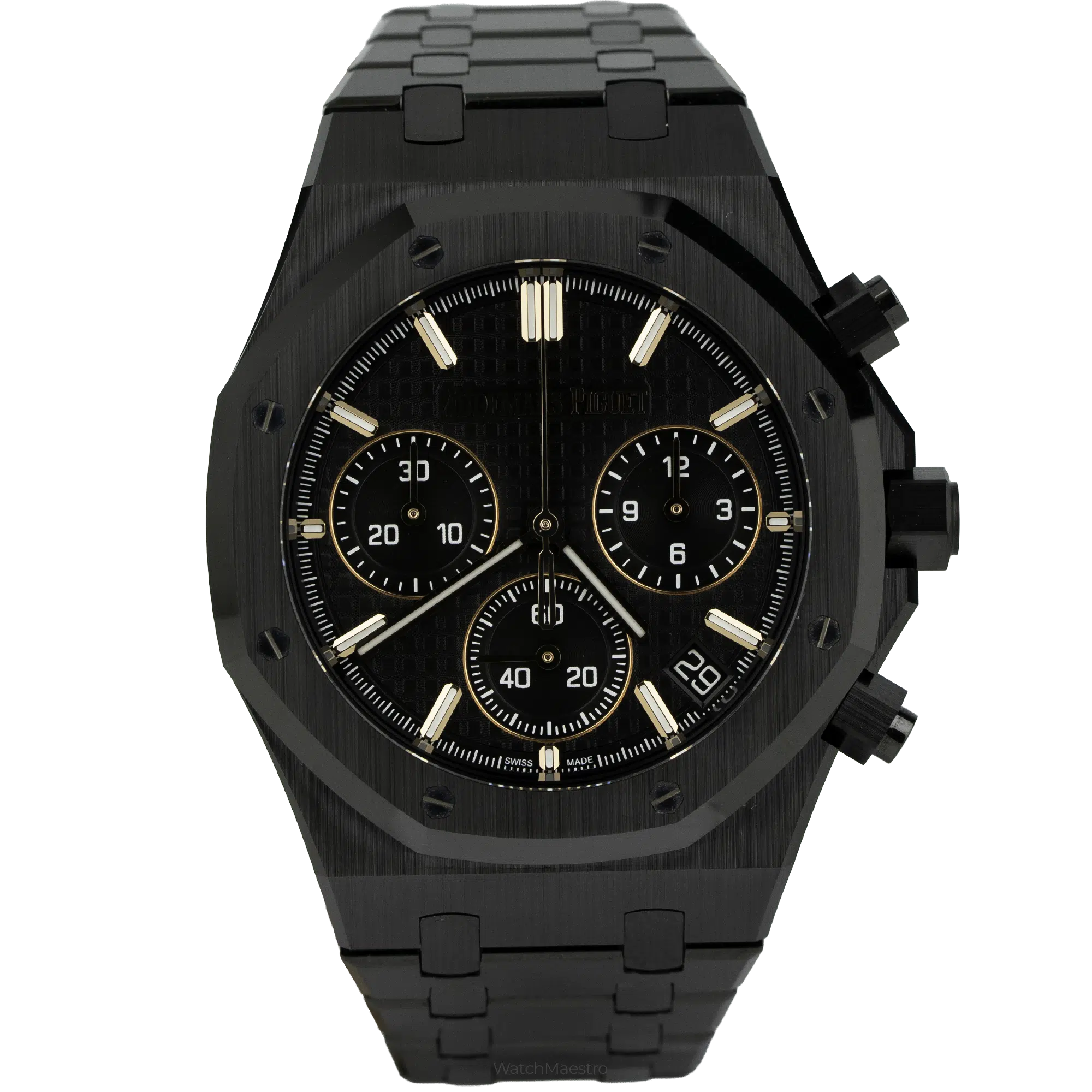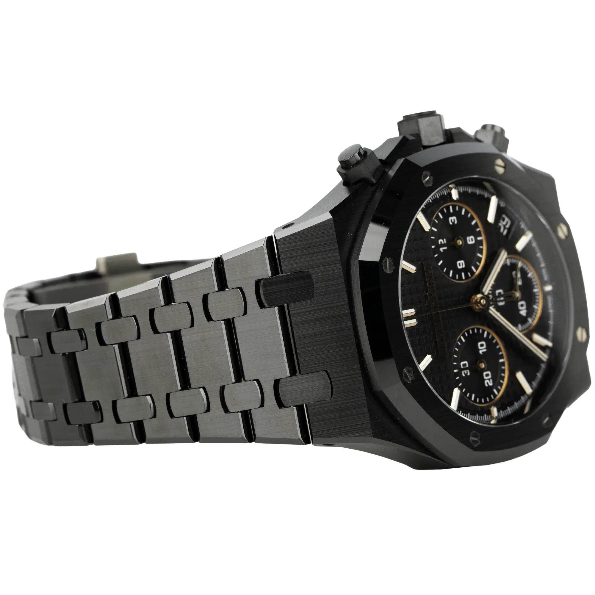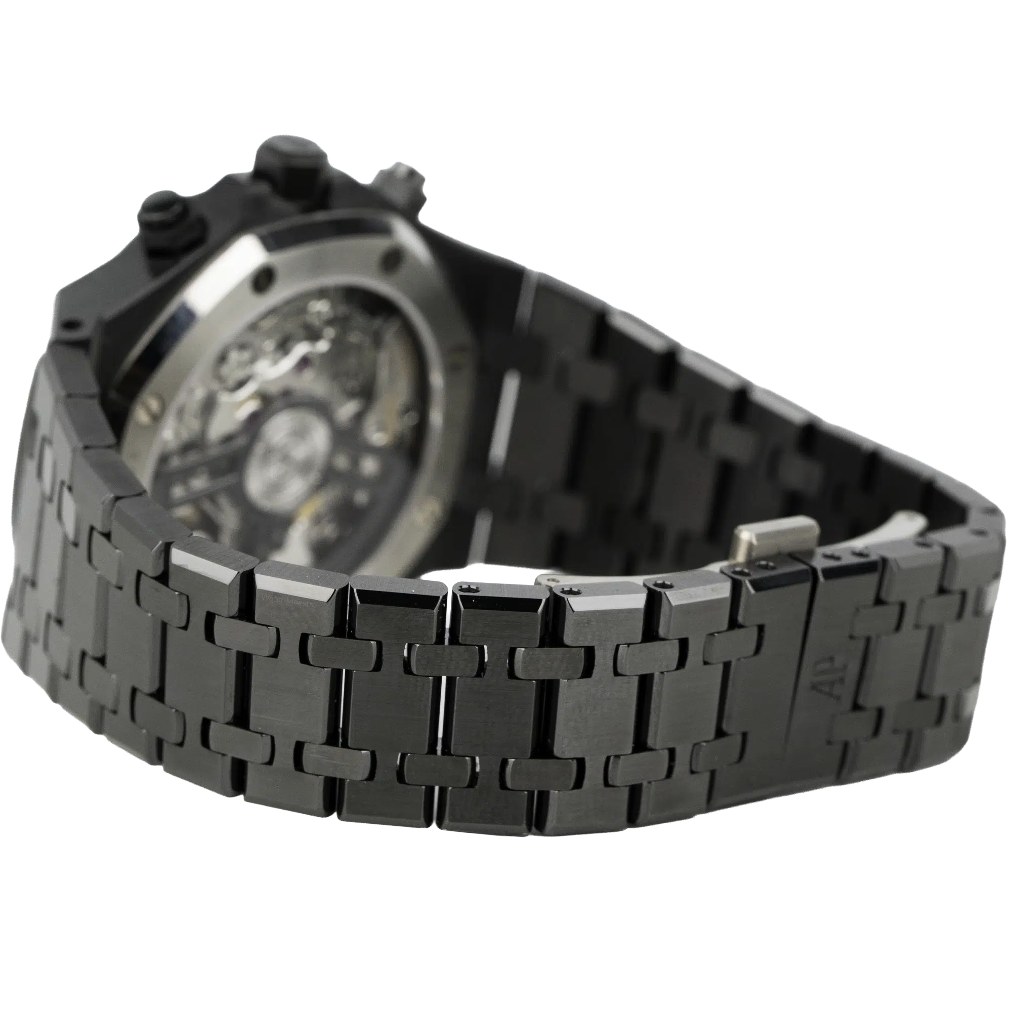 The 2025 Audemars Piguet Royal Oak is available in unworn condition, featuring a full black ceramic construction, which is extremely hard to scratch. The case is 41mm wide and displays a black dial with the popular and beautiful “Grande Tapisserie” pattern. The pink gold hour-markers and hands with a luminescent coating for reading in the dark are the best features of this watch. It has an automatic or self-winding movement, and the date window sits between 4 and 5 o’clock. The finishing is a matching black ceramic bracelet, which uses the secure AP folding clasp.