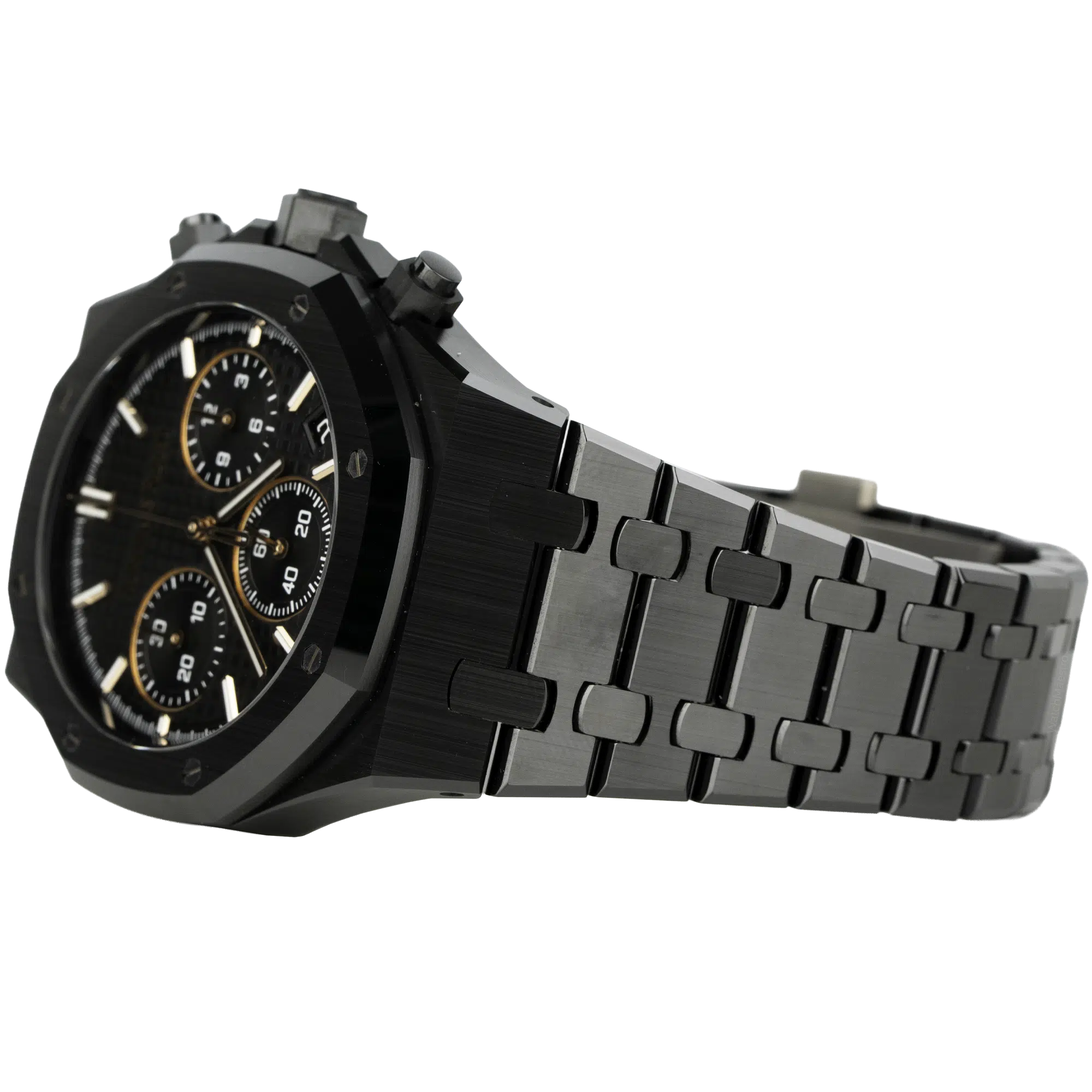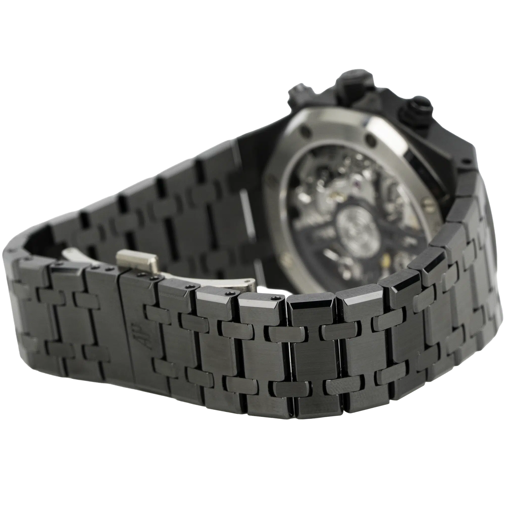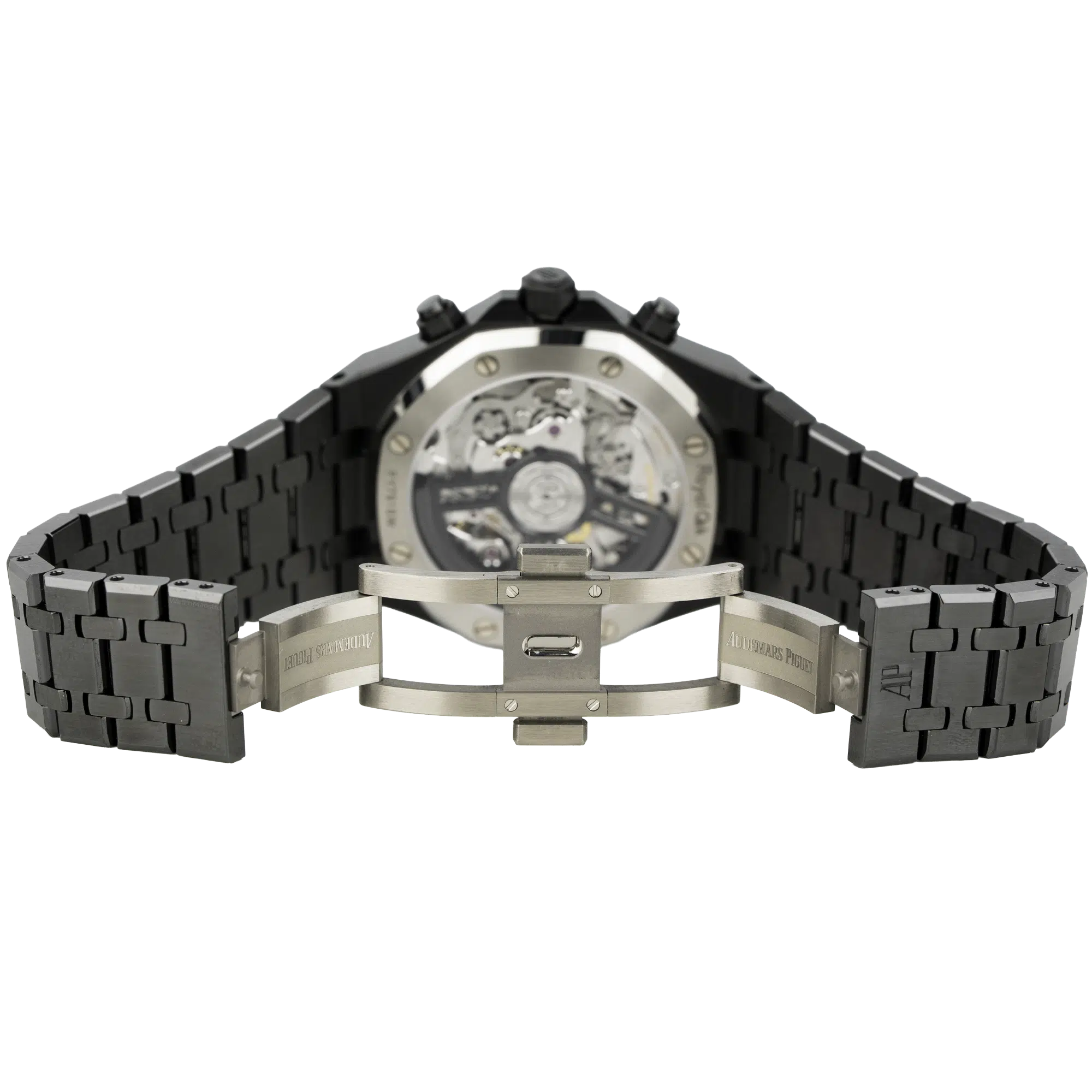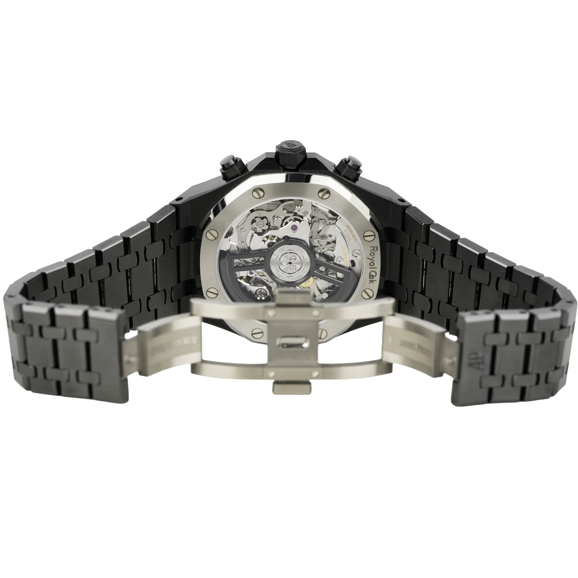 The 2025 Audemars Piguet Royal Oak is available in unworn condition, featuring a full black ceramic construction, which is extremely hard to scratch. The case is 41mm wide and displays a black dial with the popular and beautiful “Grande Tapisserie” pattern. The pink gold hour-markers and hands with a luminescent coating for reading in the dark are the best features of this watch. It has an automatic or self-winding movement, and the date window sits between 4 and 5 o’clock. The finishing is a matching black ceramic bracelet, which uses the secure AP folding clasp.