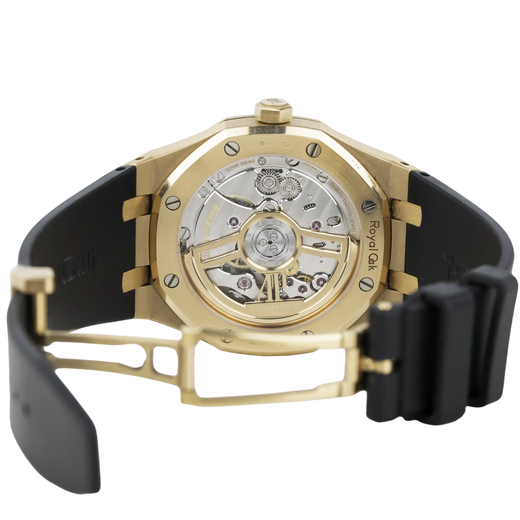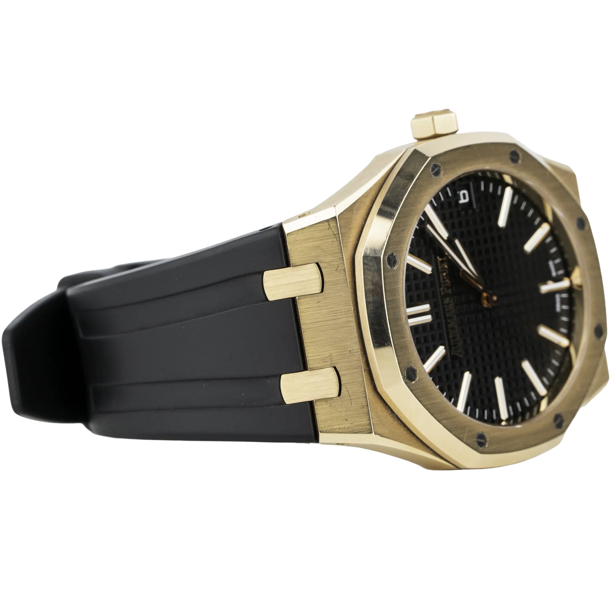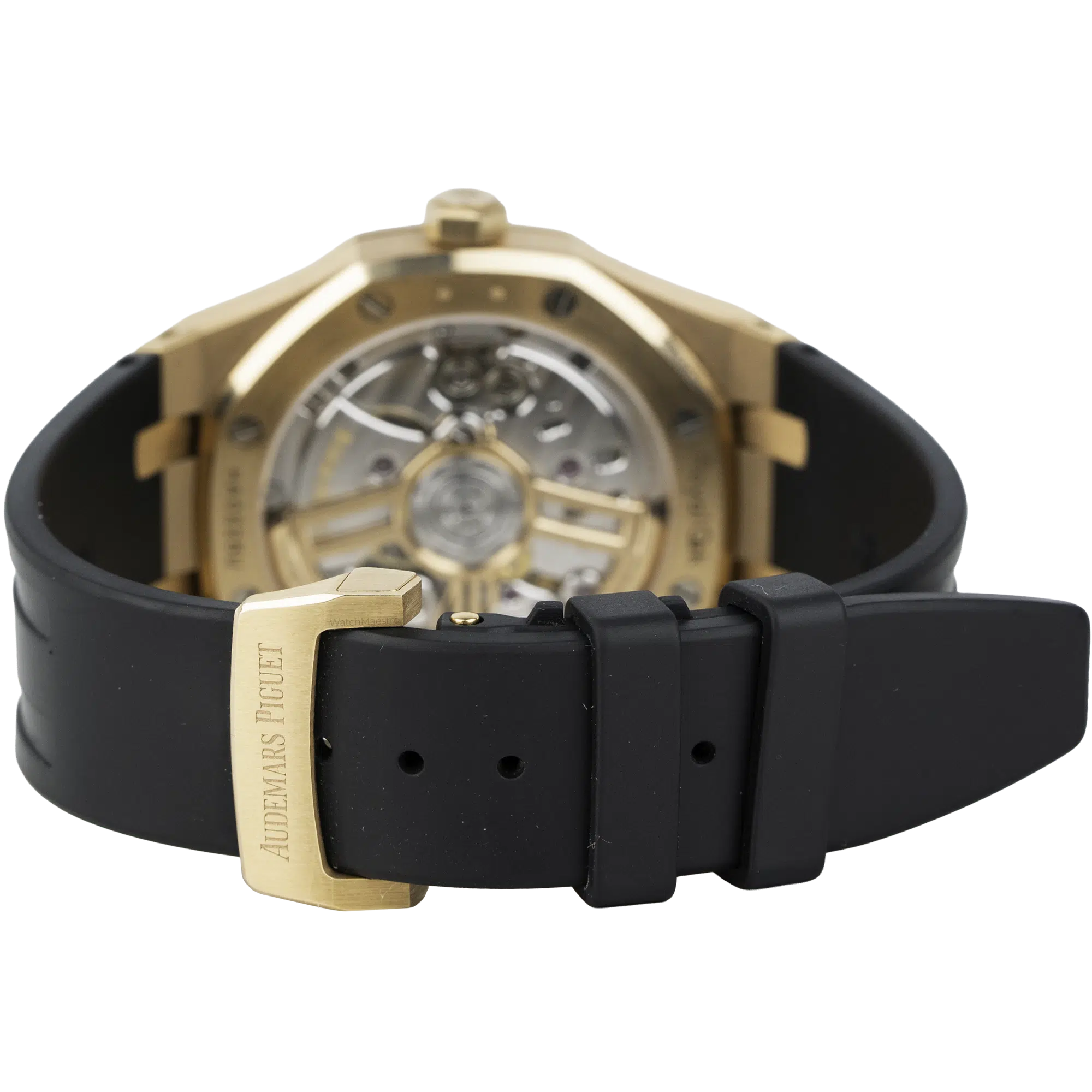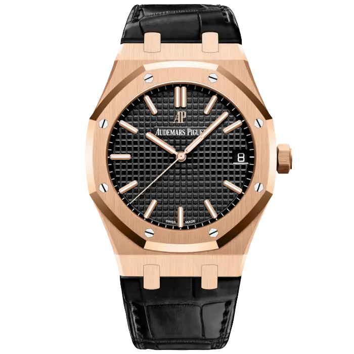 This 2023 Audemars Piguet Royal Oak has a sharp 41mm case made from brushed and polished 18-carat pink gold. The face shows the iconic black “Grande Tapisserie” dial with pink gold applied hour-markers and Royal Oak hands with luminescent coating. There is a date window at the 3 o’clock position. The watch has the Calibre 4302 self-winding movement, which is visible through the sapphire crystal caseback. Besides, a hand-stitched black alligator strap secures the watch with an 18-carat pink gold AP folding clasp.