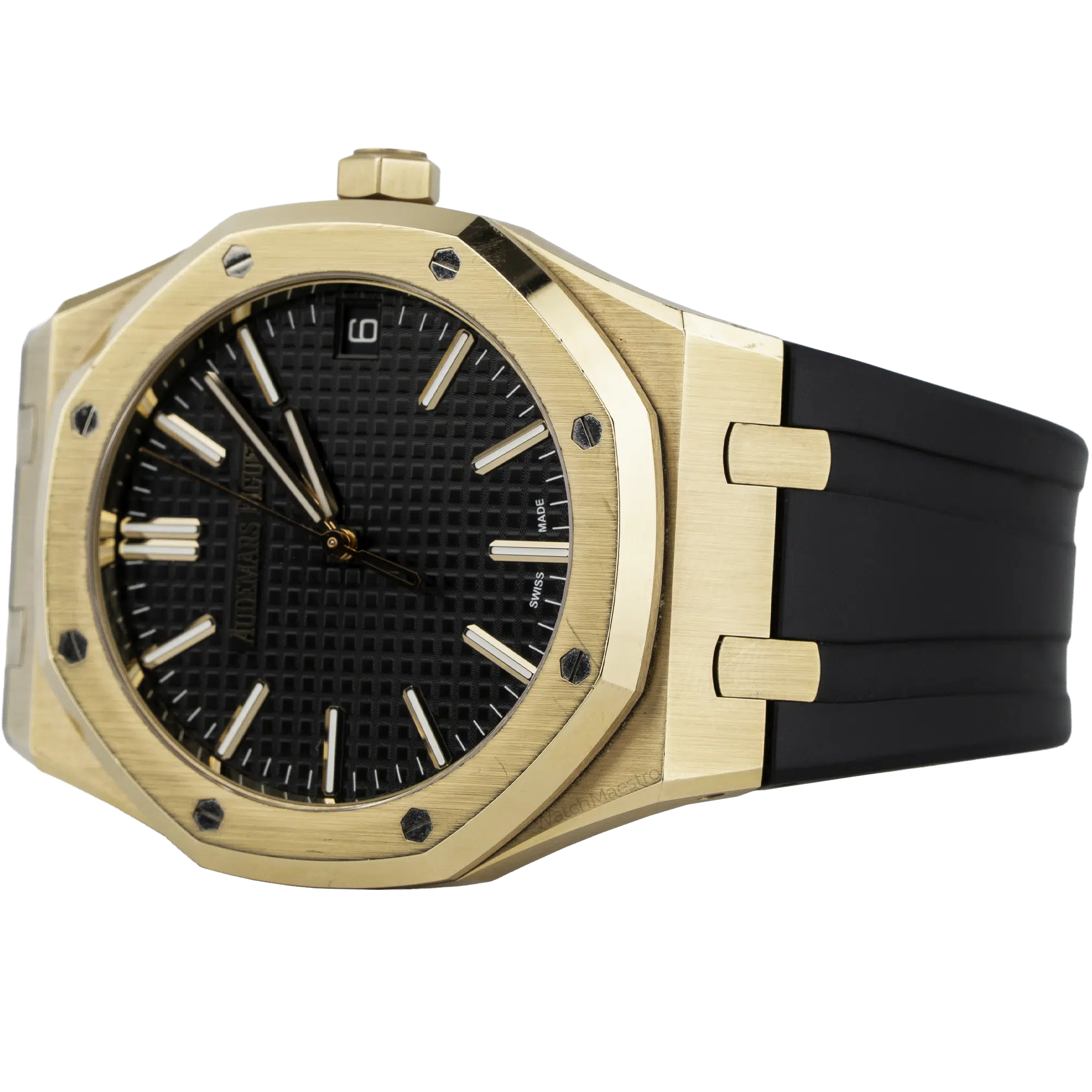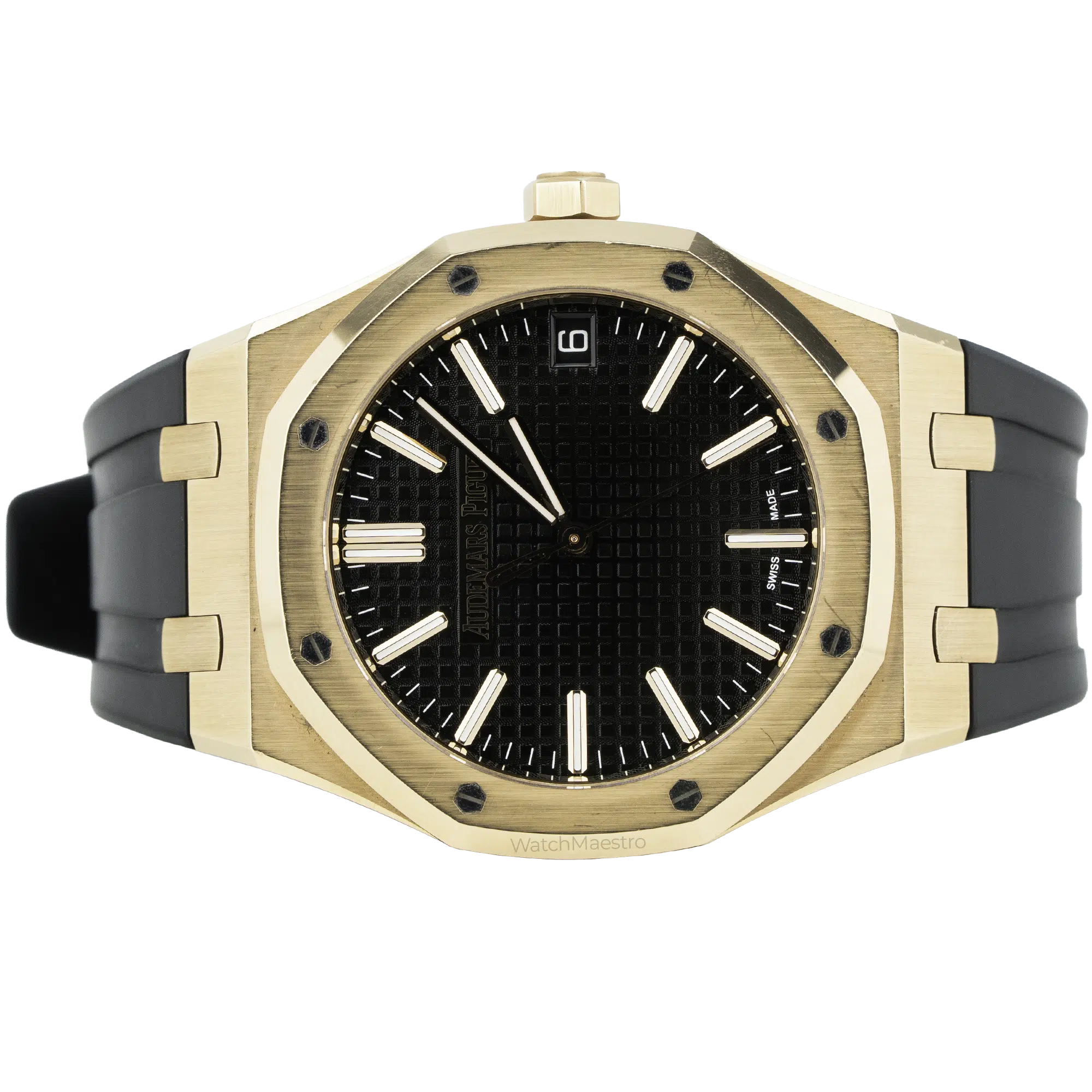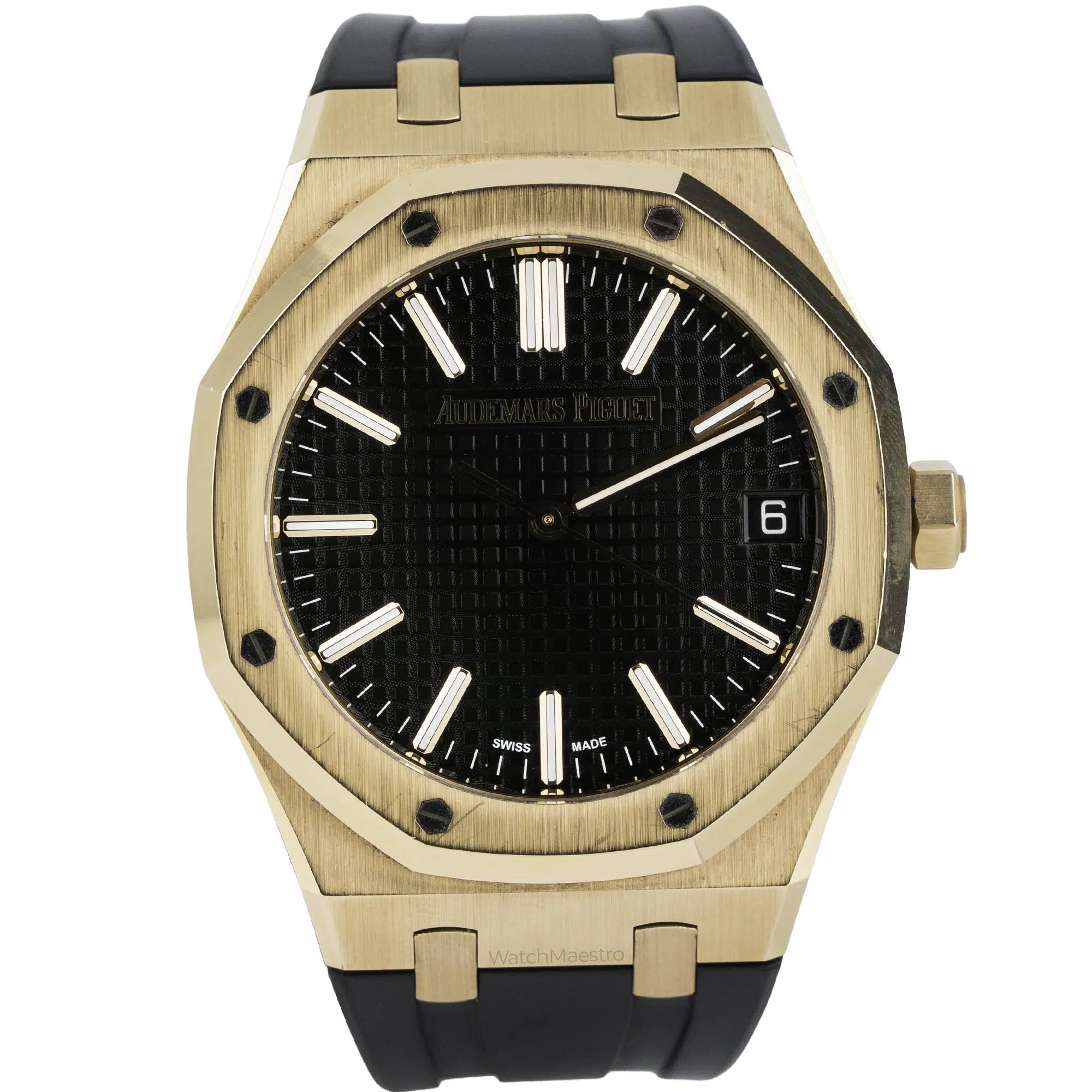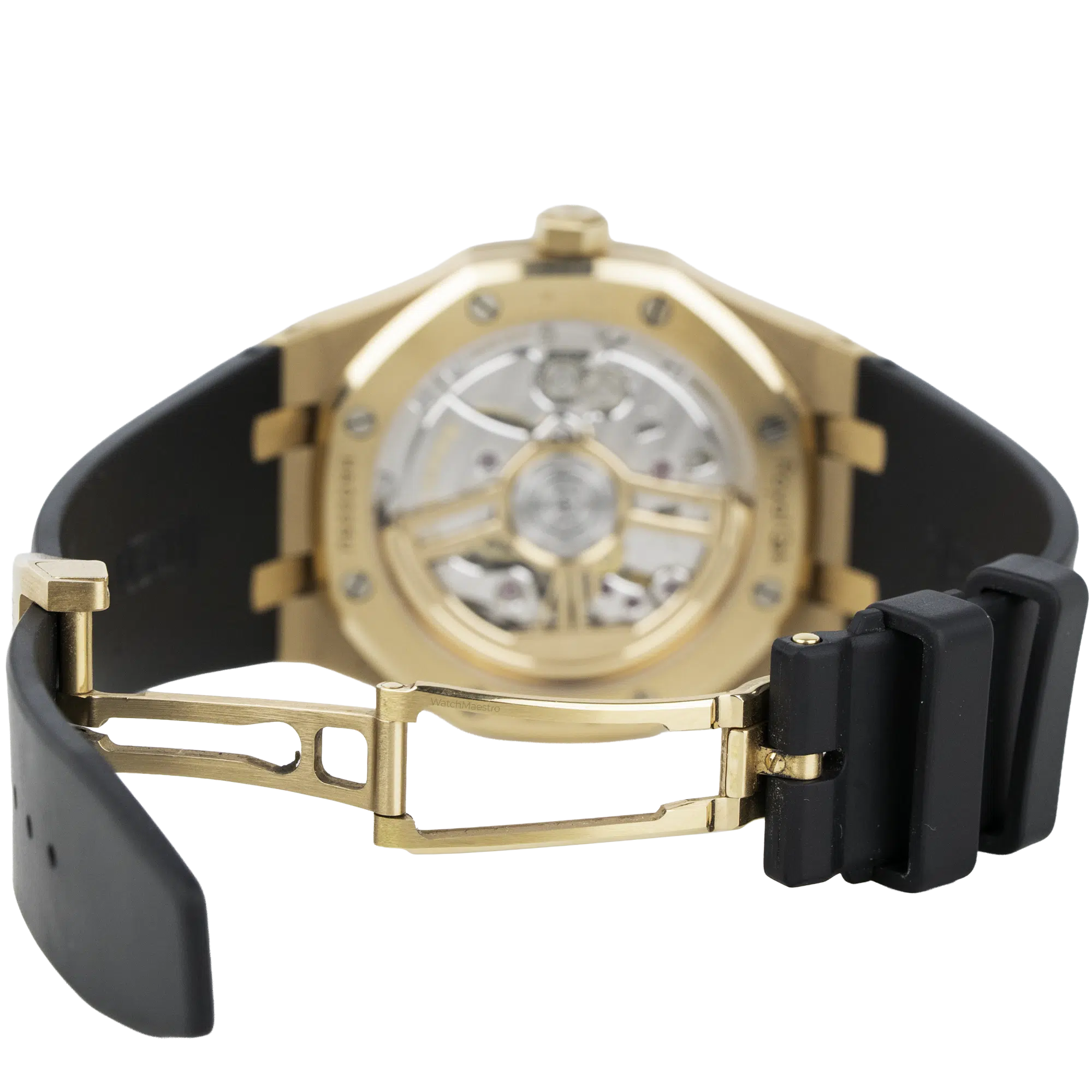 This 2023 Audemars Piguet Royal Oak has a sharp 41mm case made from brushed and polished 18-carat pink gold. The face shows the iconic black “Grande Tapisserie” dial with pink gold applied hour-markers and Royal Oak hands with luminescent coating. There is a date window at the 3 o’clock position. The watch has the Calibre 4302 self-winding movement, which is visible through the sapphire crystal caseback. Besides, a hand-stitched black alligator strap secures the watch with an 18-carat pink gold AP folding clasp.