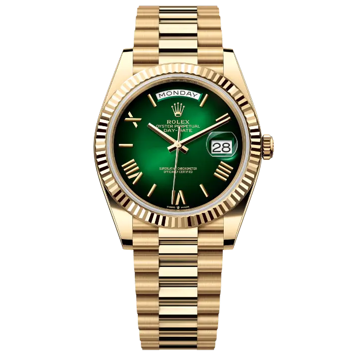 The Rolex Day-Date 40 ref. 228238 in 18K Yellow gold is one of the most elegant takes on the President’s watch. Its Green ombré dial fades from a lighter center to a darker outer edge, giving depth and character to an already iconic design. Paired with the fluted bezel and President bracelet, it delivers everything the Day-Date is known for. Purchased in 2025, this unworn piece comes complete with its original box and papers.