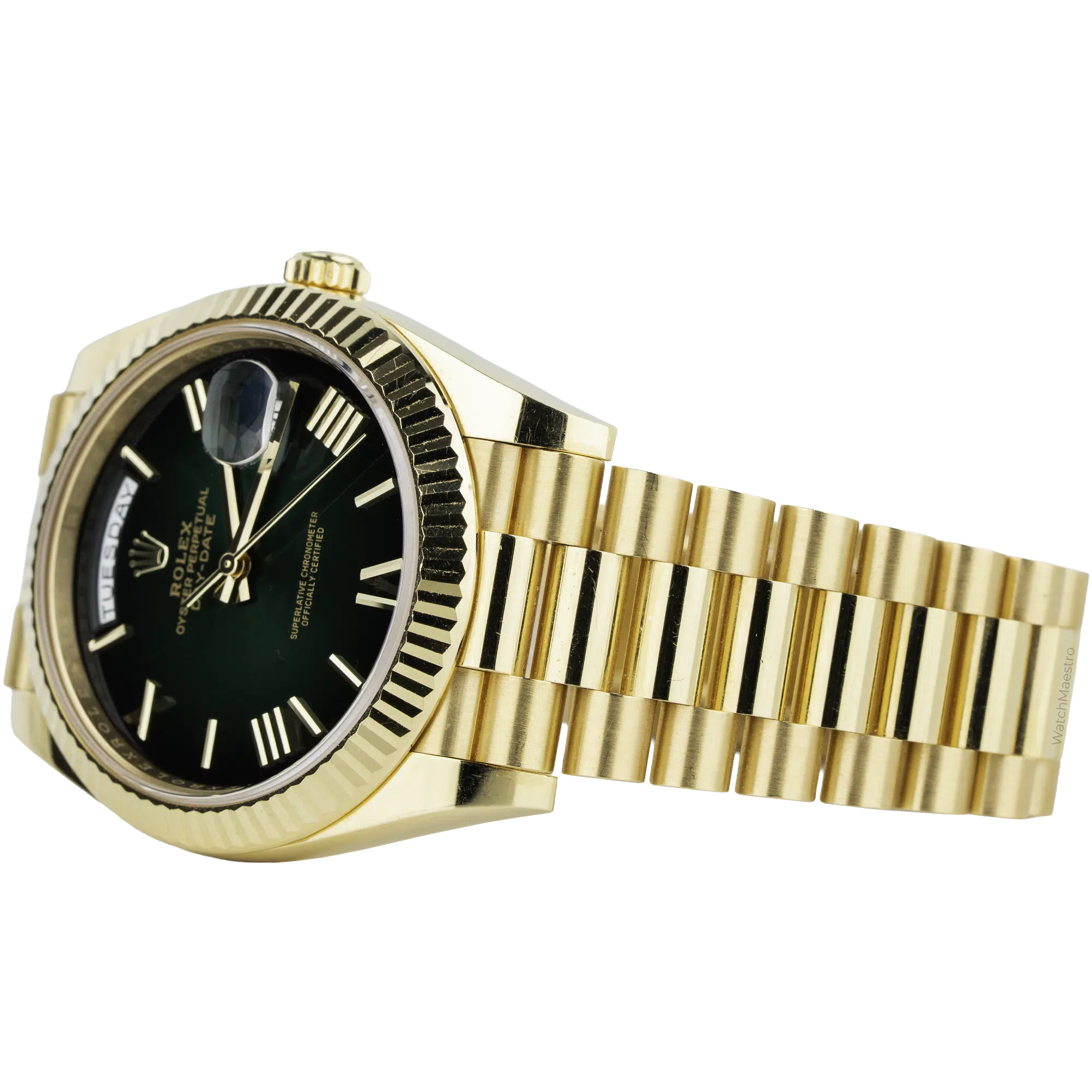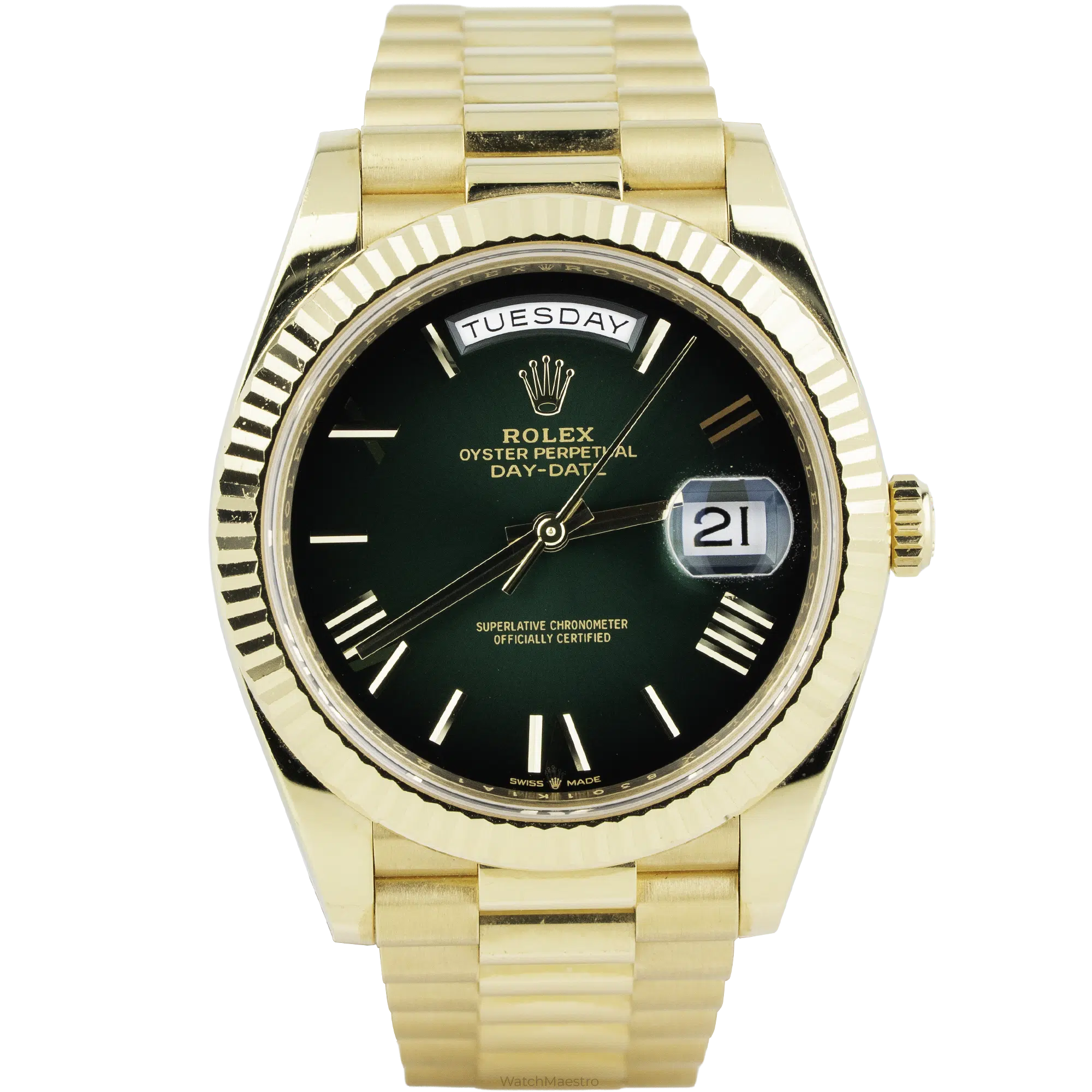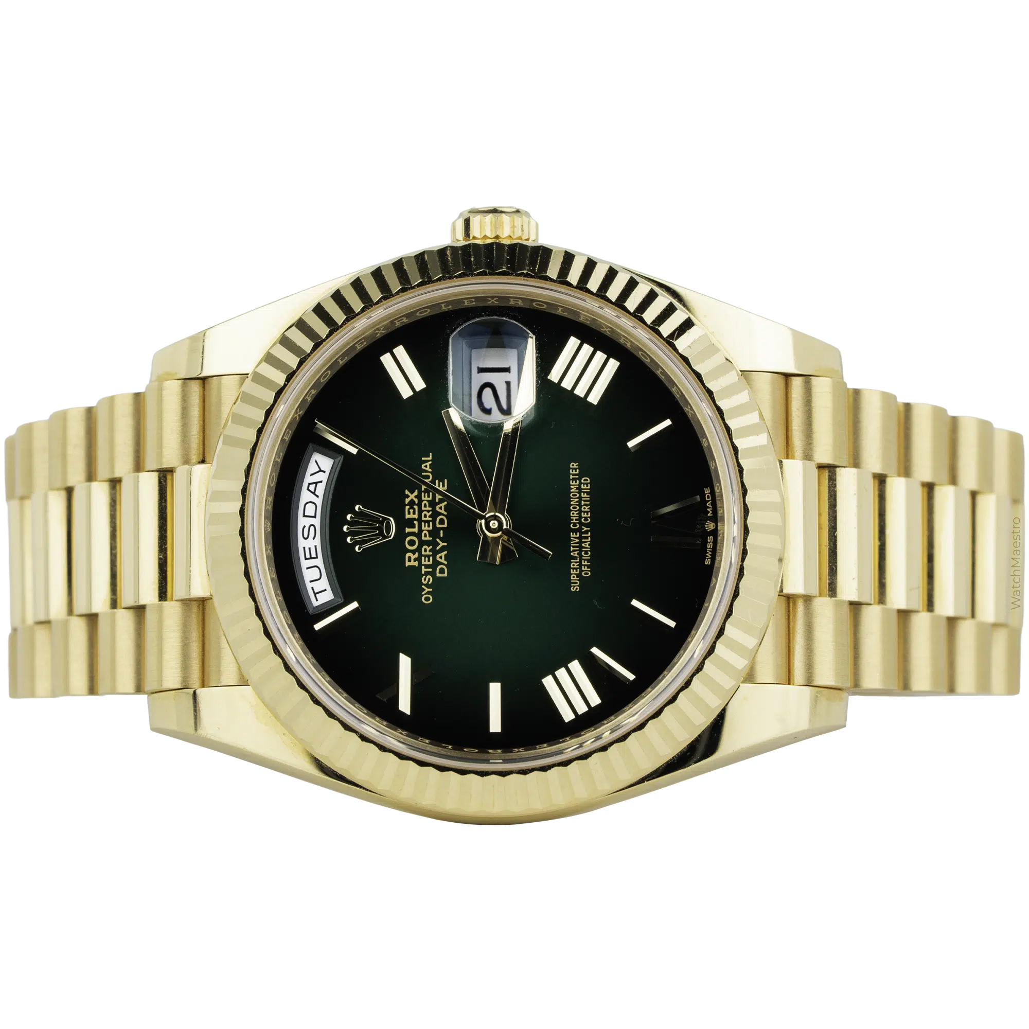 The Rolex Day-Date 40 reference 228238 has an 18k yellow gold case. It measures 40mm in diameter. A green ombre dial transitions to black at the outer edges, and the center surface displays a sunray finish. Solid gold Roman numerals with a faceted design mark the hours. A Cyclops lens sits over the date window. The day aperture rests at the twelve o’clock position. Besides, gold hands and the Rolex crown logo complete the dial. A fluted bezel surrounds the sapphire crystal.