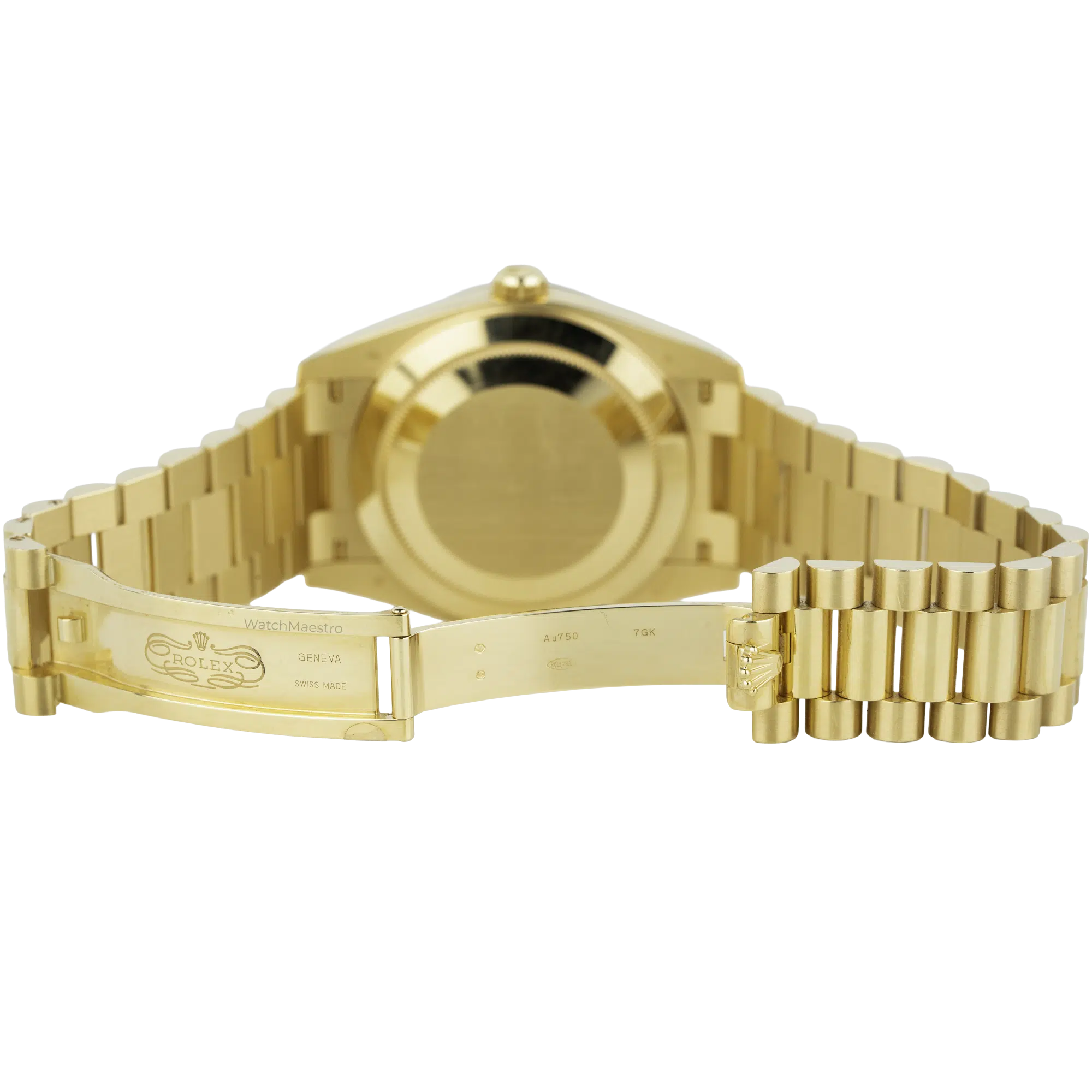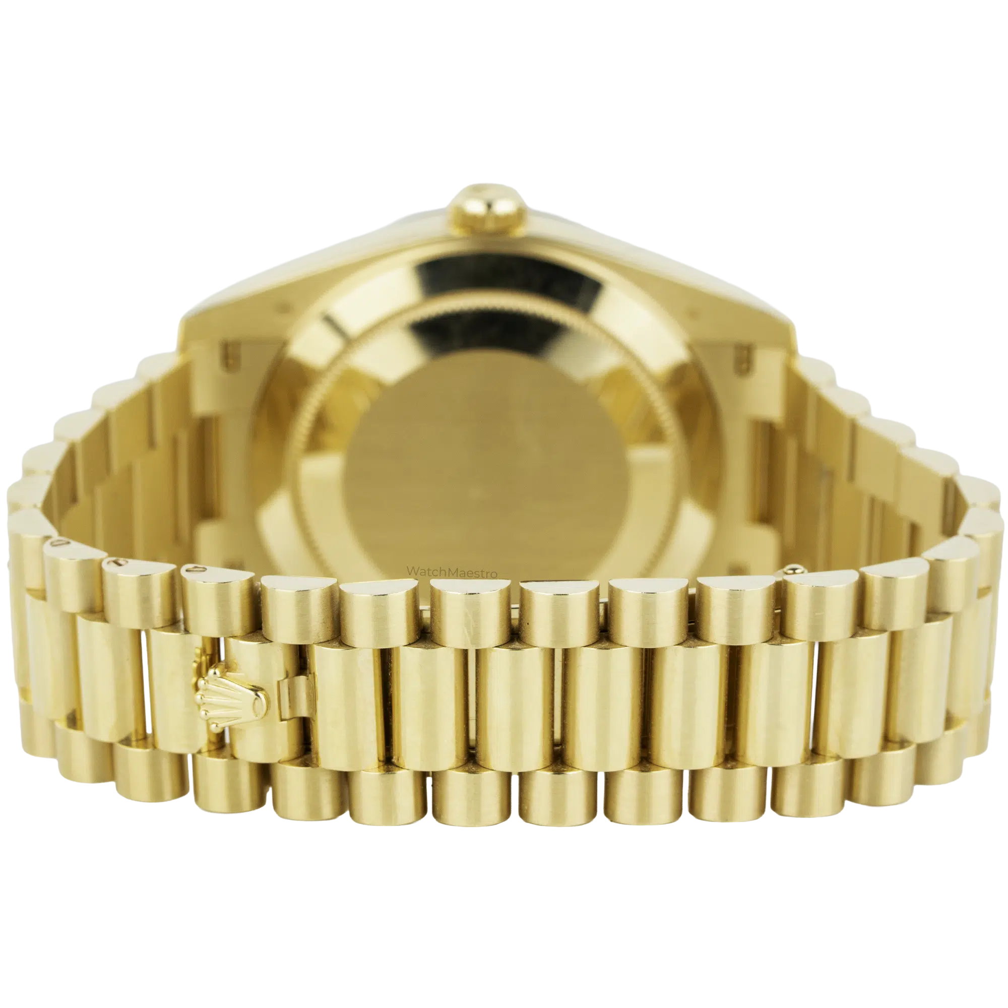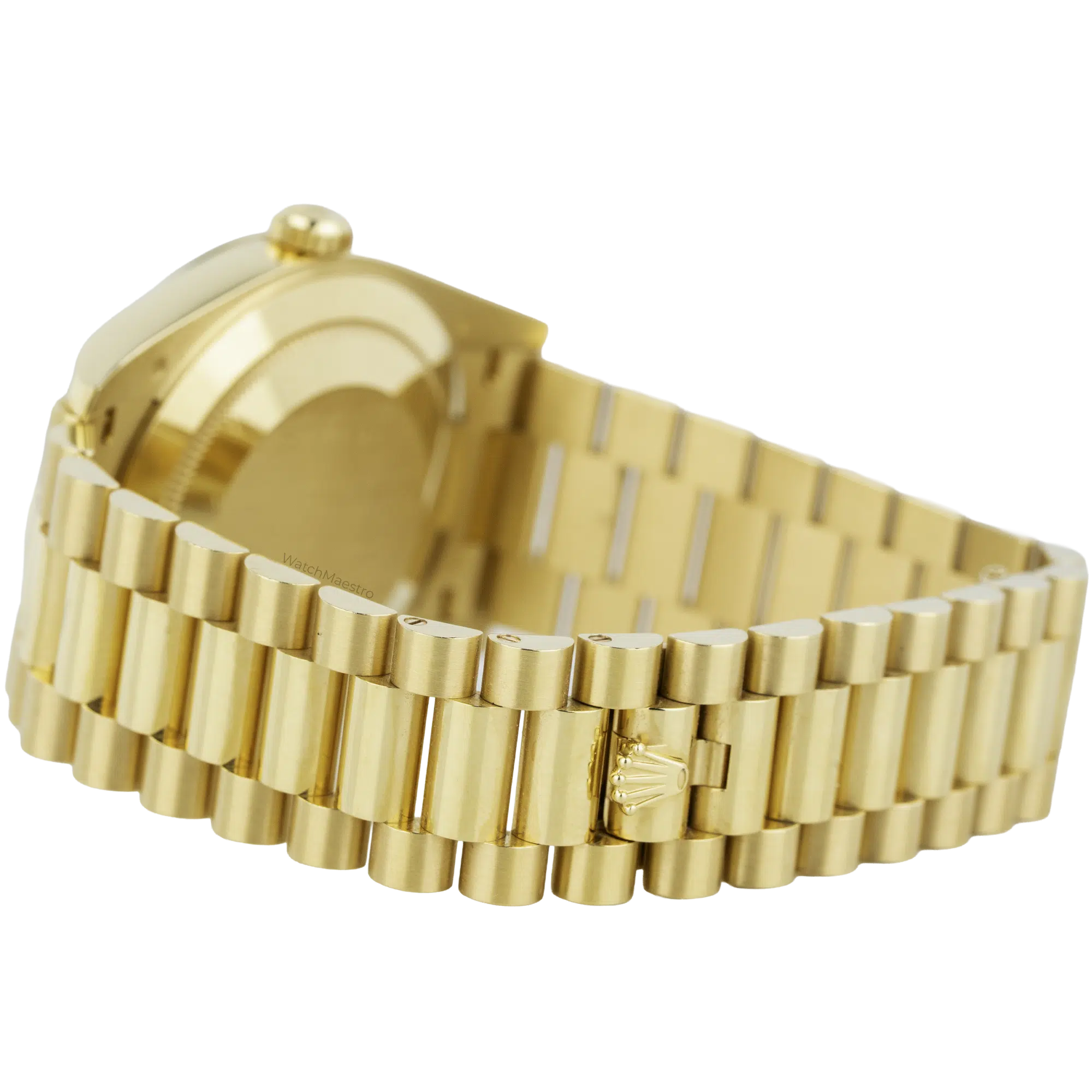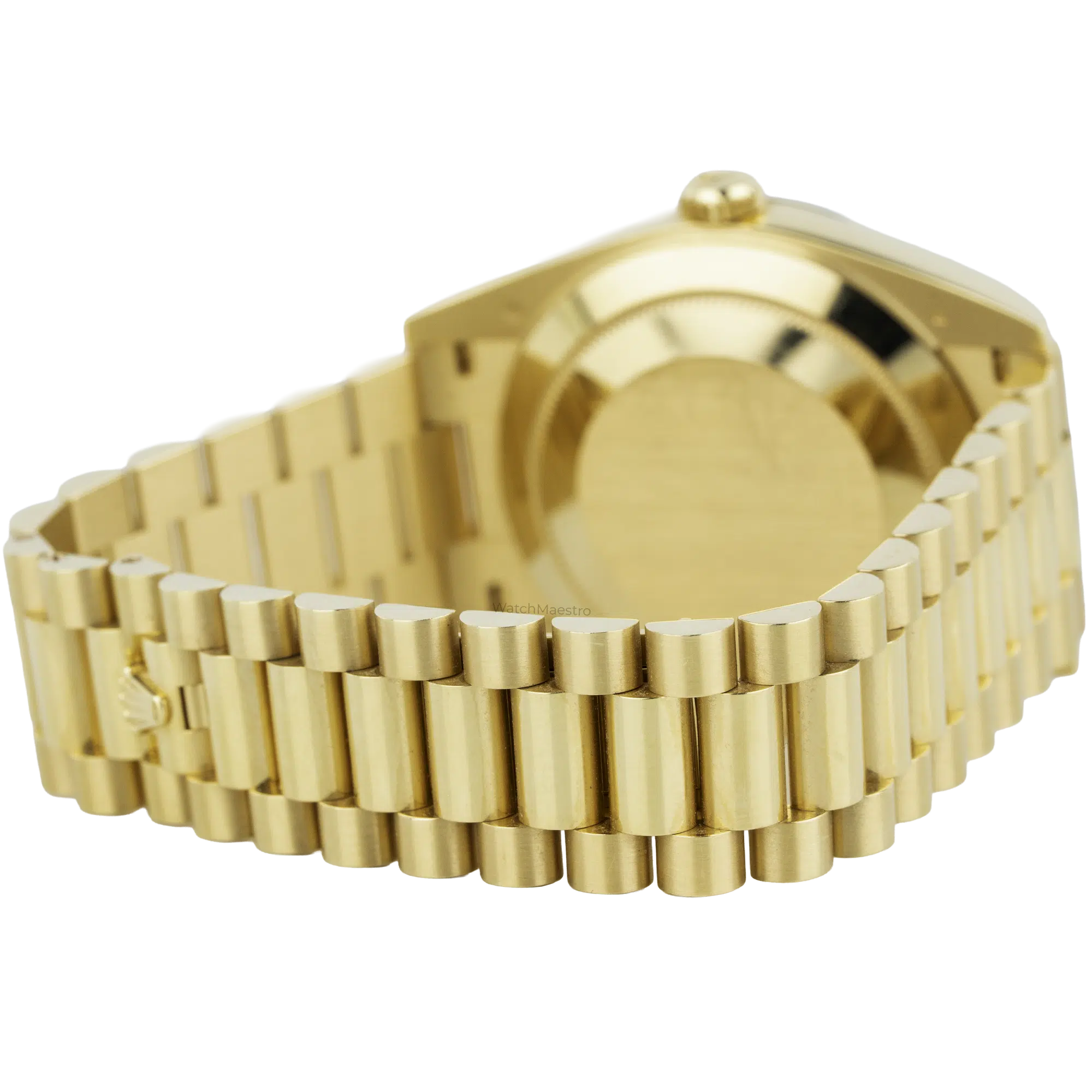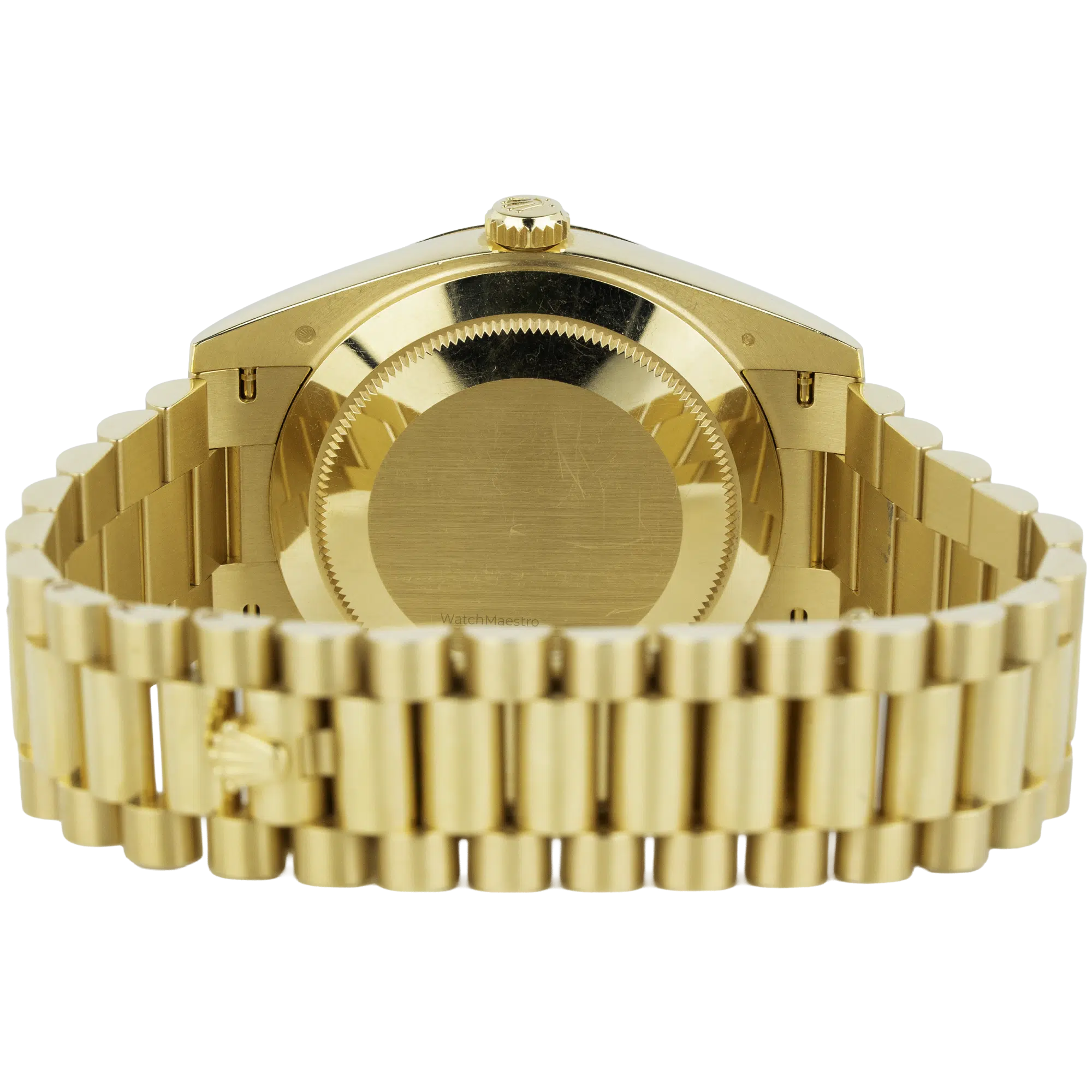 The 2024 timepiece includes the President bracelet and semi-circular three-piece links, which form the solid yellow gold band. A concealed folding Crownclasp secures the watch to the wrist, and the inner clasp mechanism displays gold hallmarks. Rolex equips this model with an automatic movement, which is the mechanical caliber 3255, delivering a 70-hour power reserve. A Twinlock winding crown provides water resistance. The watch remains in like-new condition. The complete package contains the original presentation box and official guarantee papers.