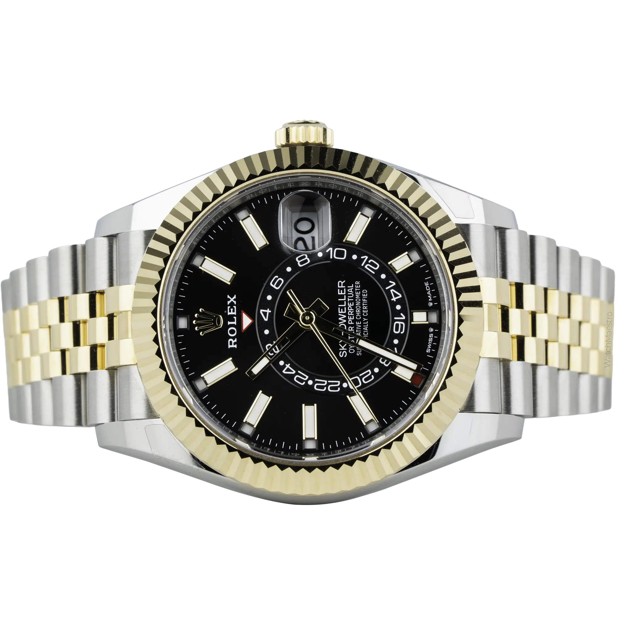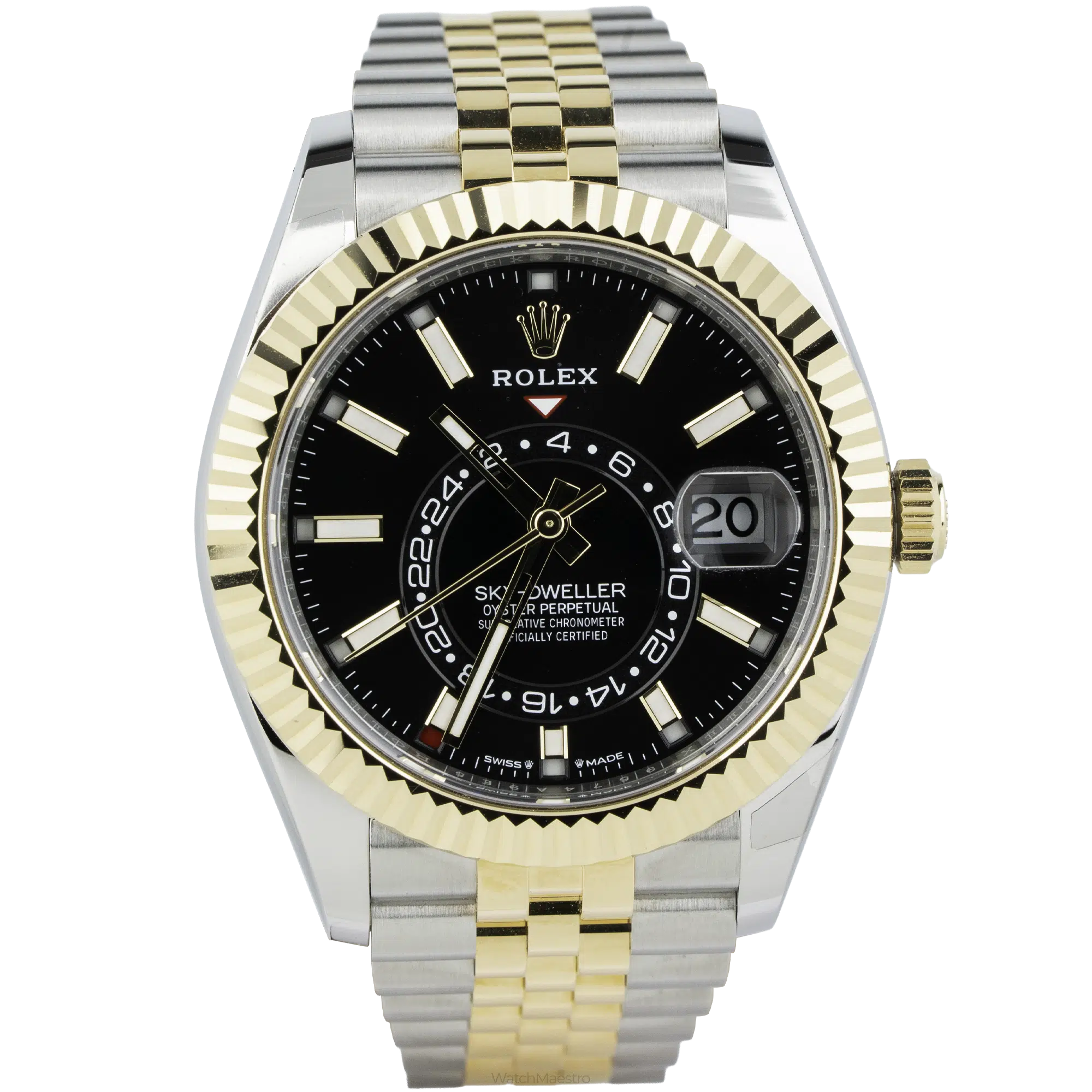 The unworn 2025 Rolex Sky-Dweller reference 336933 has a 42mm stainless steel case and an 18k yellow gold fluted Ring Command bezel. It has a complex automatic movement that powers an annual calendar and a dual time zone on the off-center 24-hour ring. The black dial uses bright baton indices instead of numerals. These indices sit next to the date window and the classic Cyclops lens. The watch comes complete with a two-tone yellow gold and steel Jubilee bracelet, original box, and papers.