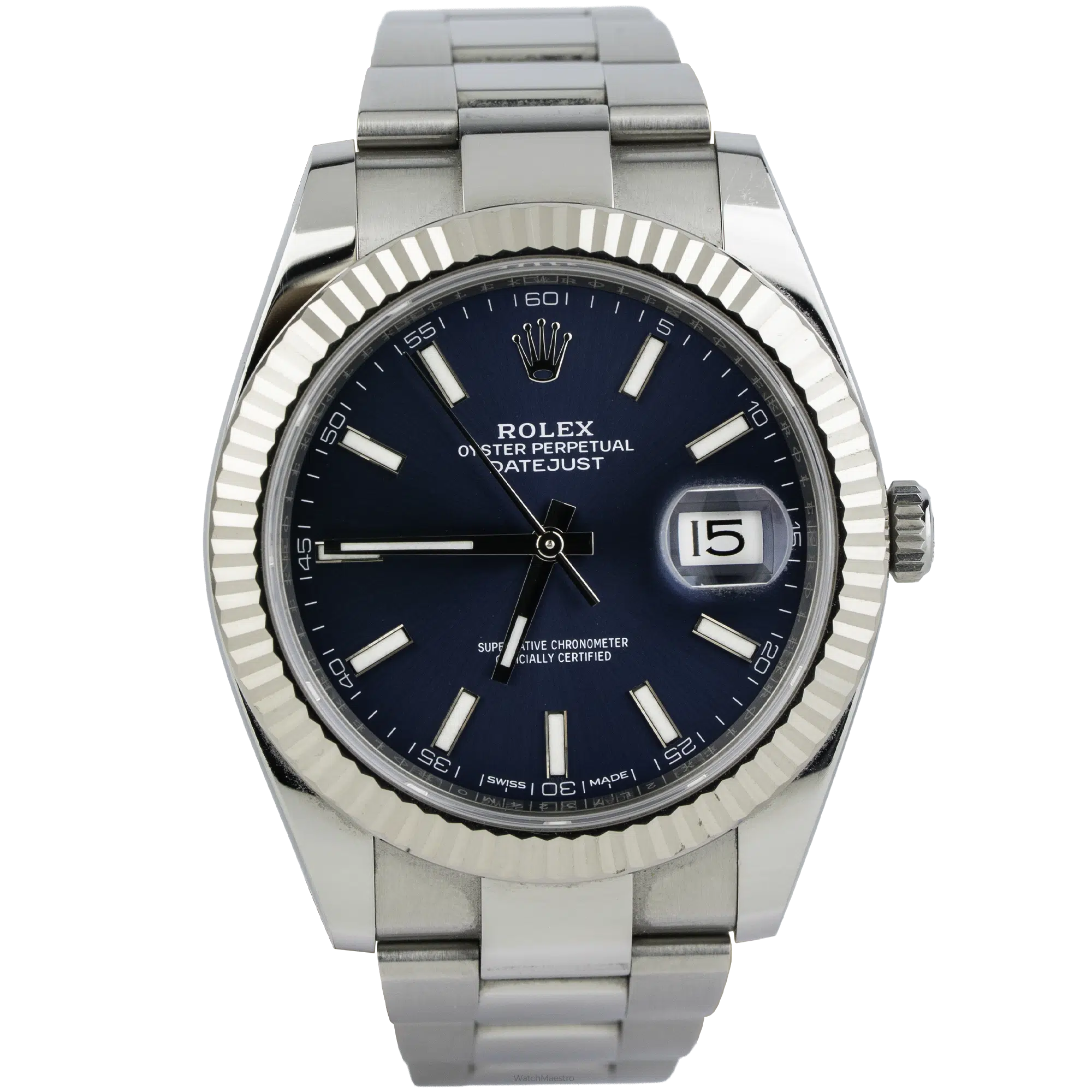 Rolex launched this Datejust 41 watch in 2017. The reference number is 126334. It is a men’s watch in like-new condition and comes complete with the original box and papers. The 41mm case is made of stainless steel and features a unique fluted bezel made of white gold. The dial is a deep blue color with stick index markers and no numerals, offering a clean and smooth layout. The Rolex Datejust 41 has a precise automatic movement and has a durable steel Oyster bracelet.