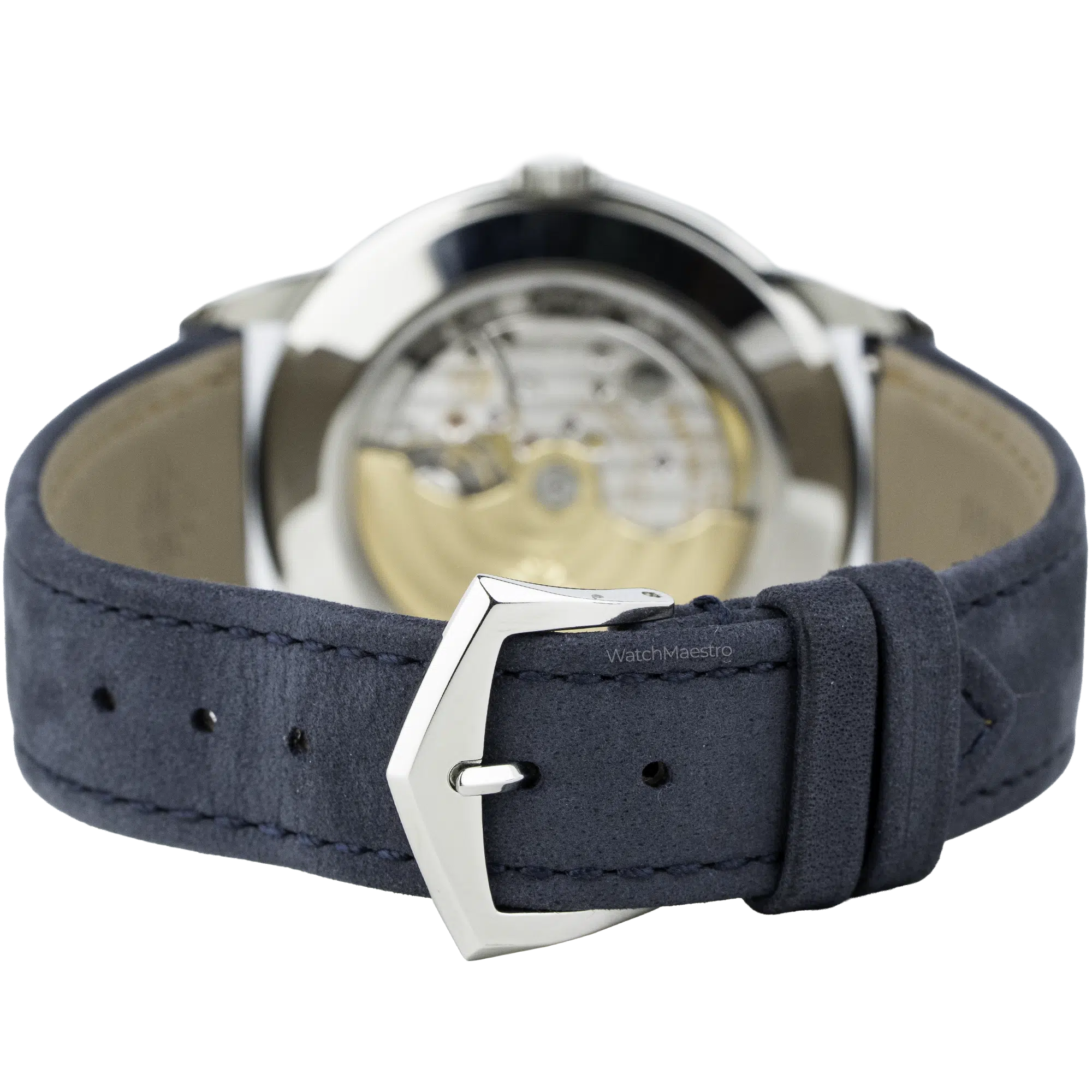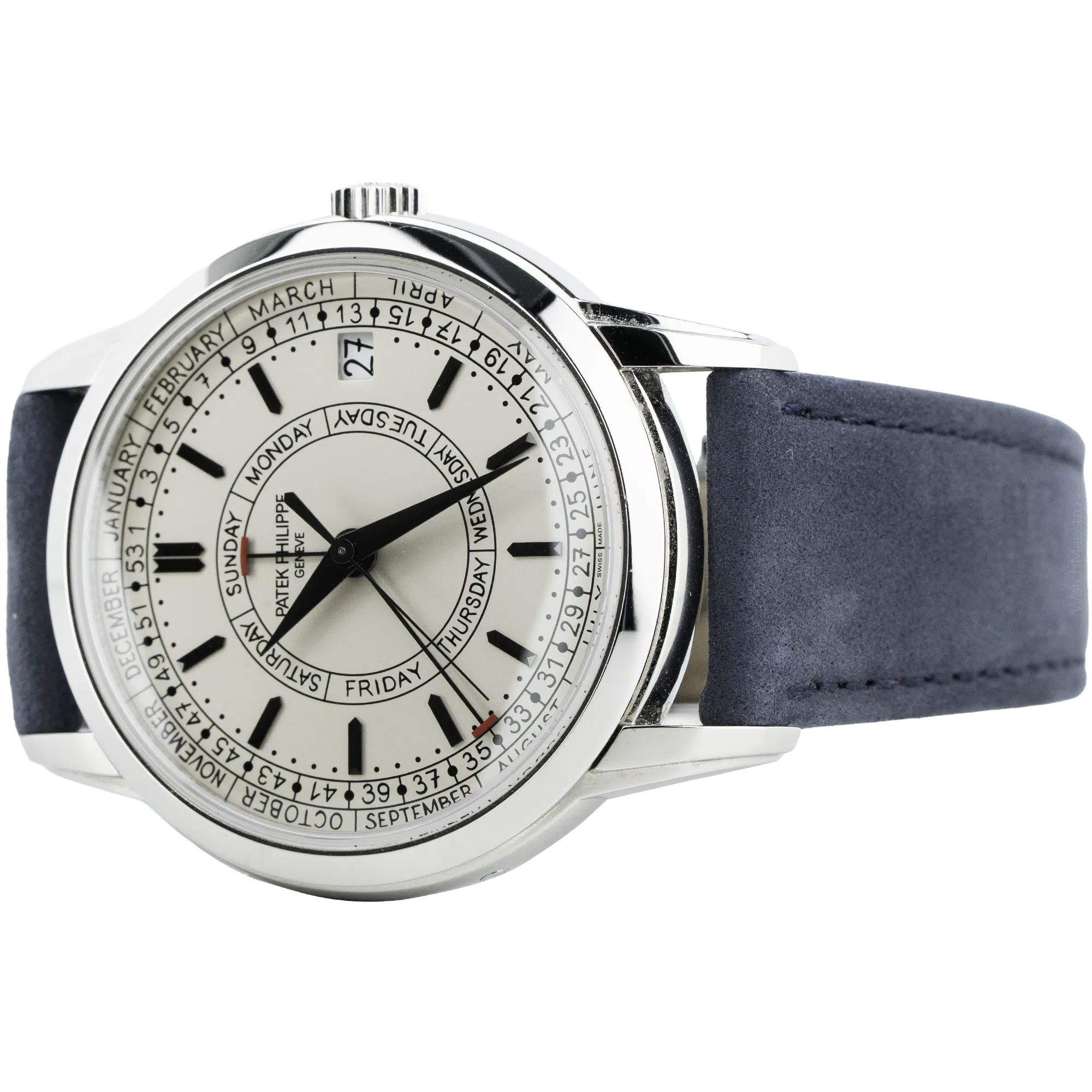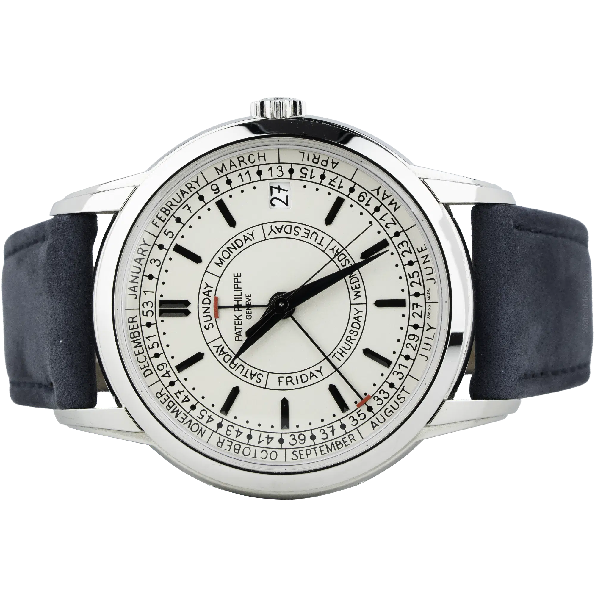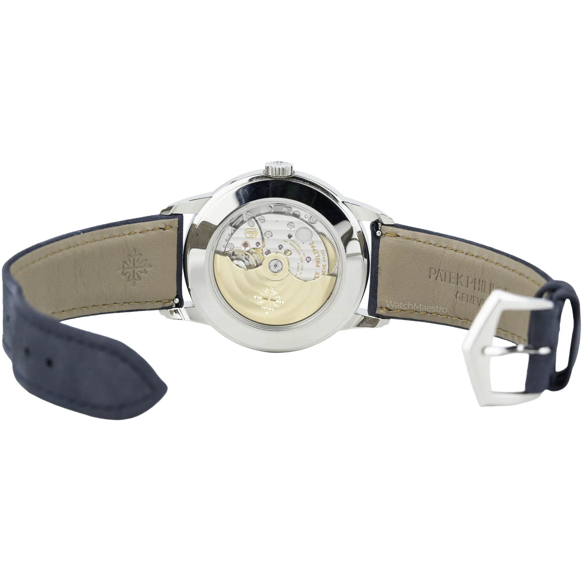 The 2023 Patek Philippe Calatrava 5212A-001 is a very special stainless steel watch available in like-new condition. Its polished 40mm case gives you nice comfort for daily wear. The silvery-white dial features unique handwritten-style typography and blackened hour markers, which offer a warm and personal feeling to the wearer. The complex automatic movement has a beautiful gold rotor that you can see through the sapphire glass back. The watch feels very nice against the skin thanks to the soft blue suede calfskin strap. The Calatrava watch shows you the day, date, week number, and month with special red-tipped hands.