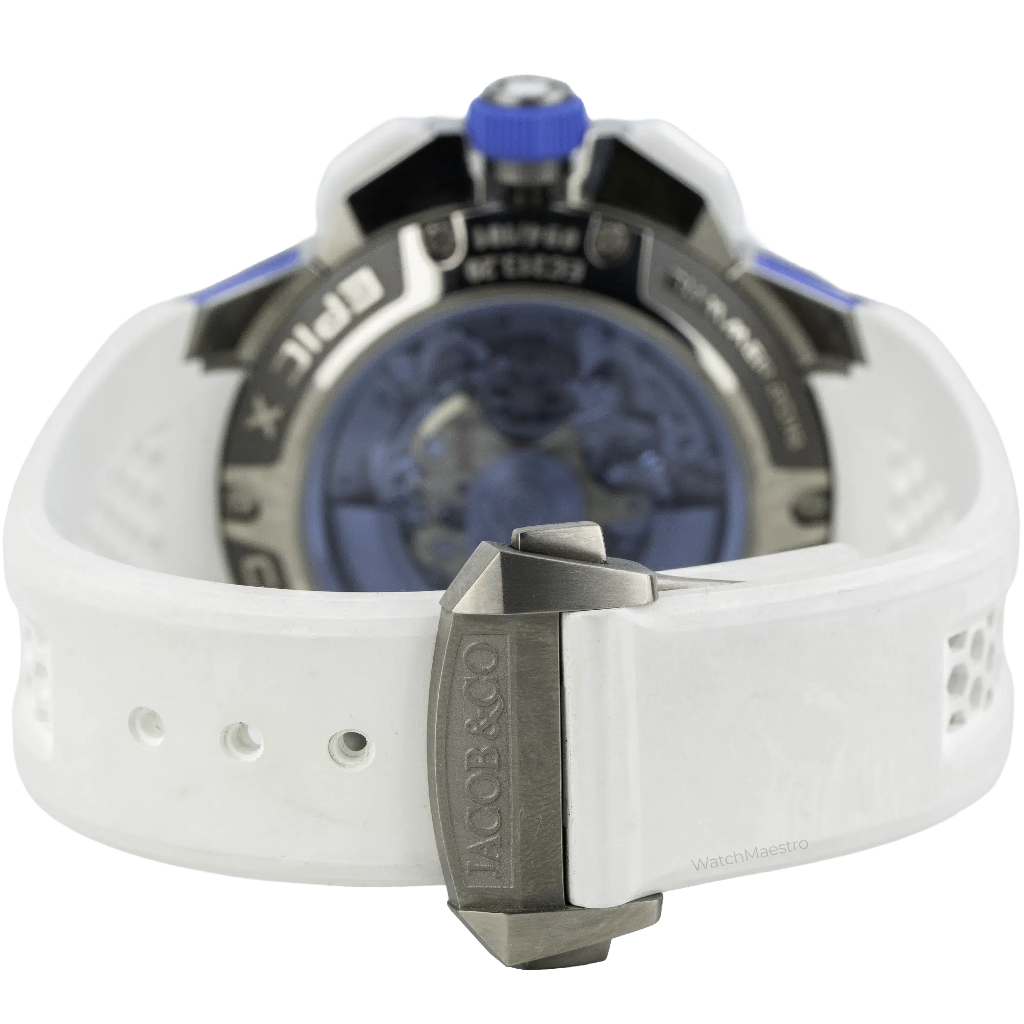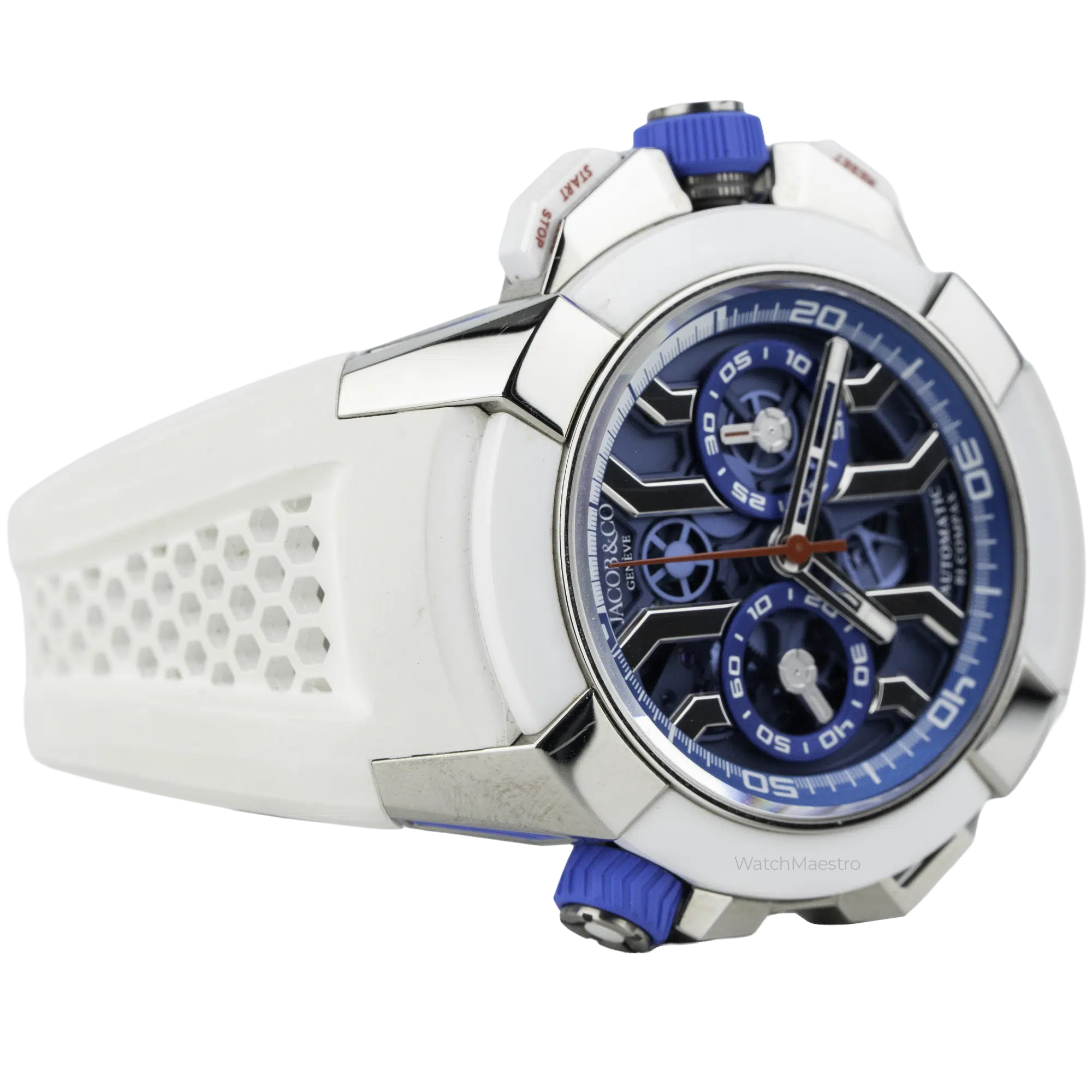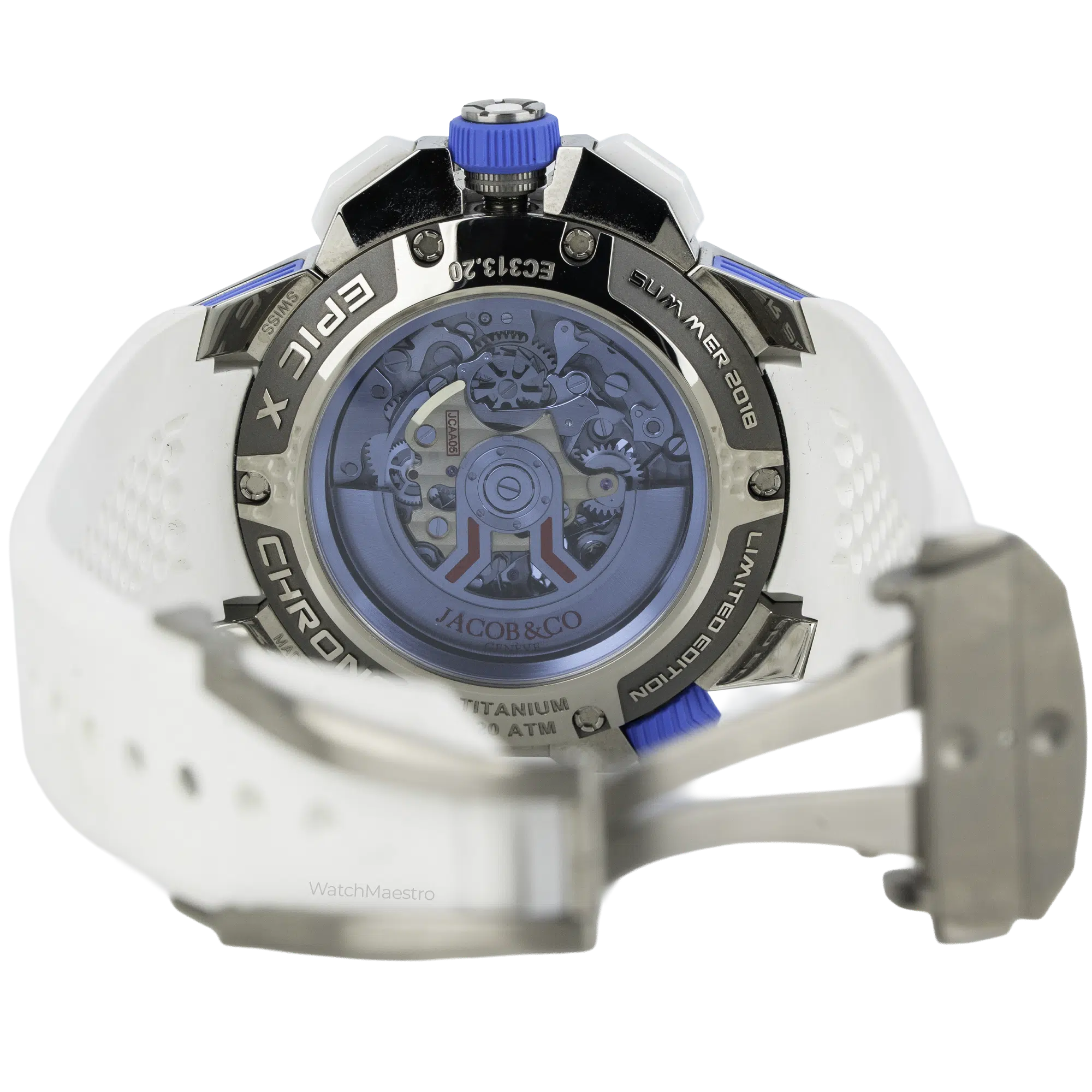 The Jacob & Co. Epic X Chronograph Summer Edition is pure energy on the wrist. Built for bold tastes, its 47mm titanium case pops with tropical accents of blue with a hint of red, a color combo that instantly sets it apart from traditional chronographs. The skeletonized dial reveals the high-beat automatic movement beneath, while the signature X-shaped bridge design anchors the watch’s dynamic layout. It’s loud, it’s playful, and it’s unmistakably Jacob & Co. This 2024 example is pre-owned and comes complete with box and papers.