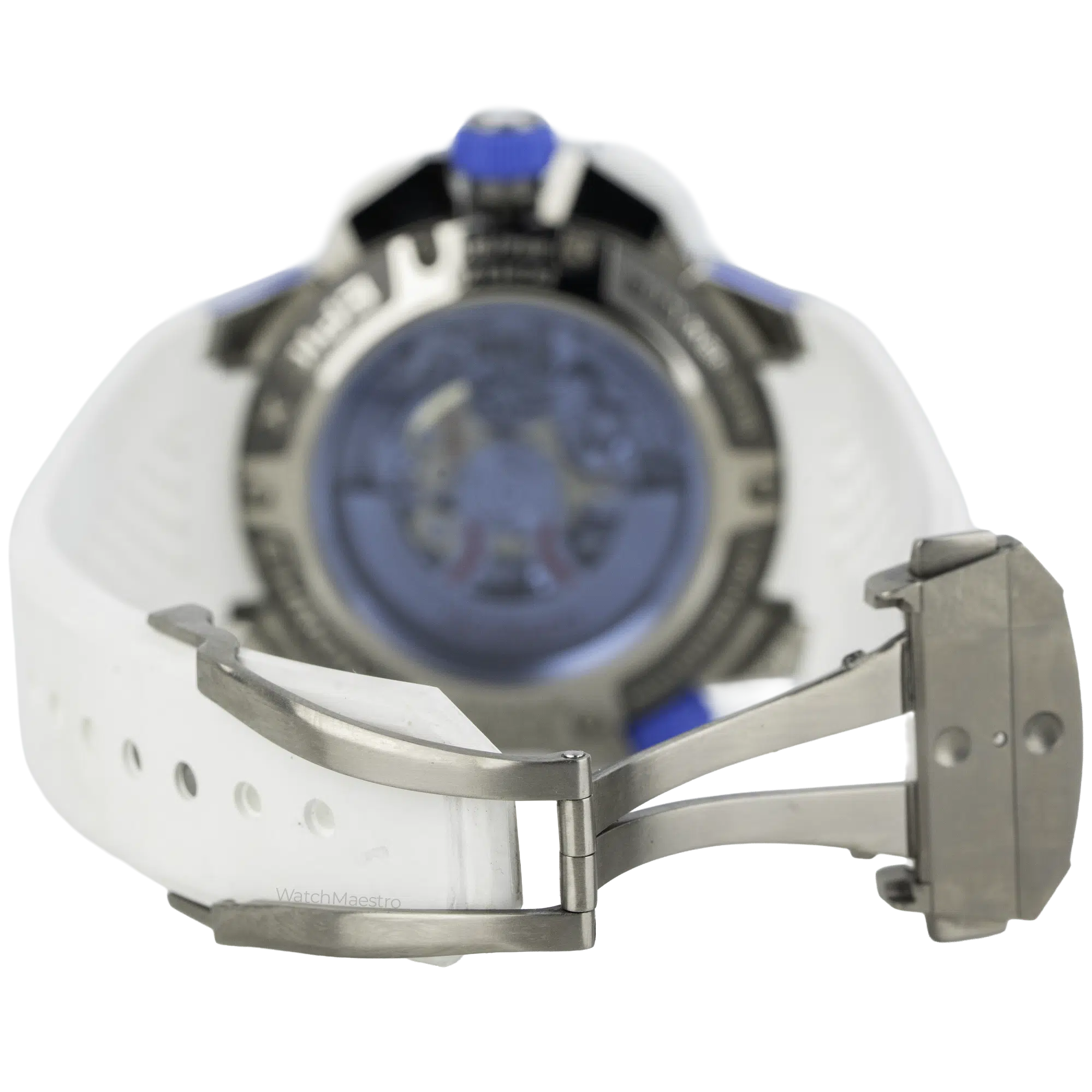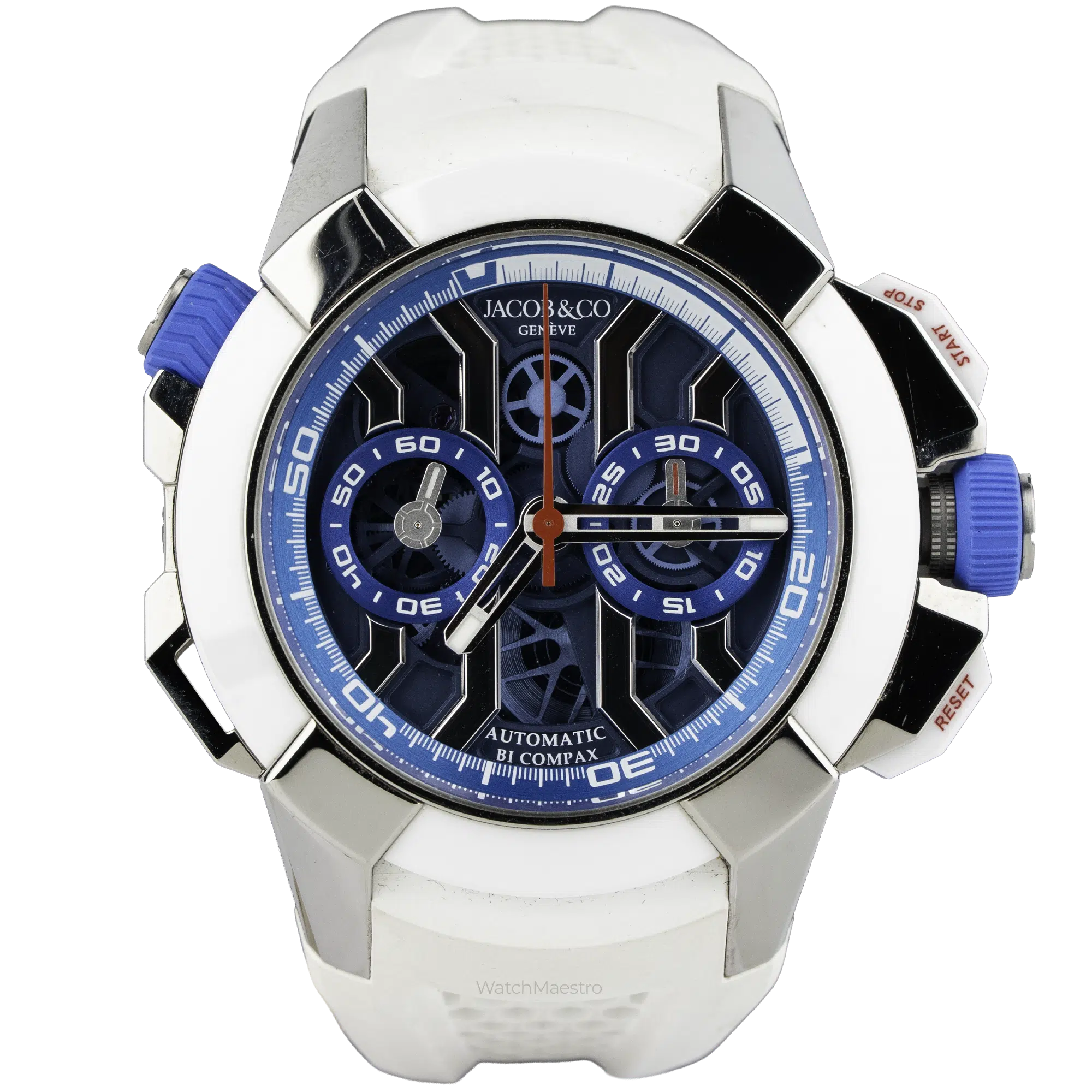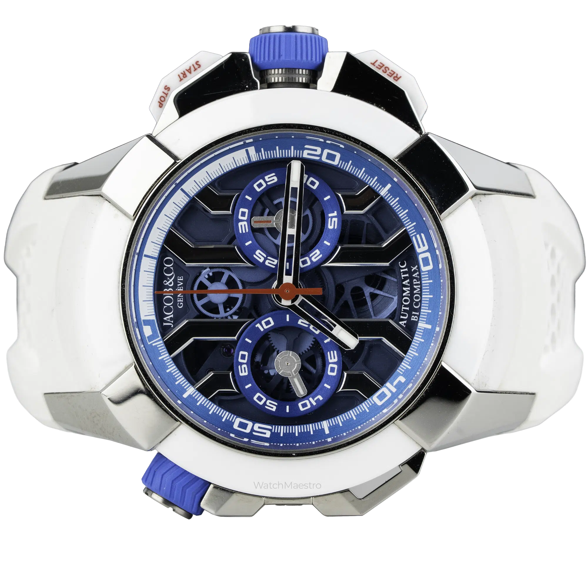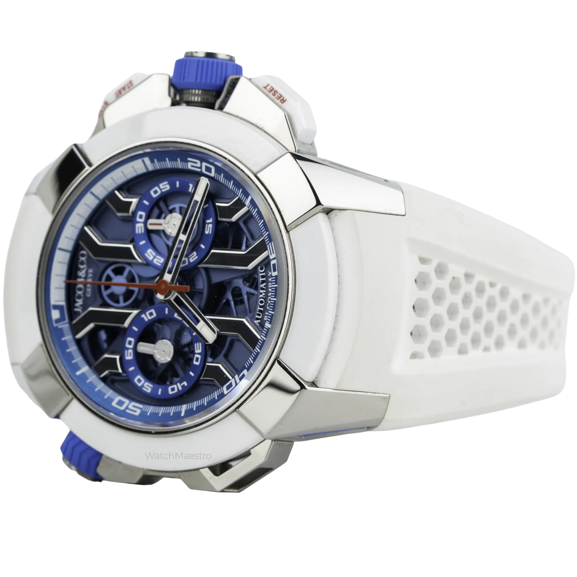 The Jacob & Co. Epic X Chronograph Summer Edition is pure energy on the wrist. Built for bold tastes, its 47mm titanium case pops with tropical accents of blue with a hint of red, a color combo that instantly sets it apart from traditional chronographs. The skeletonized dial reveals the high-beat automatic movement beneath, while the signature X-shaped bridge design anchors the watch’s dynamic layout. It’s loud, it’s playful, and it’s unmistakably Jacob & Co. This 2024 example is pre-owned and comes complete with box and papers.